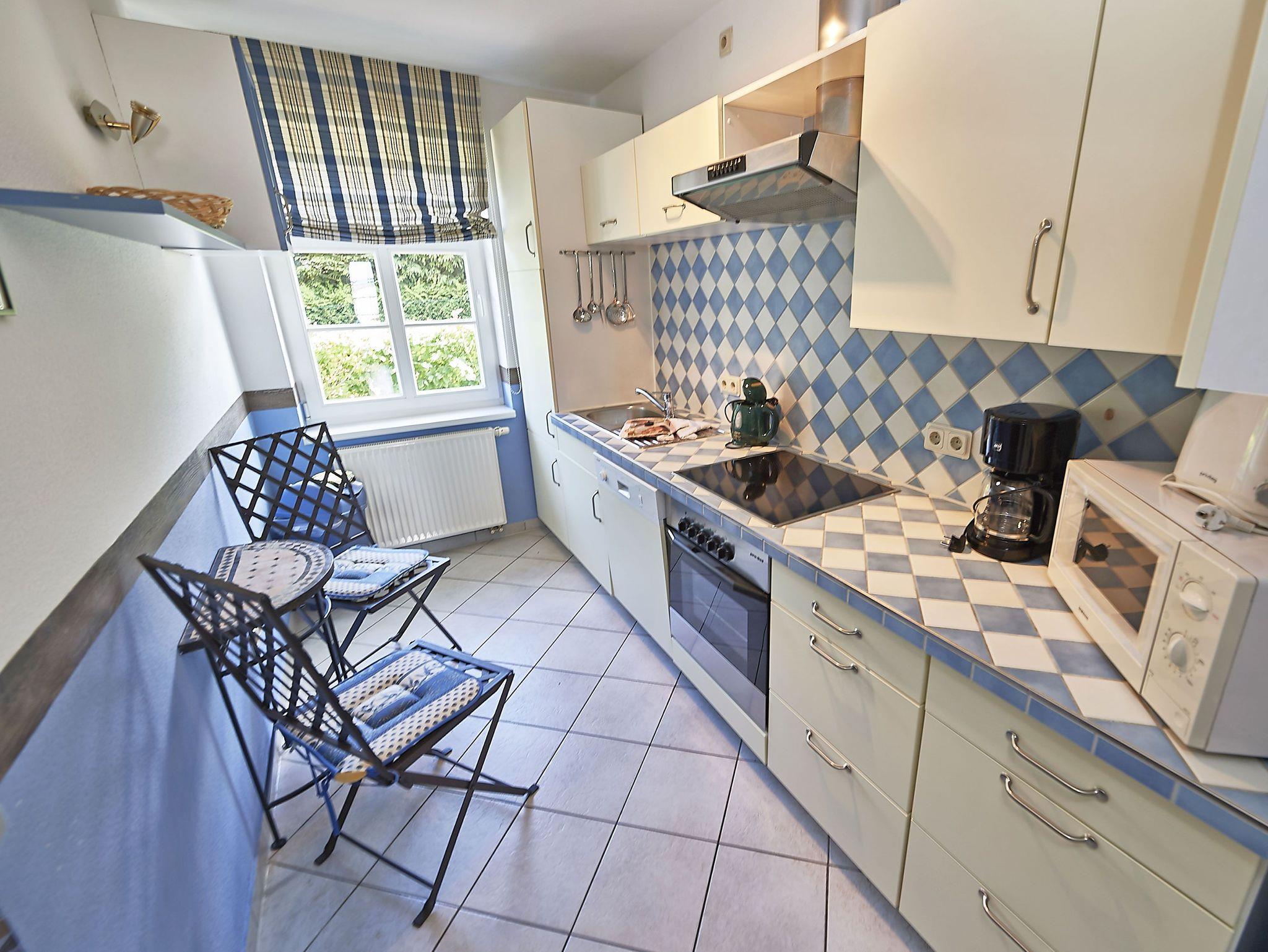 Die separate Küche ist komplett ausgestattet und enthält unter anderem einen Kühlschrank, ein 4-Platten-Cerankochfeld, Backofen, Geschirrspüler, Kaffeemaschine, Toaster, Wasserkocher und diverses Kleininventar. Ein Duschbad und zwei Abstellkammern - eine davon mit Waschmaschine und Trockner zur kostenfreien Nutzung - befinden sich ebenfalls im Erdgeschoss.