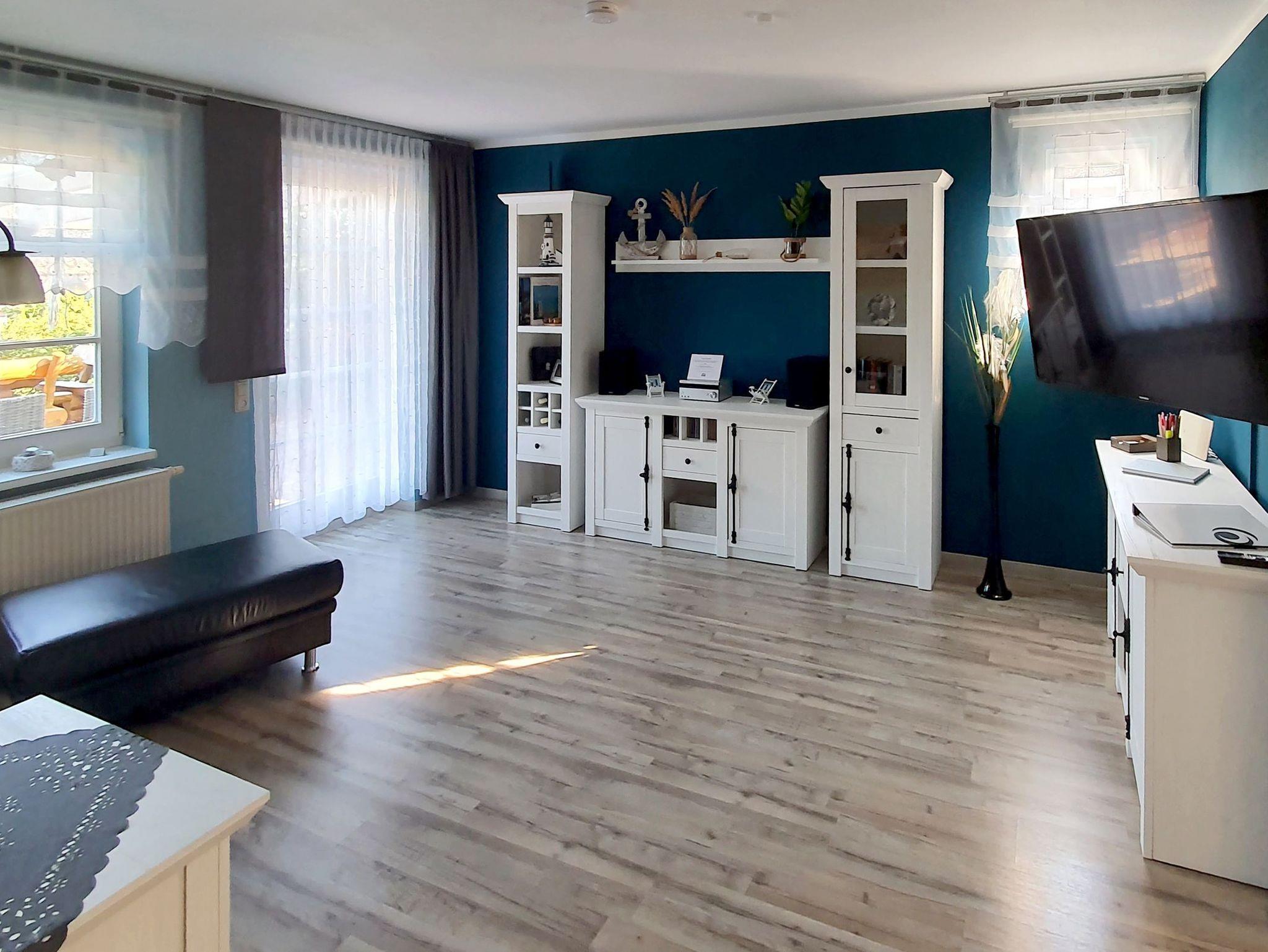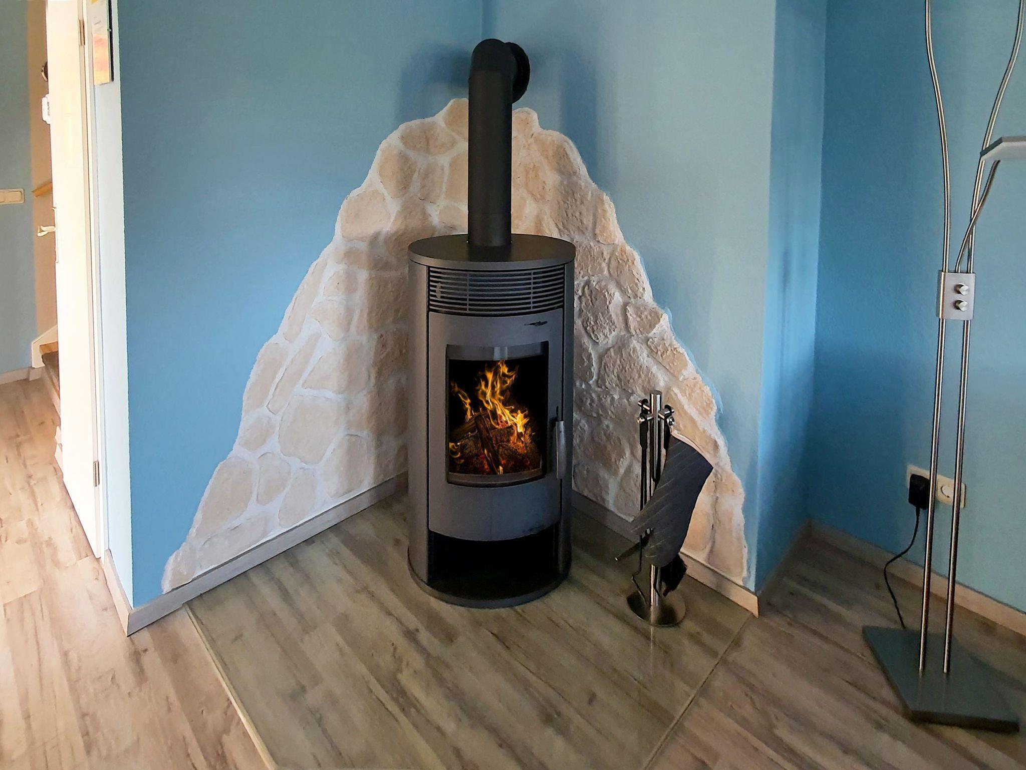 Im Erdgeschoss verfügt das angenehm helle Haus über ein großzügiges Wohnzimmer, das mit einem Couchtisch, einer gemütlichen Couchecke mit einem Kaminofen, einem großformatigen Flachbild-TV sowie einer Stereoanlage mit CD-Player ausgestattet ist. W-LAN ist im gesamten Haus verfügbar. Kaminholz befindet sich im Schuppen (Kasse des Vertrauens) bzw. kann im örtlichen Einzelhandel erworben werden.