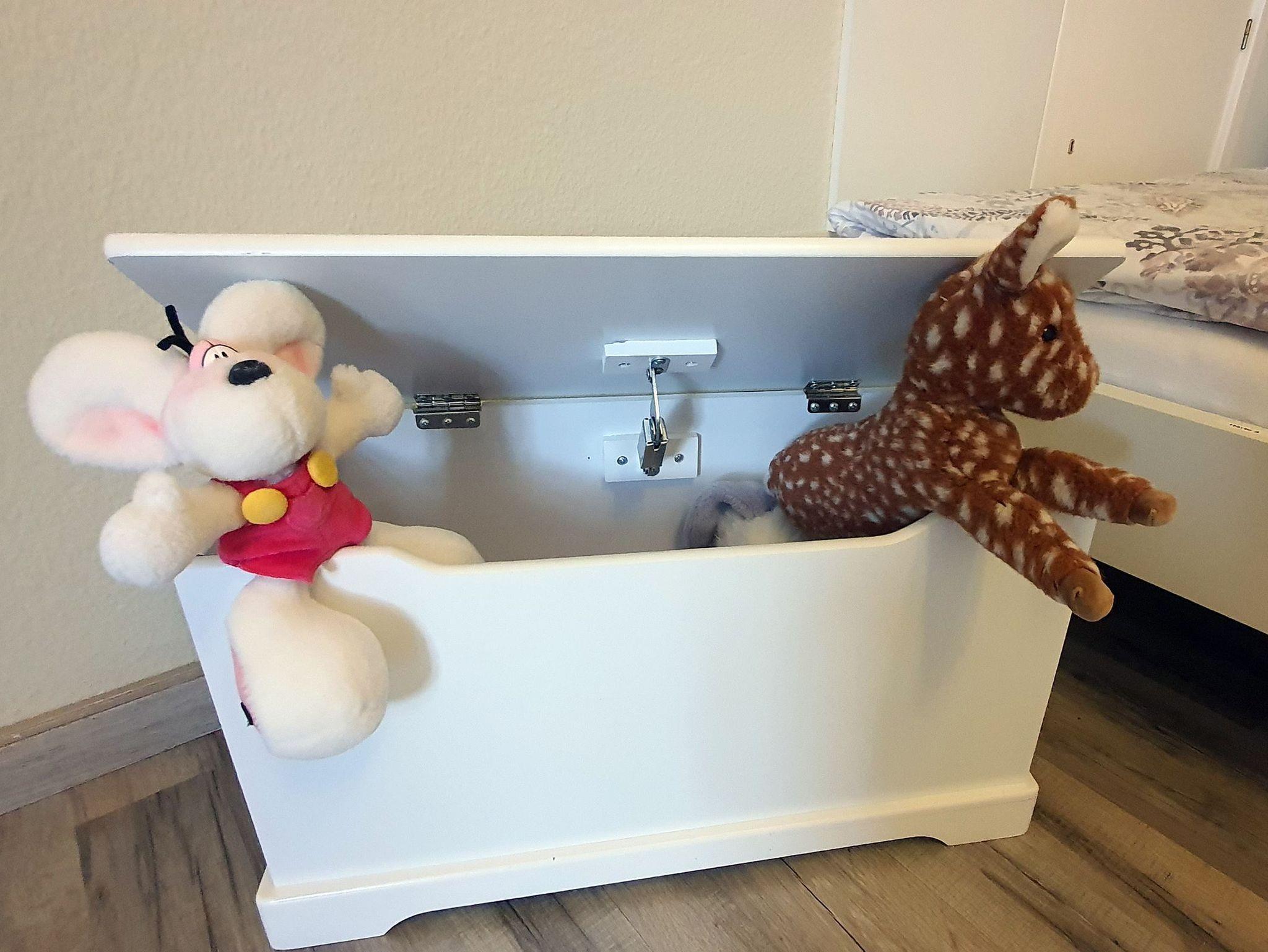 Das zweite Schlafzimmer ist mit zwei gemütlichen Einzelbetten und einer stylischen Sitzgruppe möbliert. Auch hier finden Sie einen Flachbild-TV mit DVD-Player incl. einer Auswahl an DVDs, dazu eine Spielkiste für die kleinen Gäste. Beide Schlafzimmer haben einen Insektenschutz. Ein Kinderreisebett, ein Kinderhochstuhl sowie Bügelutensilien stehen Ihnen während Ihres Aufenthaltes kostenfrei zur Verfügung. Falls benötigt, sind zusätzliche Decken und Kopfkissen ebenfalls vorhanden.