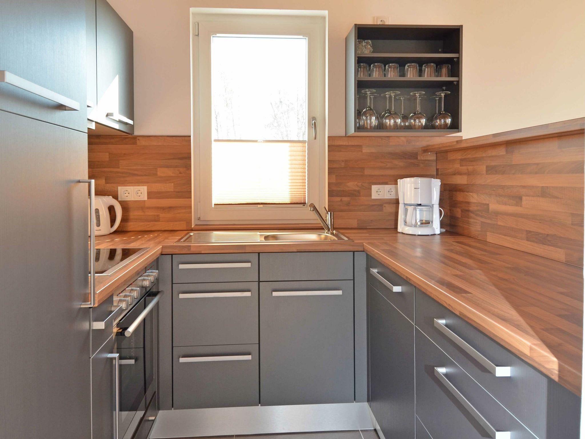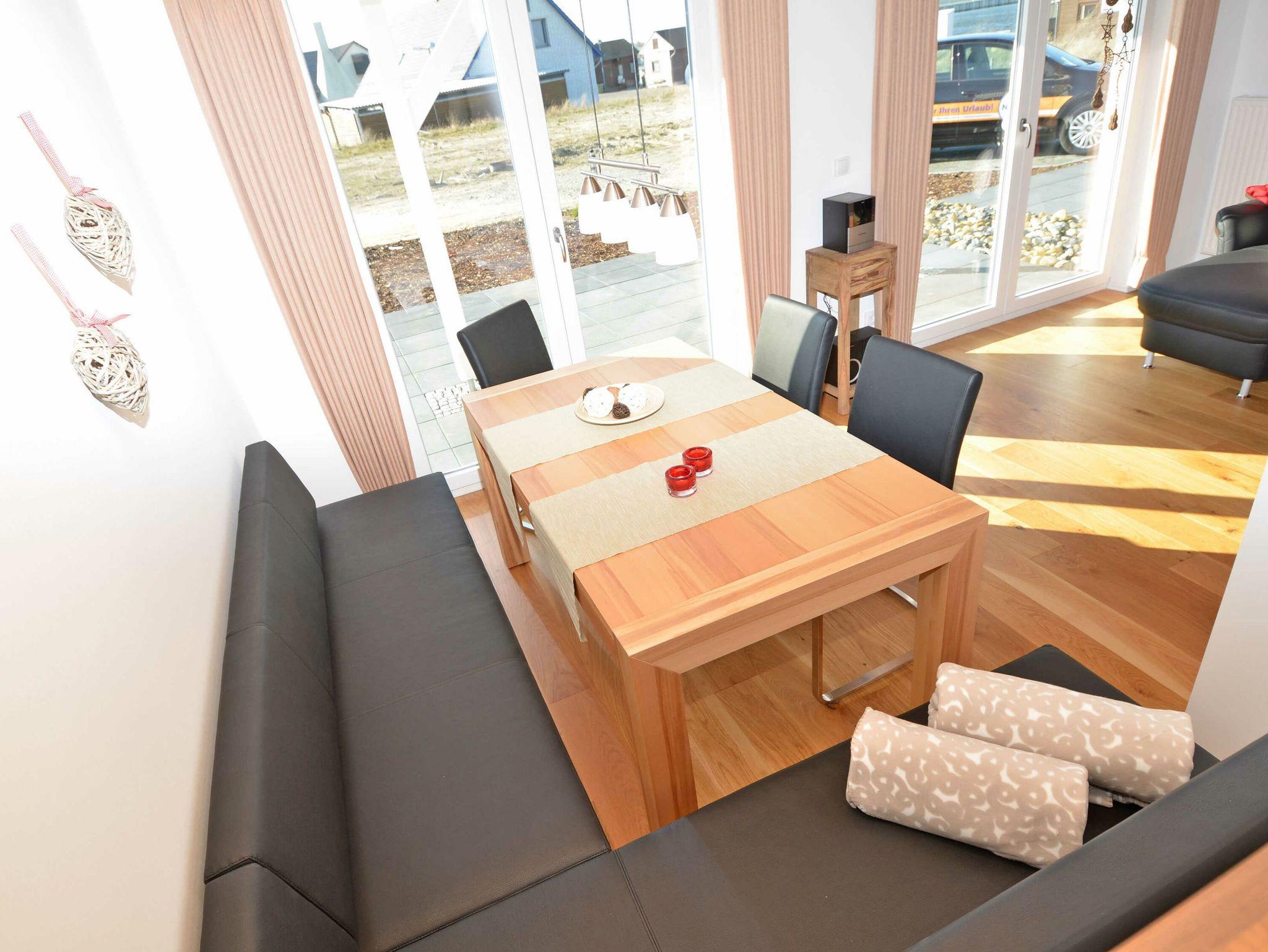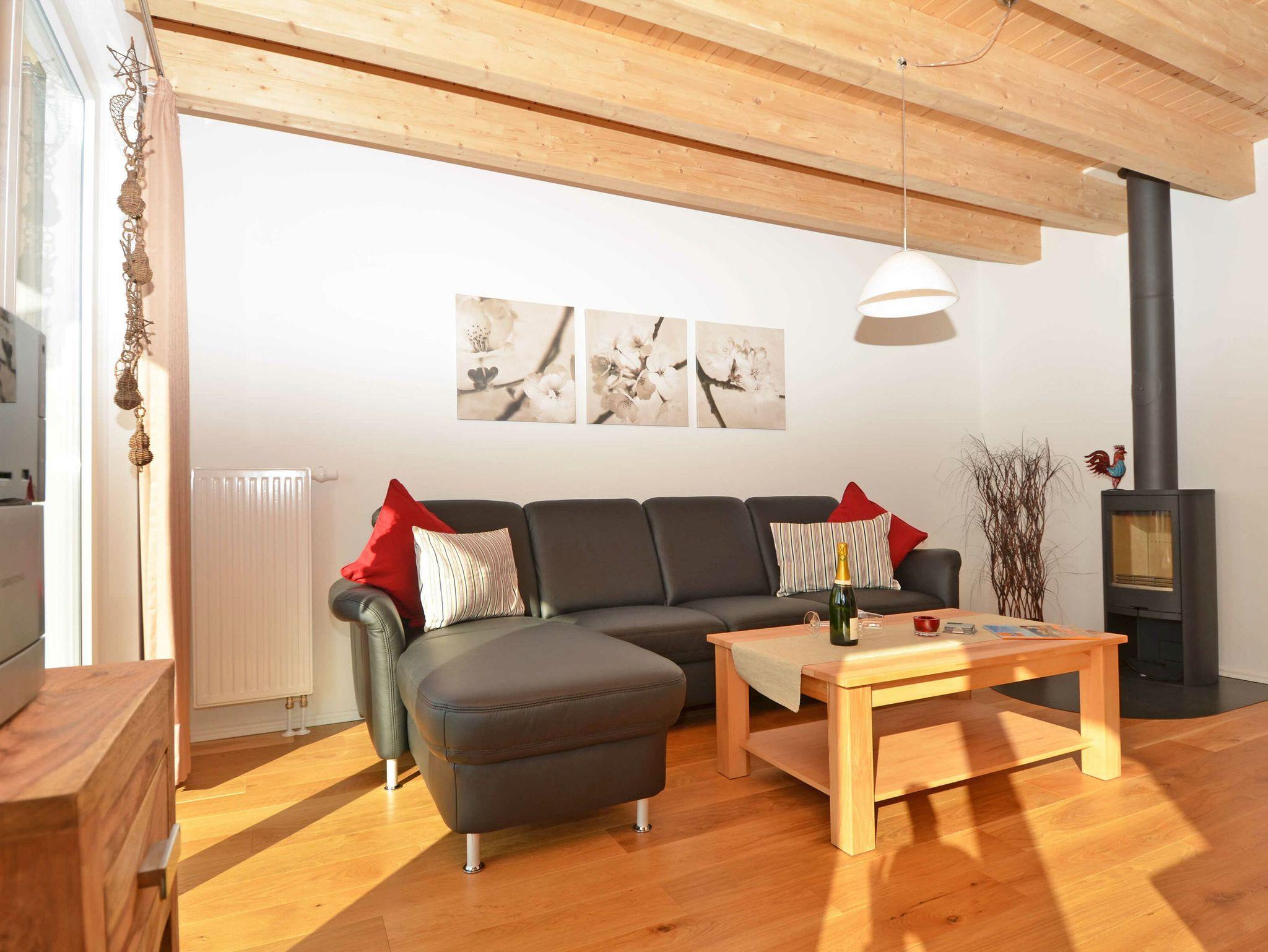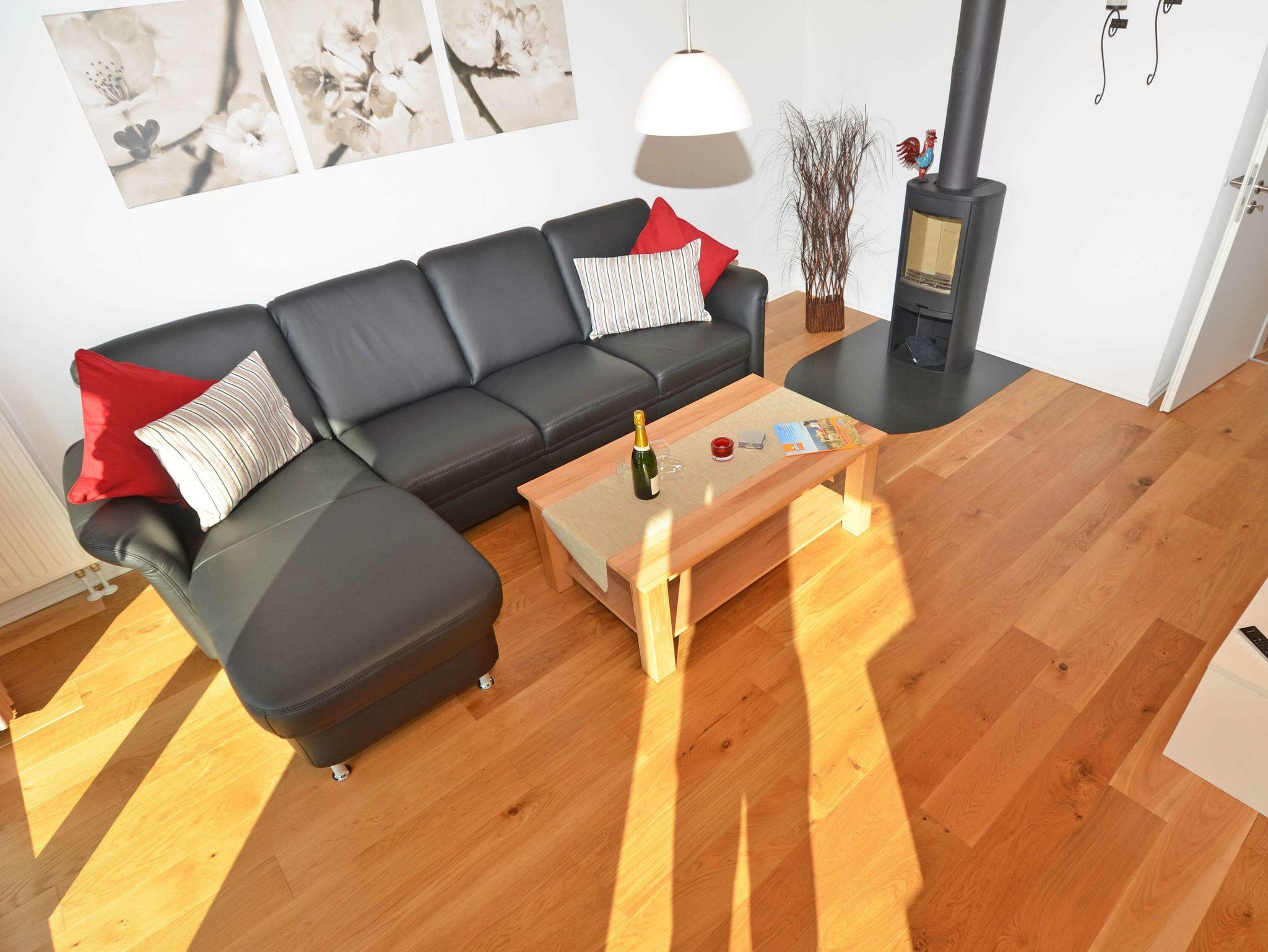 Im Erdgeschoß befindet sich das große Wohnzimmer mit der optisch vom Wohnbereich getrennten Einbauküche. Im Wohn-/Essbereich gibt es einen großen Esstisch „in der Koje“ für 8 Personen, eine großzügige Couchecke mit einem Kaminofen (das Holz ist bitte selbst mitzubringen), einen Flachbild-TV mit DVD-Player und eine Stereoanlage mit CD-Player.