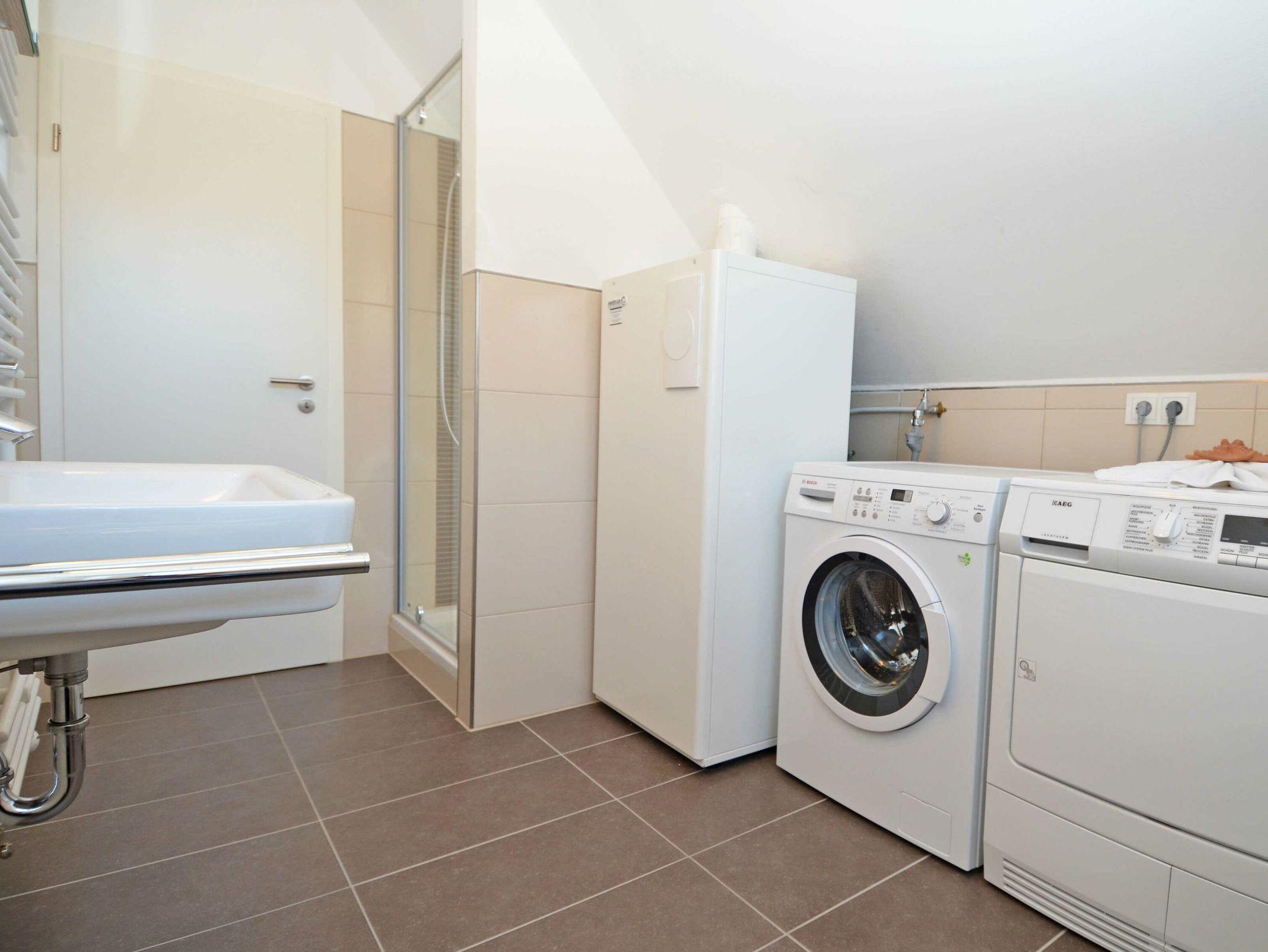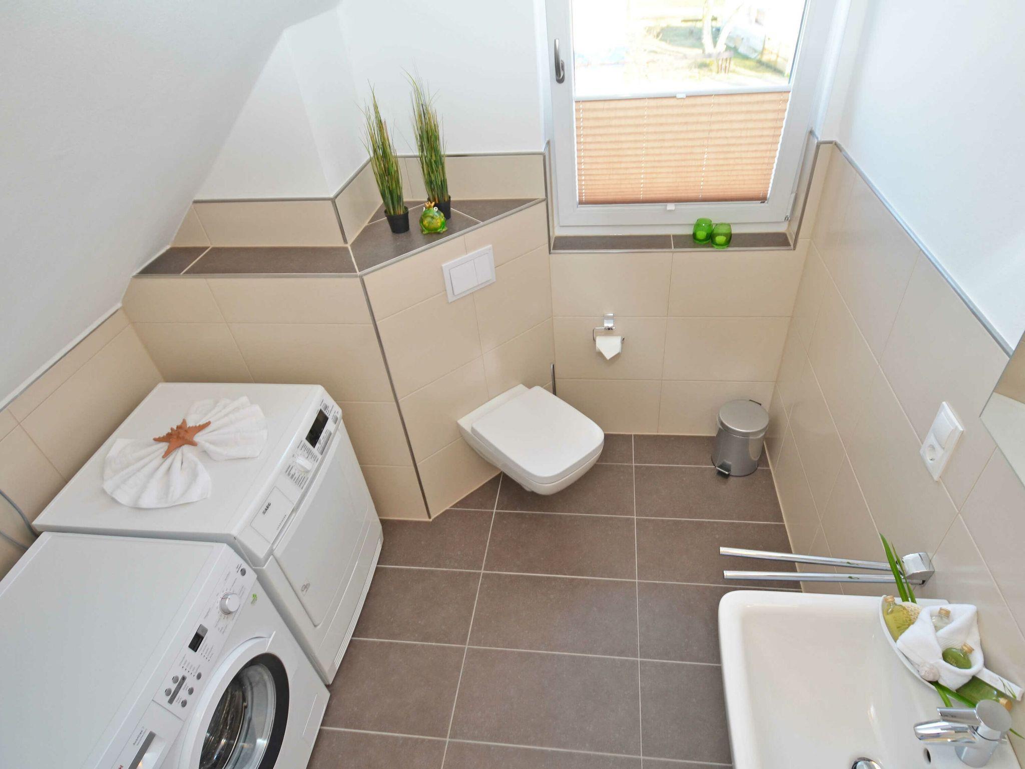 Im Obergeschoss unter gemütlichen Dachschrägen befinden sich die weiteren drei Schlafzimmer sowie das zweite Bad mit Dusche, Waschmaschine und einem Trockner.