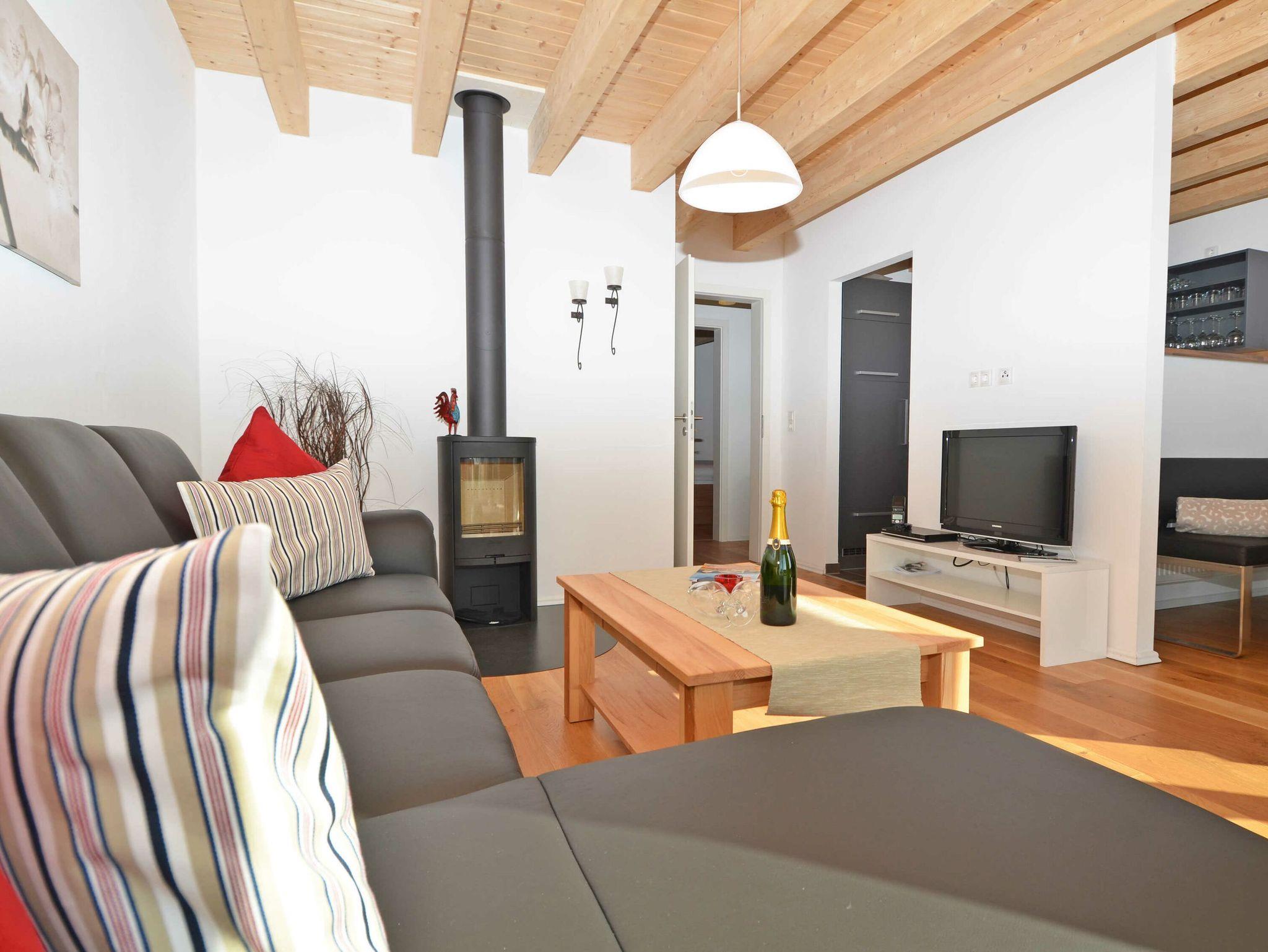 Im Erdgeschoß befindet sich das große Wohnzimmer mit der optisch vom Wohnbereich getrennten Einbauküche. Im Wohn-/Essbereich gibt es einen großen Esstisch ?in der Koje? für 8 Personen, eine großzügige Couchecke mit einem Kaminofen (das Holz ist bitte selbst mitzubringen), einen Flachbild-TV mit DVD-Player und eine Stereoanlage mit CD-Player.