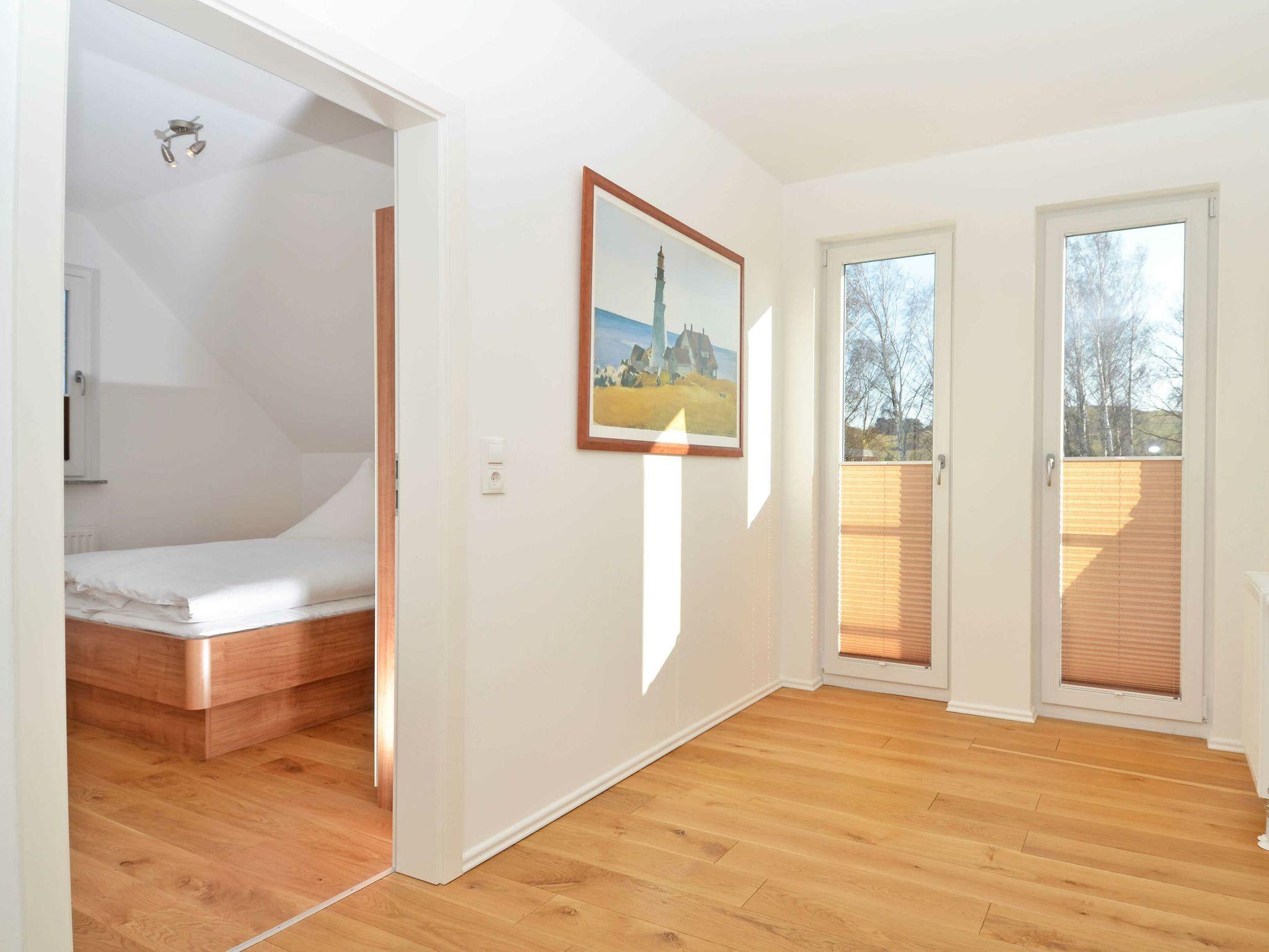 Das rechte Nichtraucher-Ferienhaus „Kojenhus“ hat ca. 130 m² Wohnfläche über zwei Ebenen verteilt mit 4 Schlafzimmern und einem ganz besonderen Wohnambiente. Es verfügt über eine möblierte Terrasse und einen kleinen Balkon zur Nord-West-Seite mit einem schönen Blick auf das Boddengewässer der Hagenschen Wieck und den Hafen von Gager. Die Balkon- bzw. Terrassenmöbel stehen saisonal - in der Regel von Mai bis Ende September - zur Verfügung.