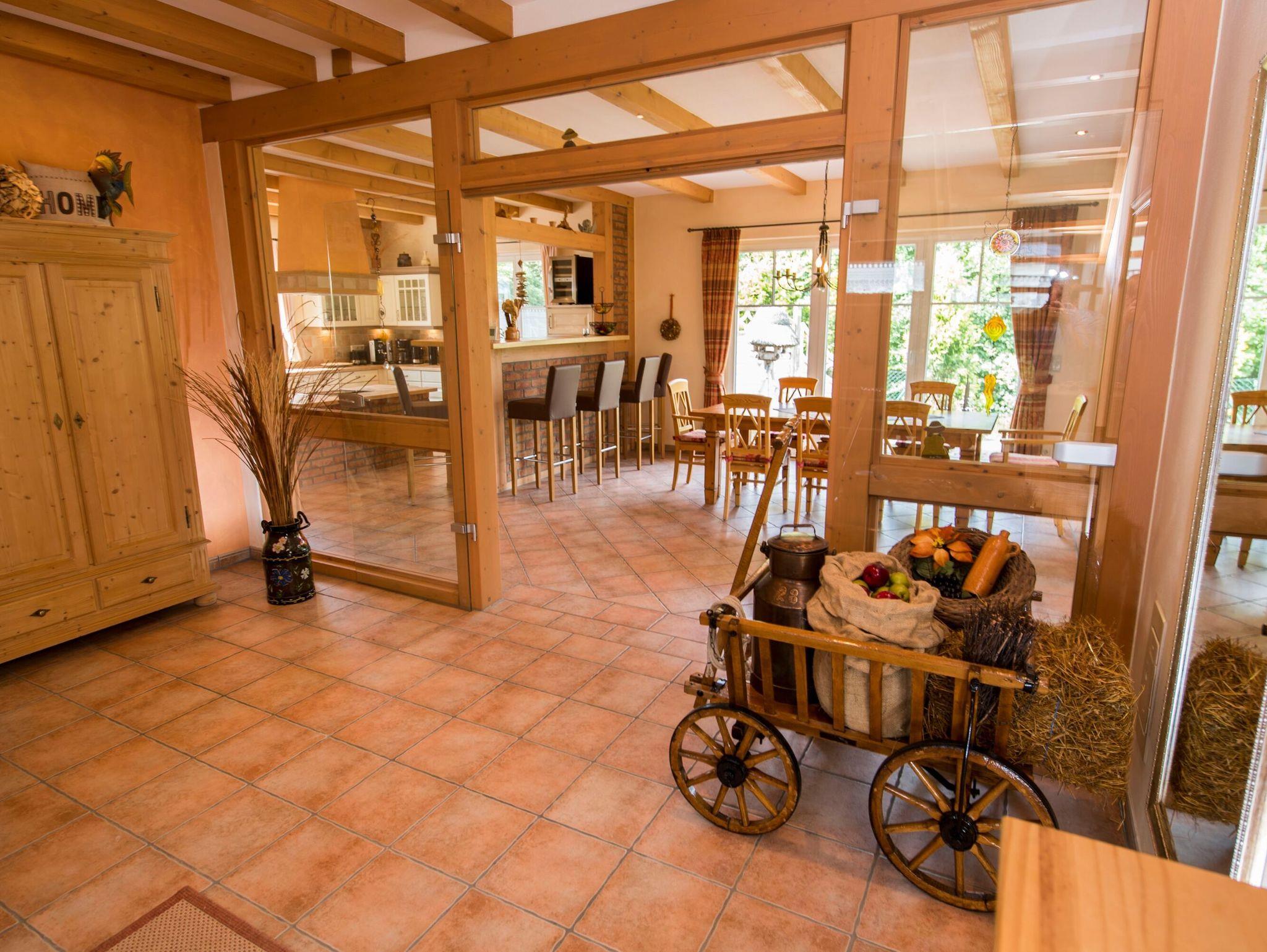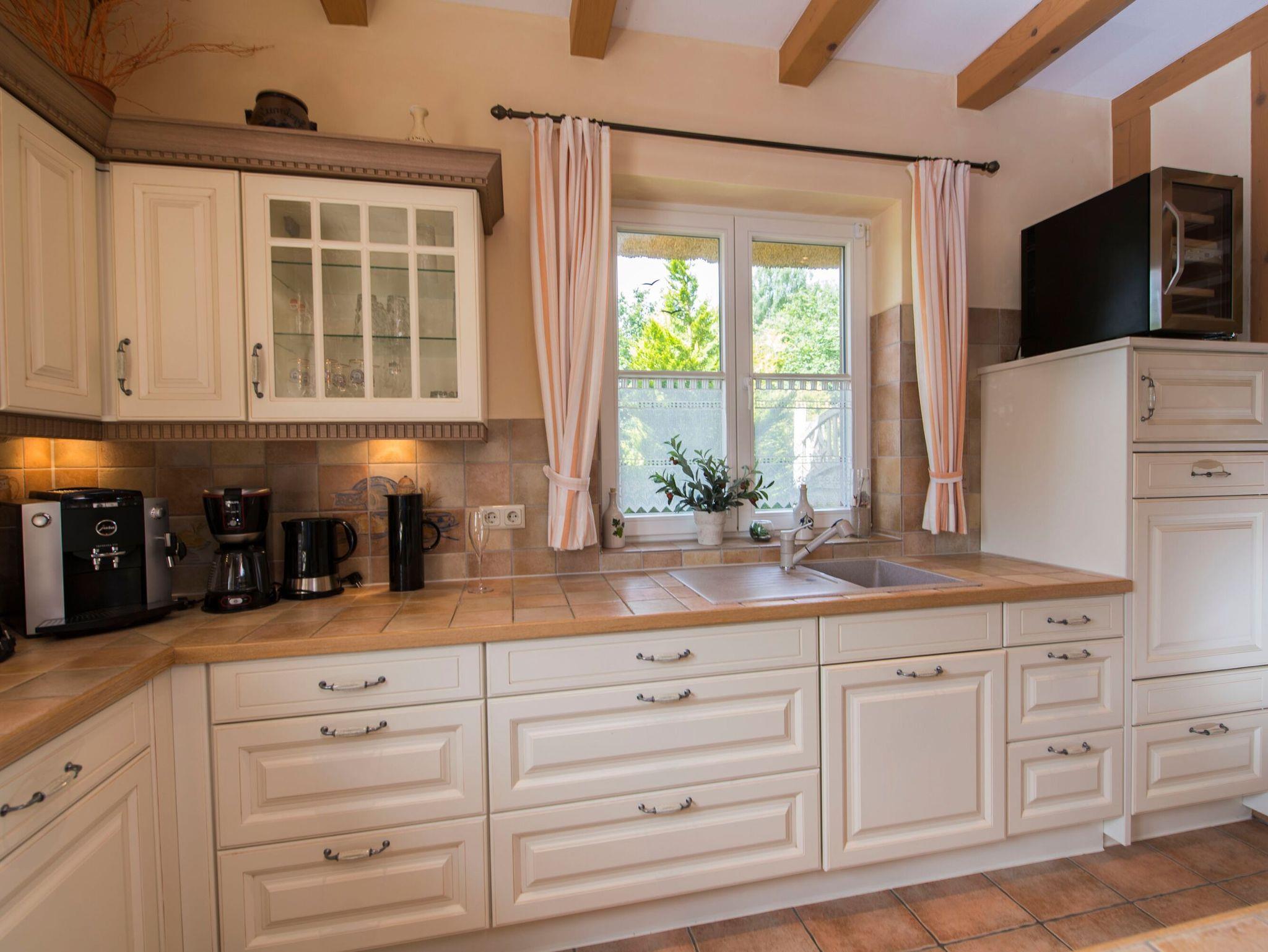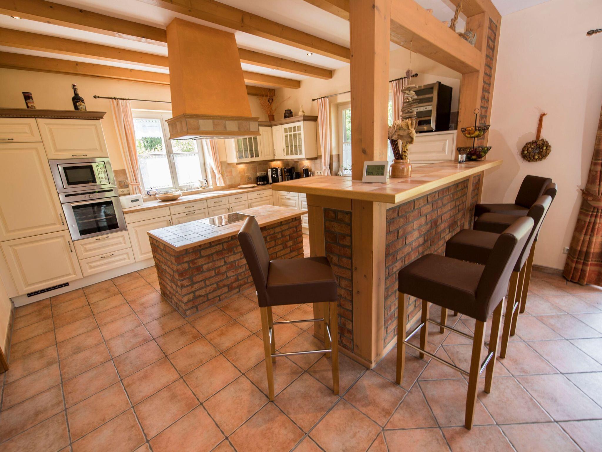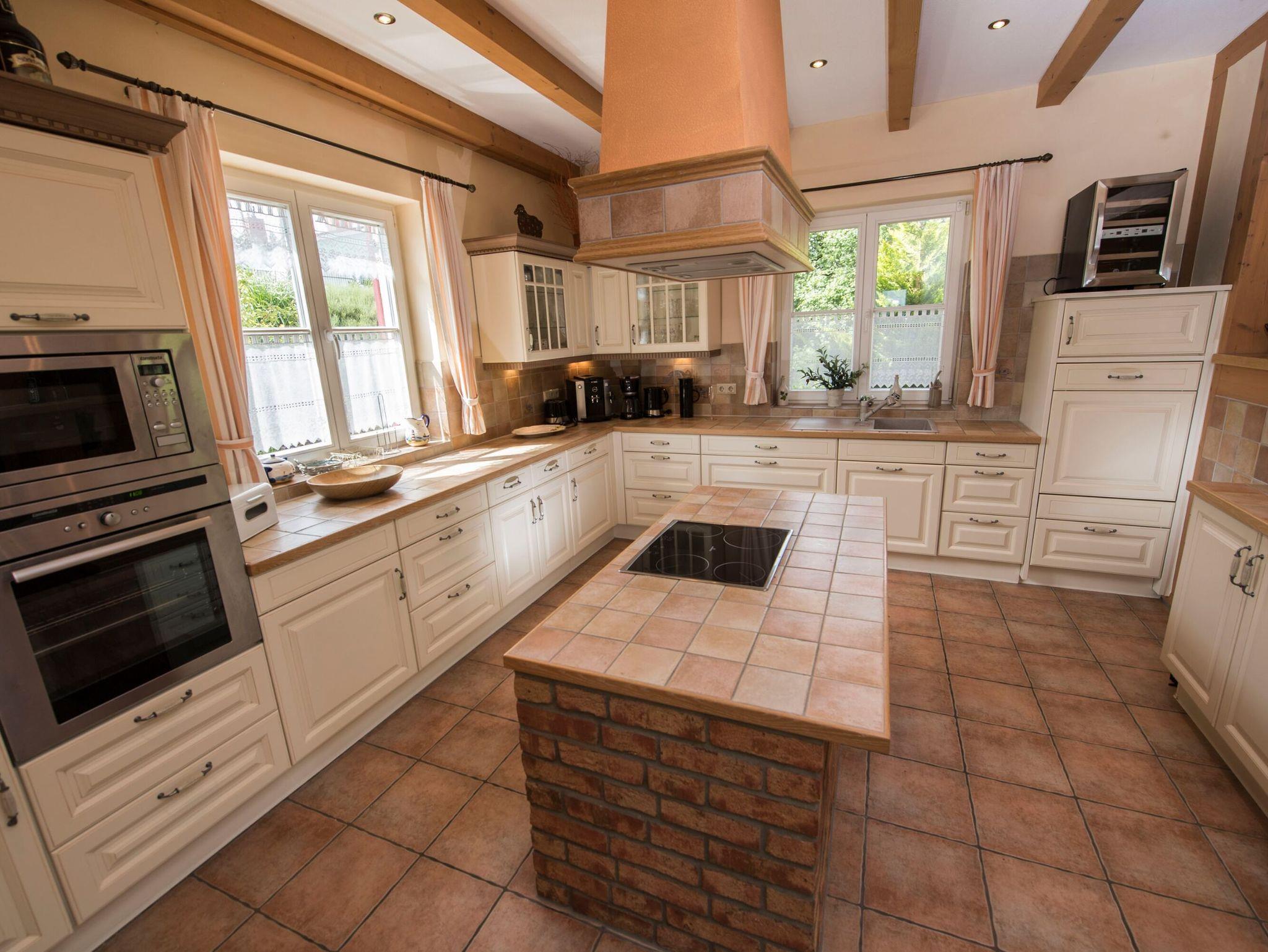 Die Einrichtung im Landhausstil wird auch in der offenen Küche weitergeführt. Diese ist durch eine halbhohe Fachwerkbalkenwand dezent vom Essbereich getrennt. In der erstklassig ausgestatteten Küche mit einer Kochinsel mit 4-Platten-Cerankochfeld und viel Arbeitsfläche finden Sie auch einen Jura-Kaffeeautomaten mit Kaffeebohnen für den 1. Urlaubsmorgen, einen Backofen, eine Geschirrspülmaschine, eine Mikrowelle, Barhocker, einen Weinkühlschrank sowie diverses Kleininventar, das die Küchenausstattung komplettiert. Direkt an die Küche angeschlossen befindet sich der Hauswirtschaftsraum mit Waschmaschine, Trockner, Bügelbrett und Bügeleisen.