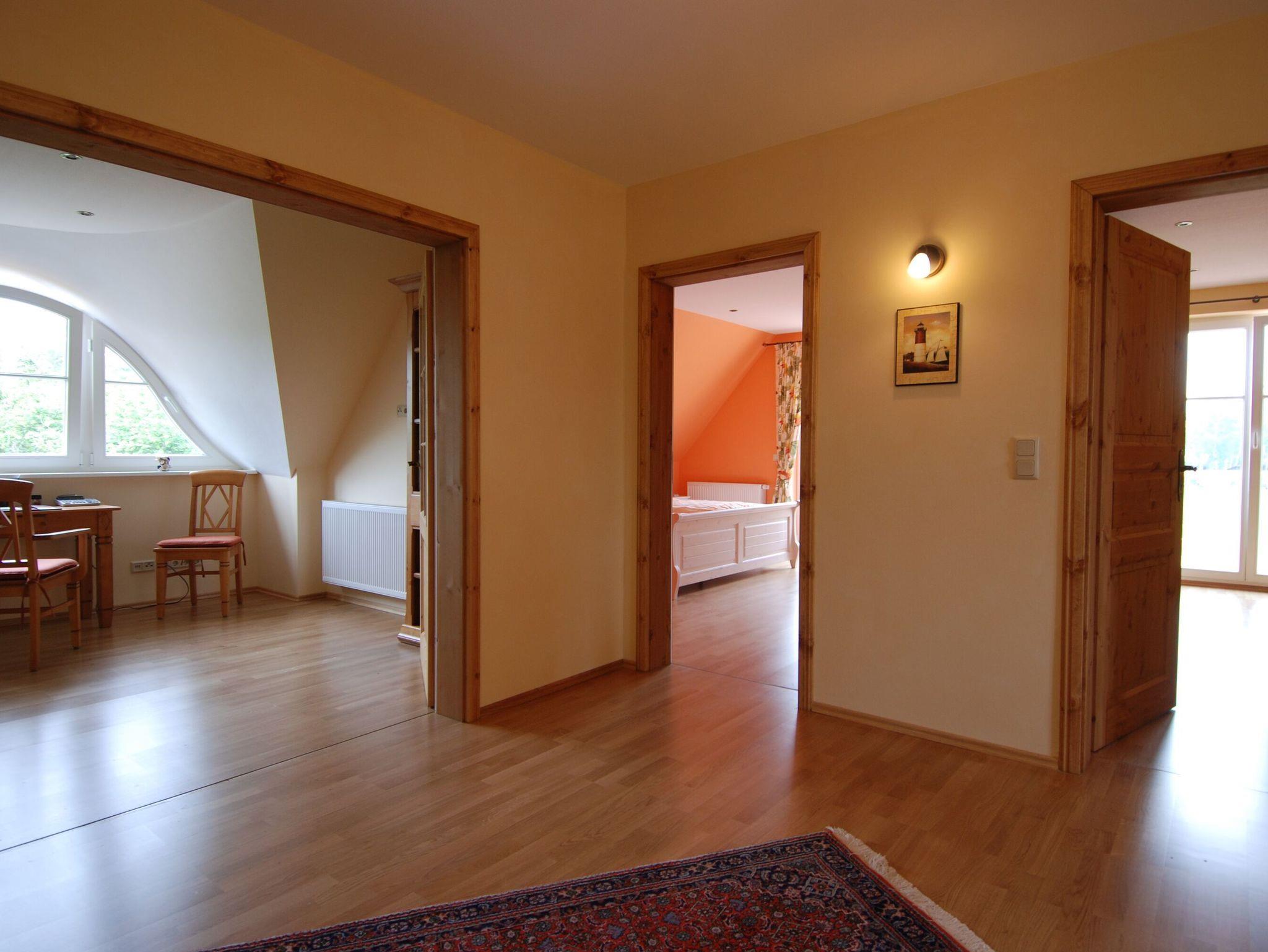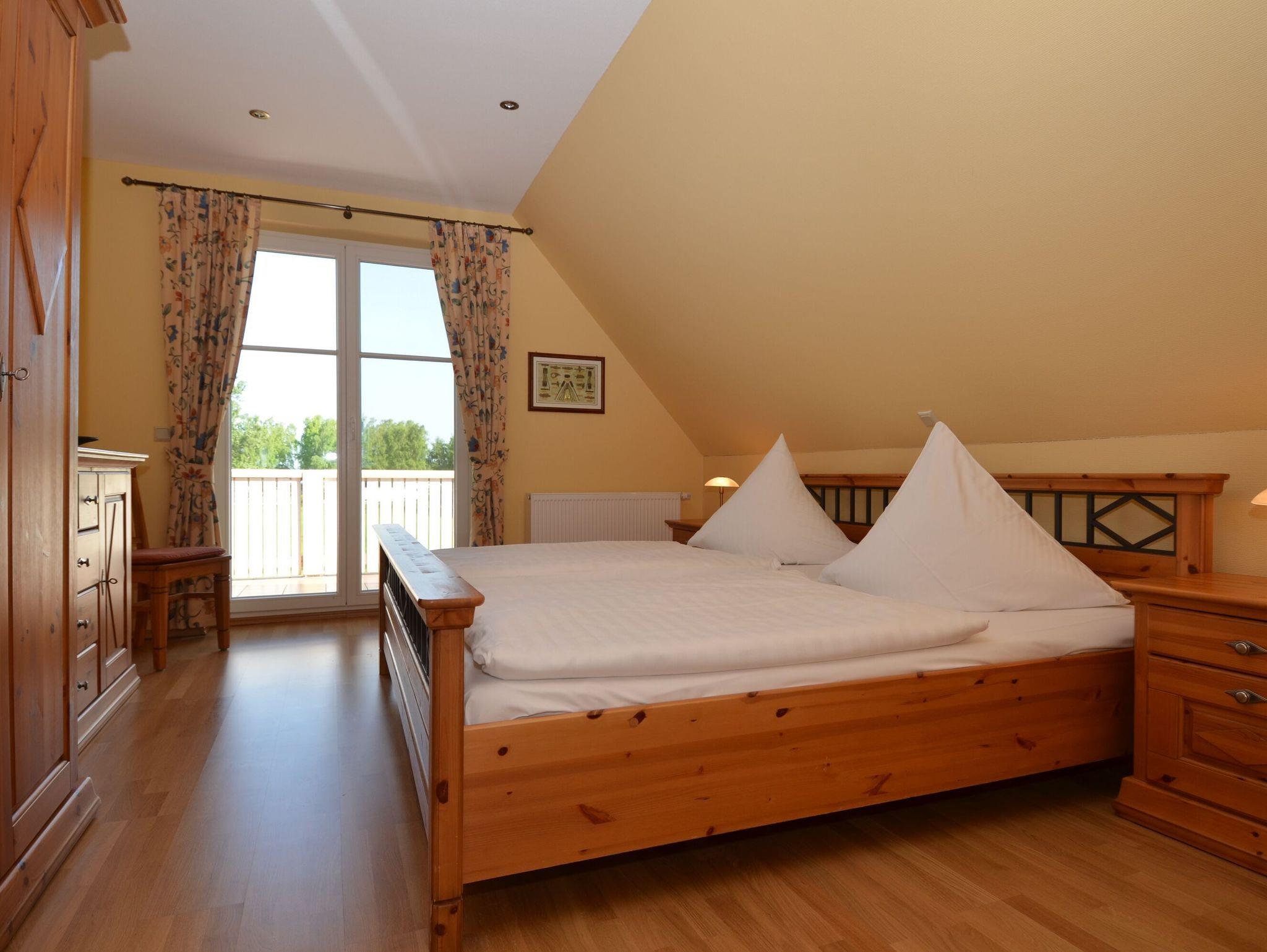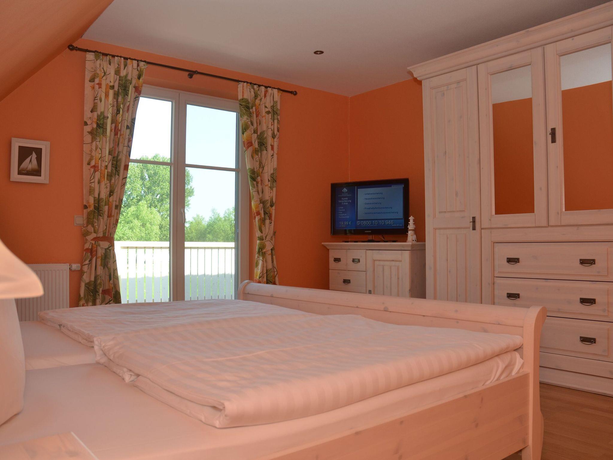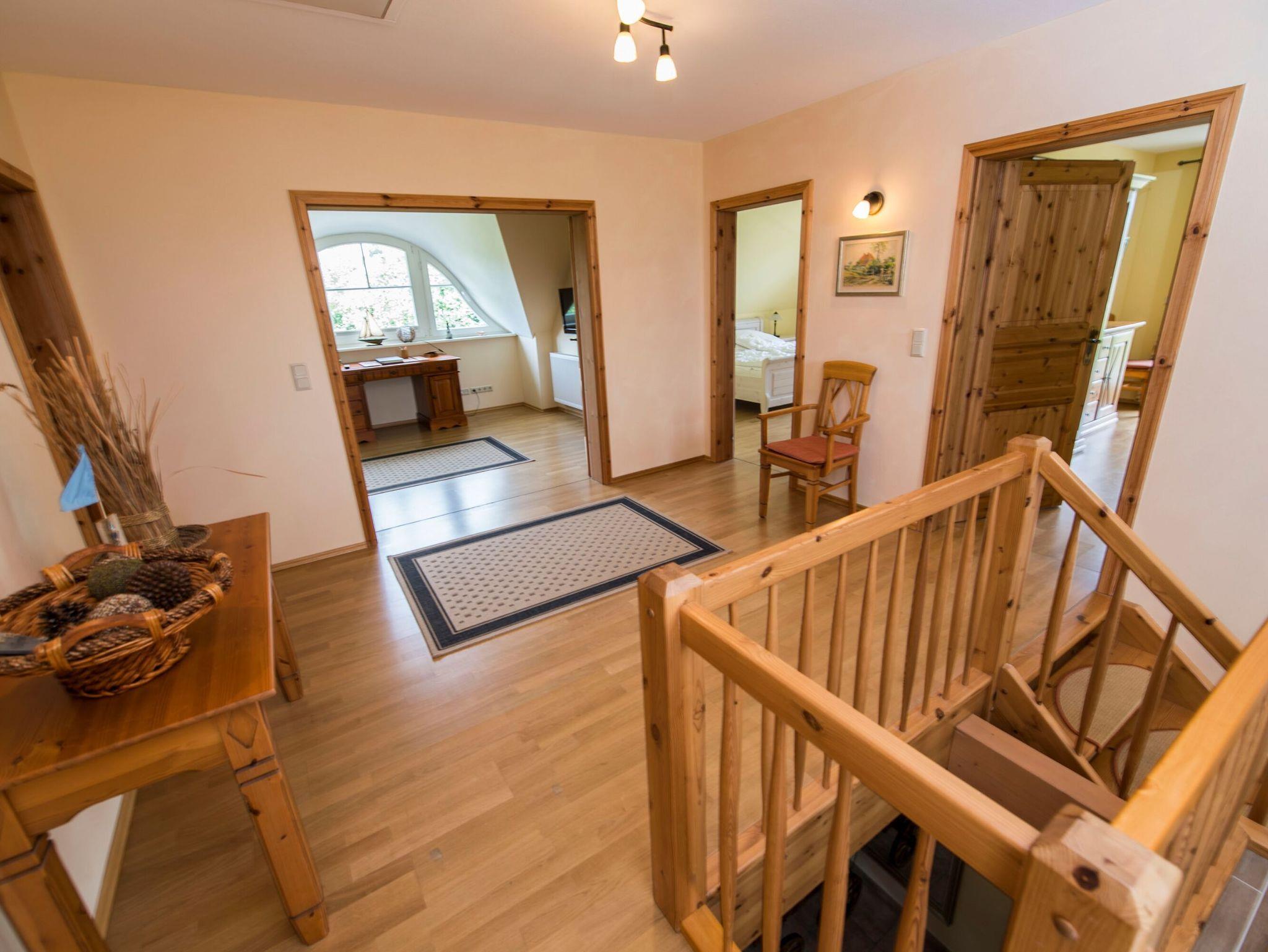 In dem mit Parkett versehenen Obergeschoss finden Sie drei Schlafzimmer mit je einem Doppelbett (mit jeweils einer Matratze im Härtegrad 2 und 3) und je einen Fernseher. Zwei der Schlafzimmer haben einen Zugang zum Balkon mit wunderschönem Boddenblick. Ein helles Büro mit Schreibtisch, einer kleinen Bibliothek und einer Couch für gemütliche Stunden vor einem weiteren TV steht im OG ebenfalls zur Verfügung. Es gibt desweiteren einen W-LAN-Internetanschluss und ein Telefon (nur Gespräche ins dt. Festnetz) zur kostenfreien Nutzung.