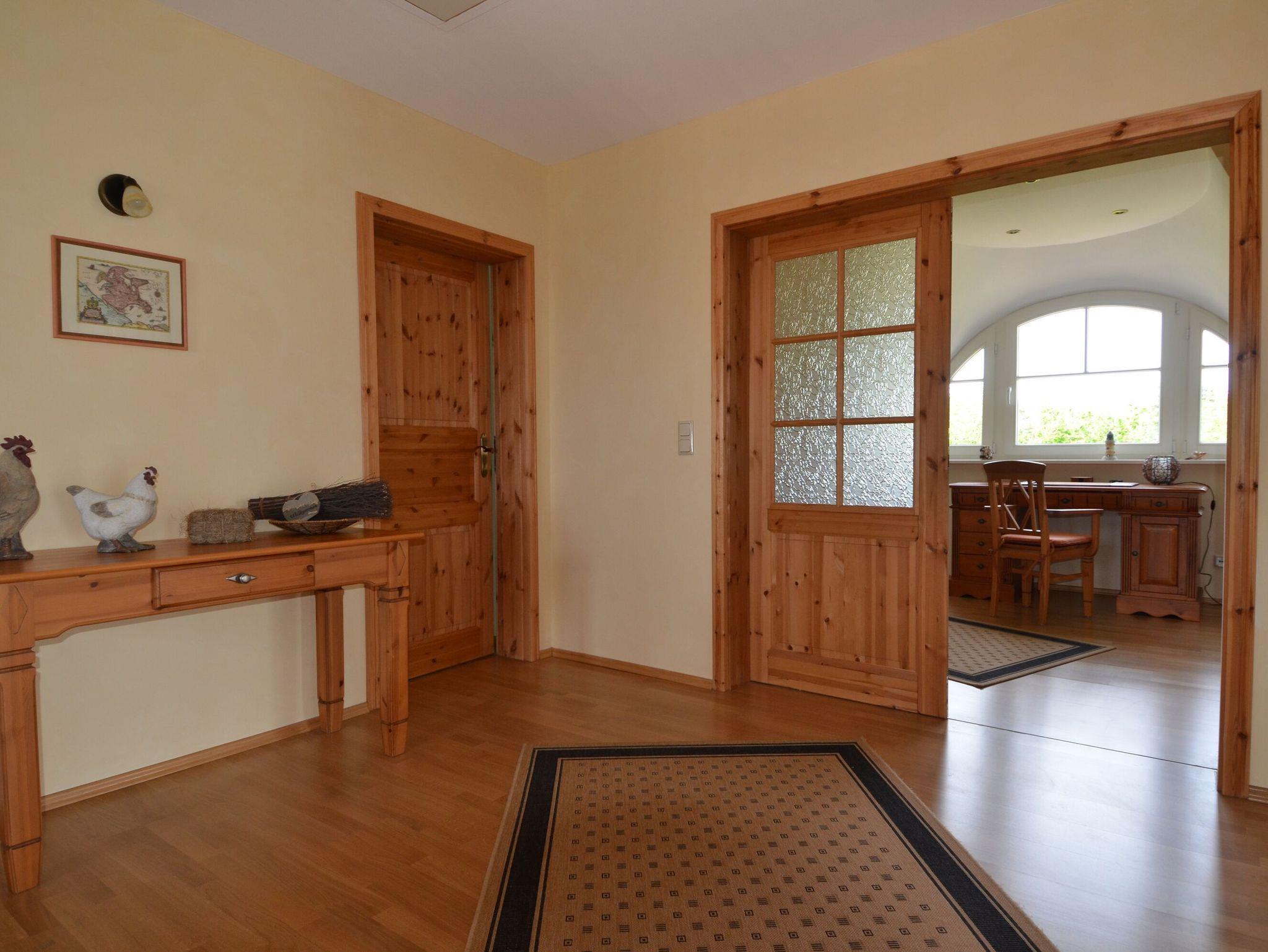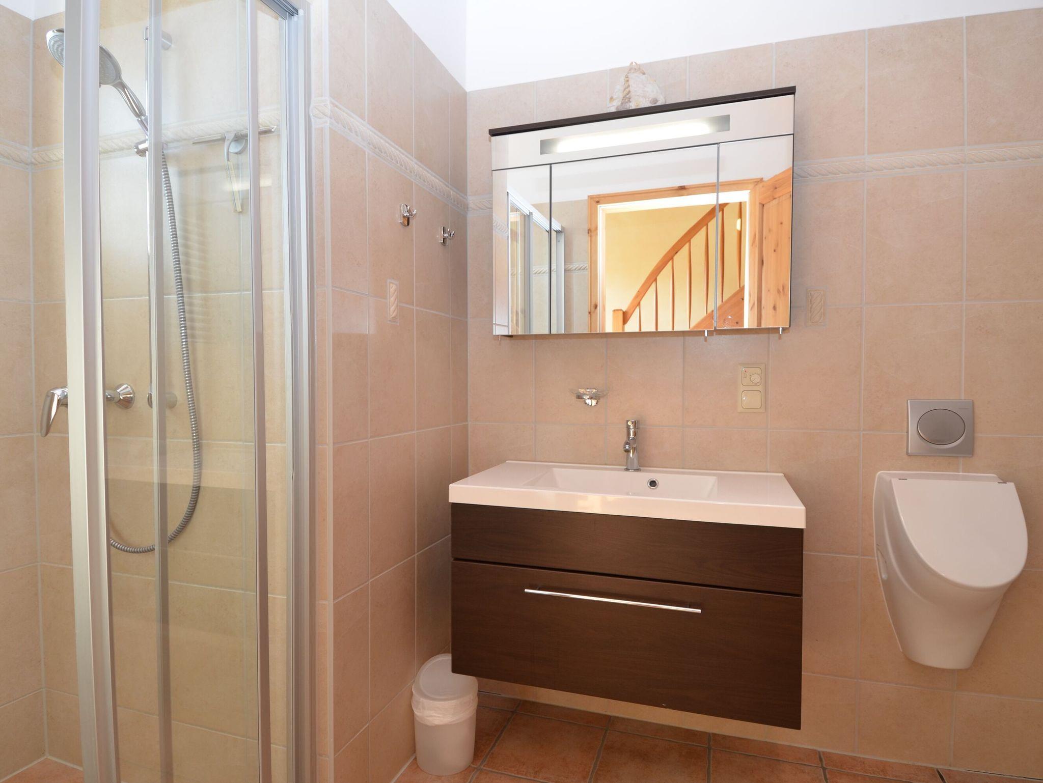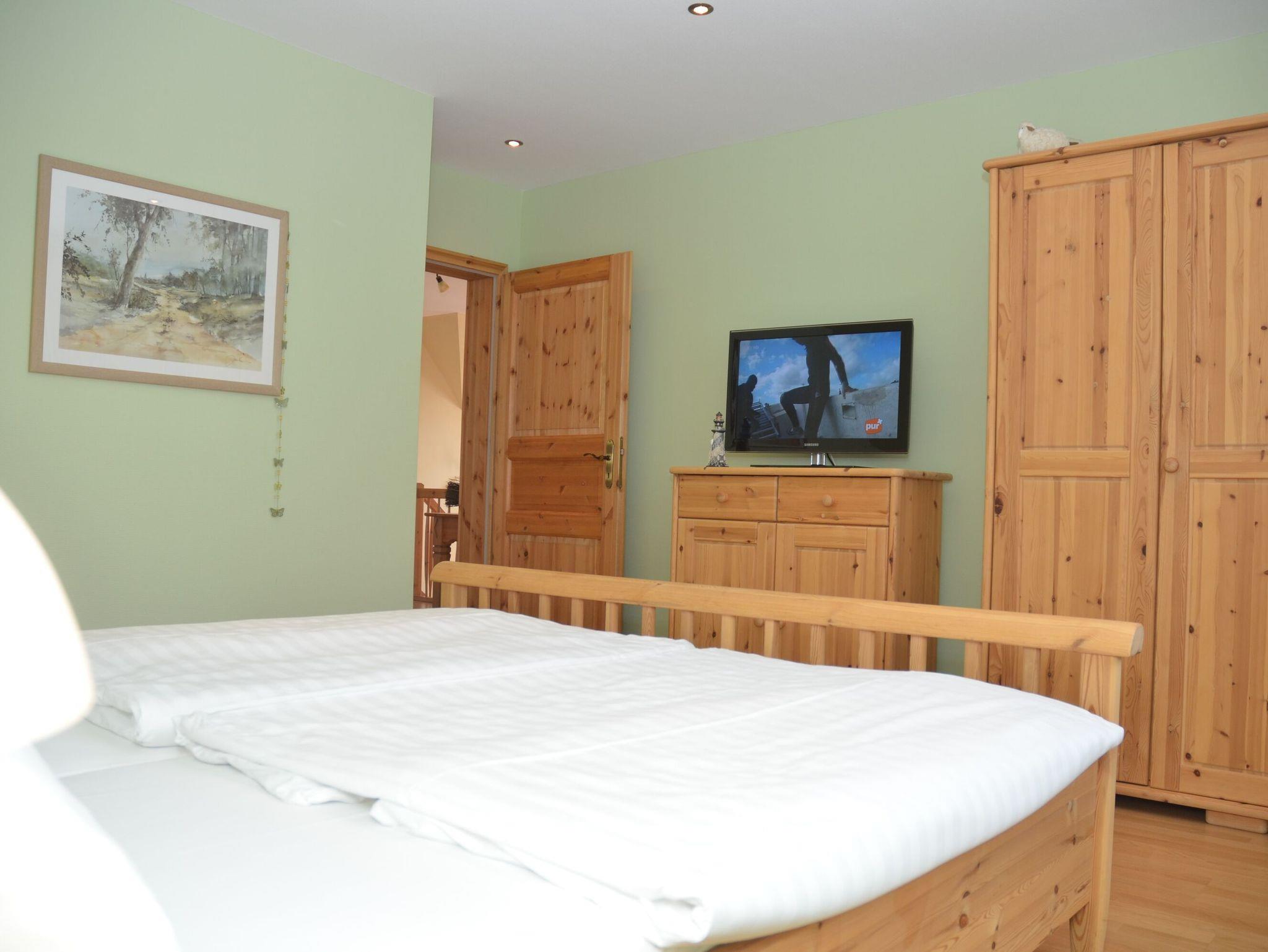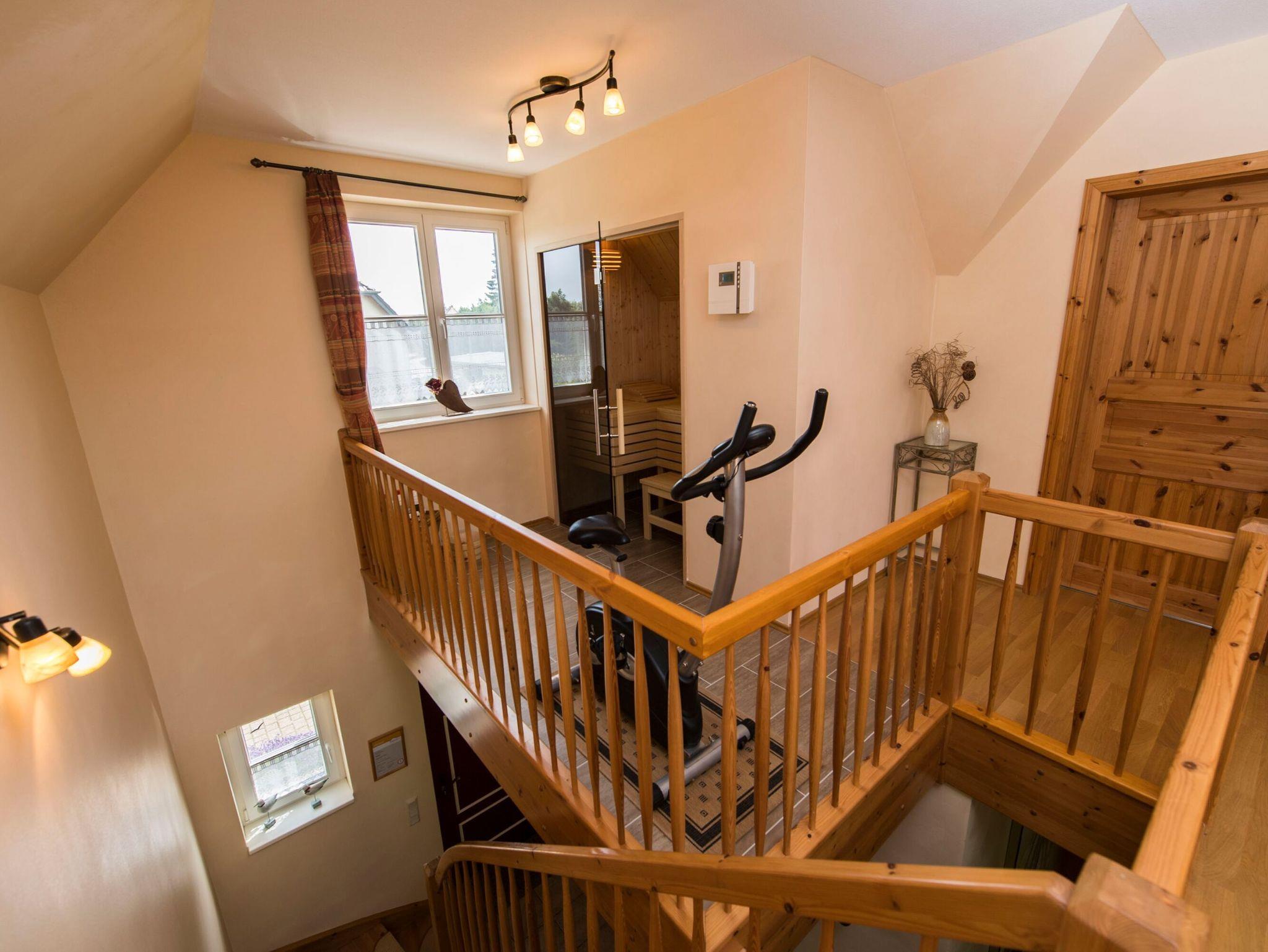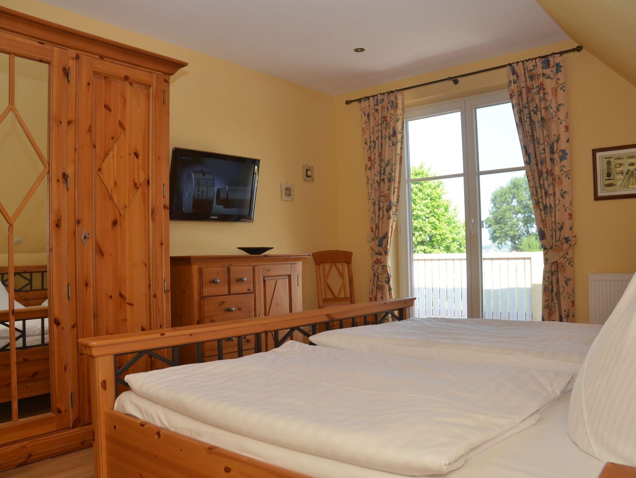 In dem mit Parkett versehenen Obergeschoss finden Sie drei Schlafzimmer mit je einem Doppelbett (mit jeweils einer Matratze im Härtegrad 2 und 3) und je einen Fernseher. Zwei der Schlafzimmer haben einen Zugang zum Balkon mit wunderschönem Boddenblick. Ein helles Büro mit Schreibtisch, einer kleinen Bibliothek und einer Couch für gemütliche Stunden vor einem weiteren TV steht im OG ebenfalls zur Verfügung. Es gibt desweiteren einen W-LAN-Internetanschluss und ein Telefon (nur Gespräche ins dt. Festnetz) zur kostenfreien Nutzung.