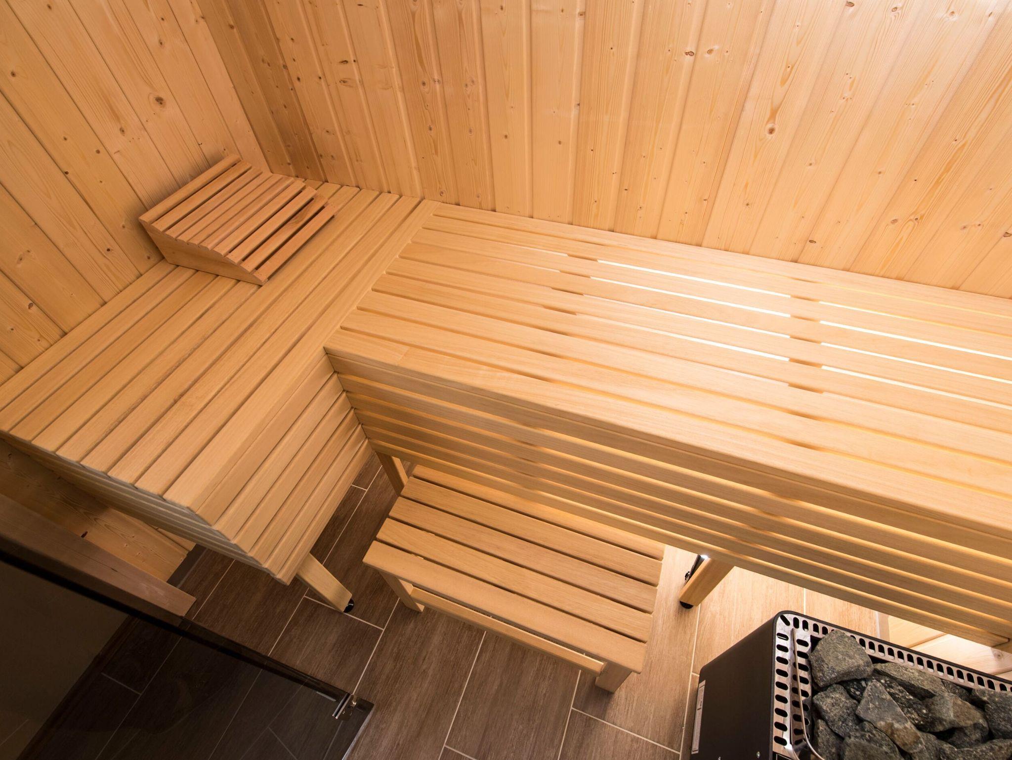 Das geräumige Bad auf dieser Etage besticht durch eine ebenerdige Dusche, eine schöne Badewanne, zwei Waschbecken, Fußbodenheizung und viel Ablagefläche. Eine hauseigene Sauna komplettiert die hochwertige Ausstattung.