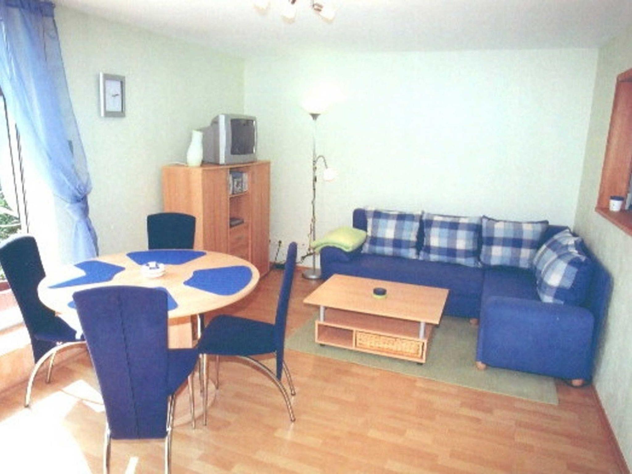 Ein Wohnzimmer, mit ausziehbarer Eckcouch, die eine zusätzliche Schlafmöglichkeit darstellt.Ein Esstisch für 4 Personen, Sat-TV, Stereoanlag.