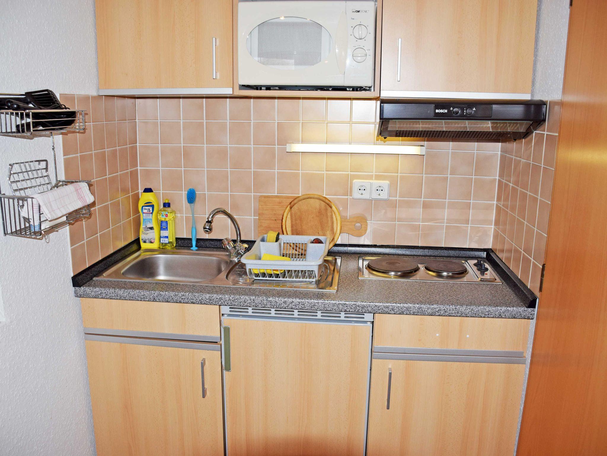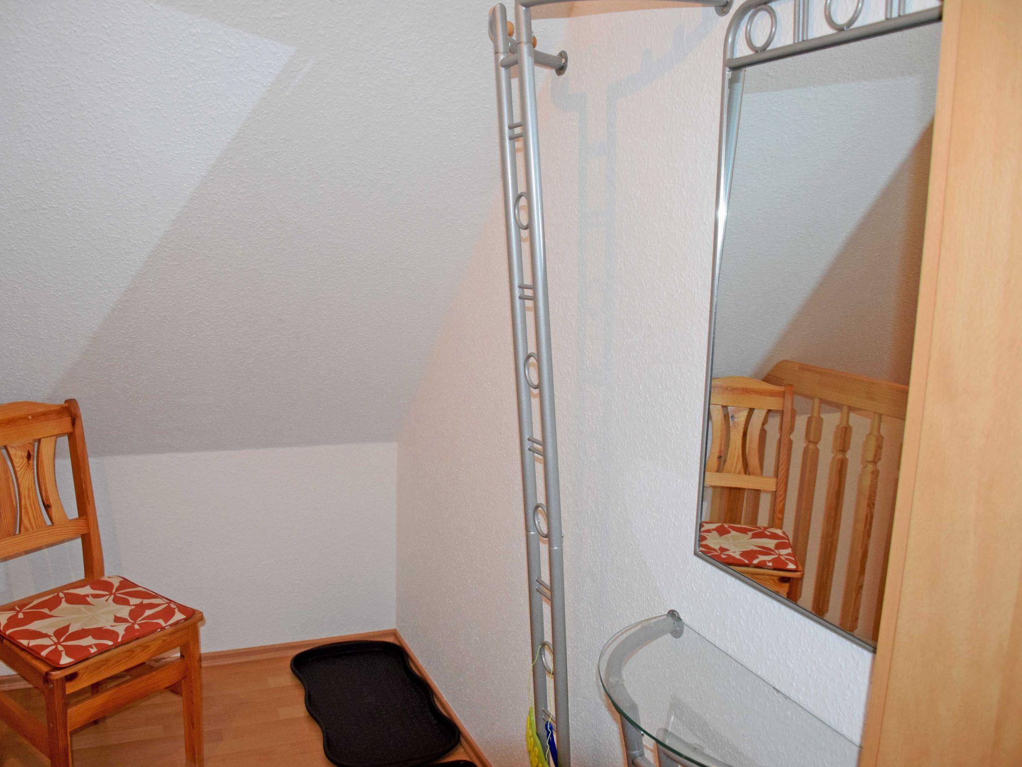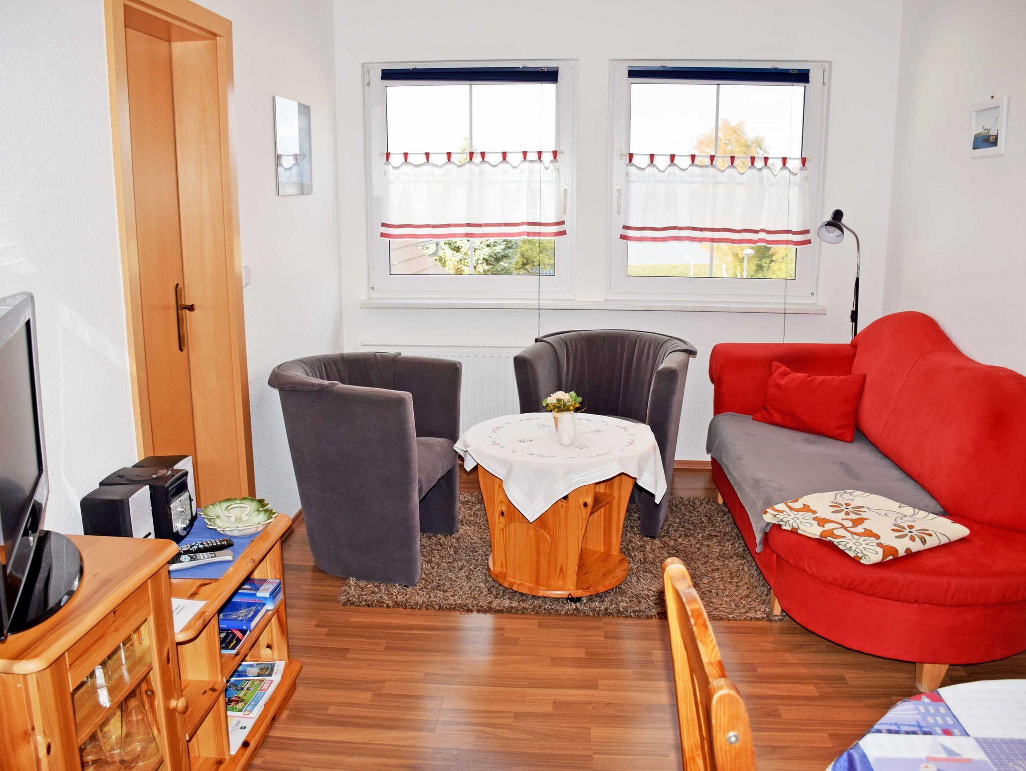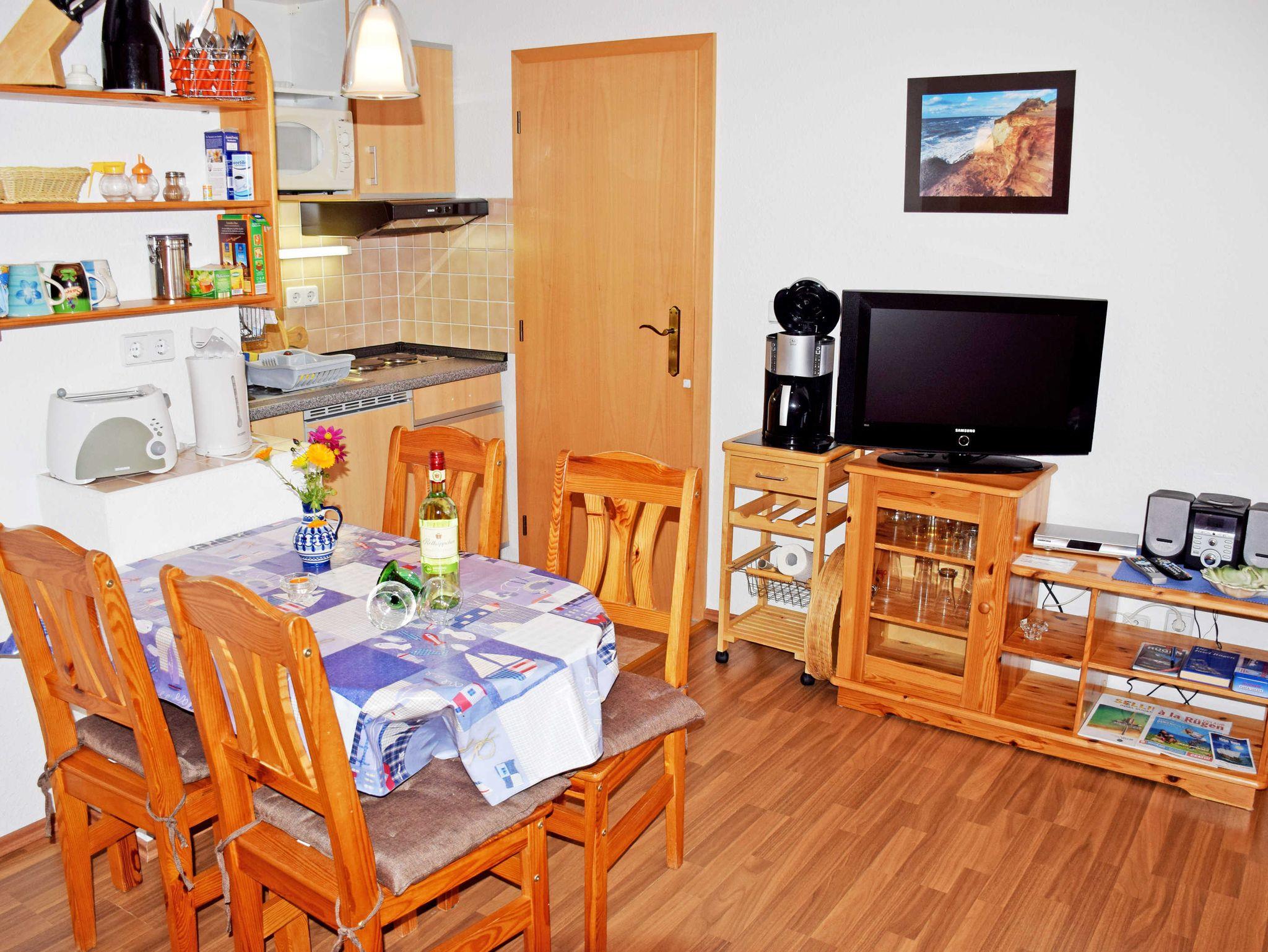 Das im Obergeschoss liegende Appartement betritt man über einen Flur mit Garderobe und Schuhschrank, in den Wohnraum mit einem Esstisch mit Stühlen sowie einer Küchenzeile. Diese ist mit einem Herd, Abzugshaube, Wasserkocher, Kaffeemaschine, Toaster, Mikrowelle und Kühlschrank komplett ausgestattet. Zum Wohnbereich gehören eine Couch, Sessel, Tisch und TV-Gerät.