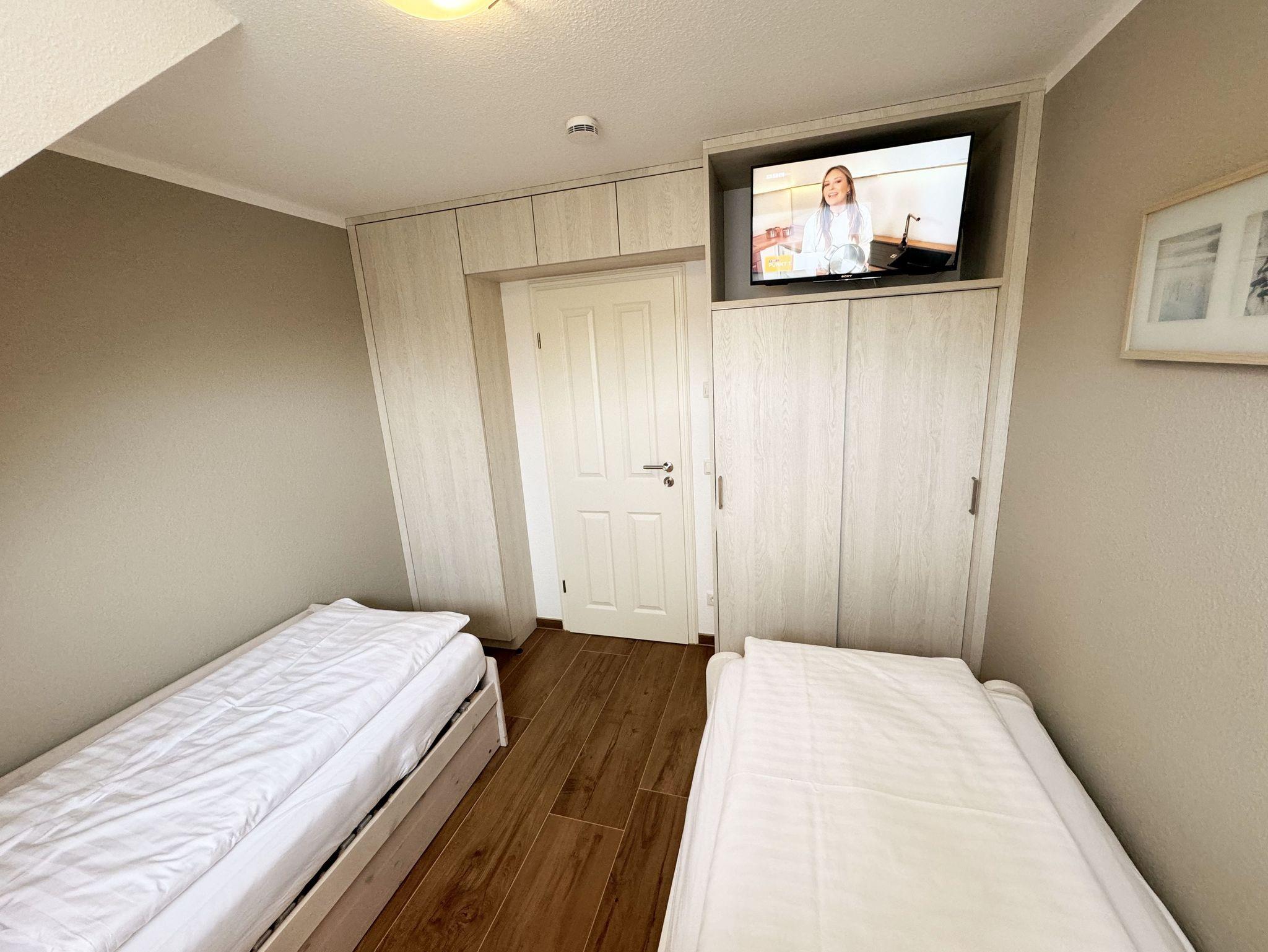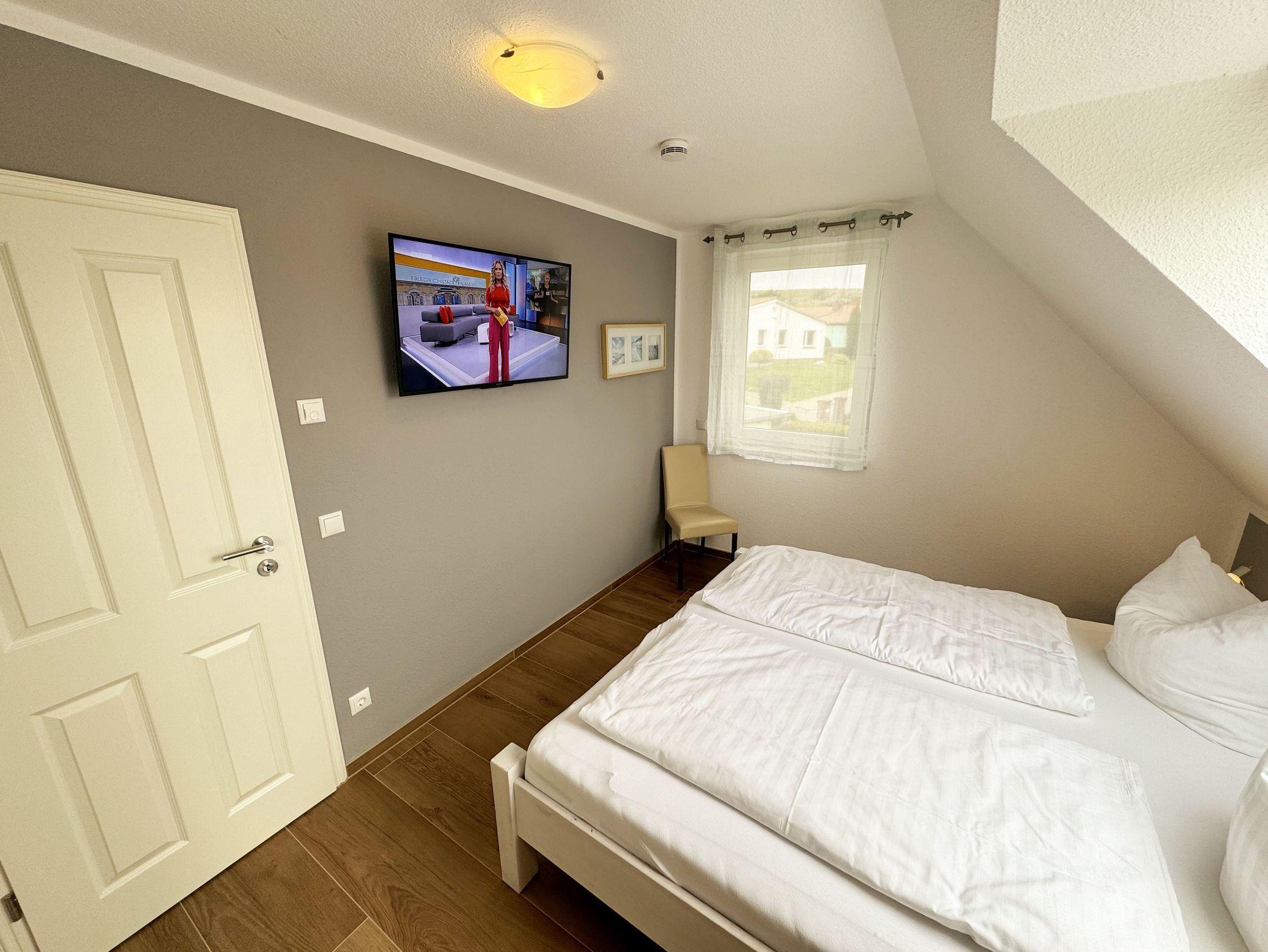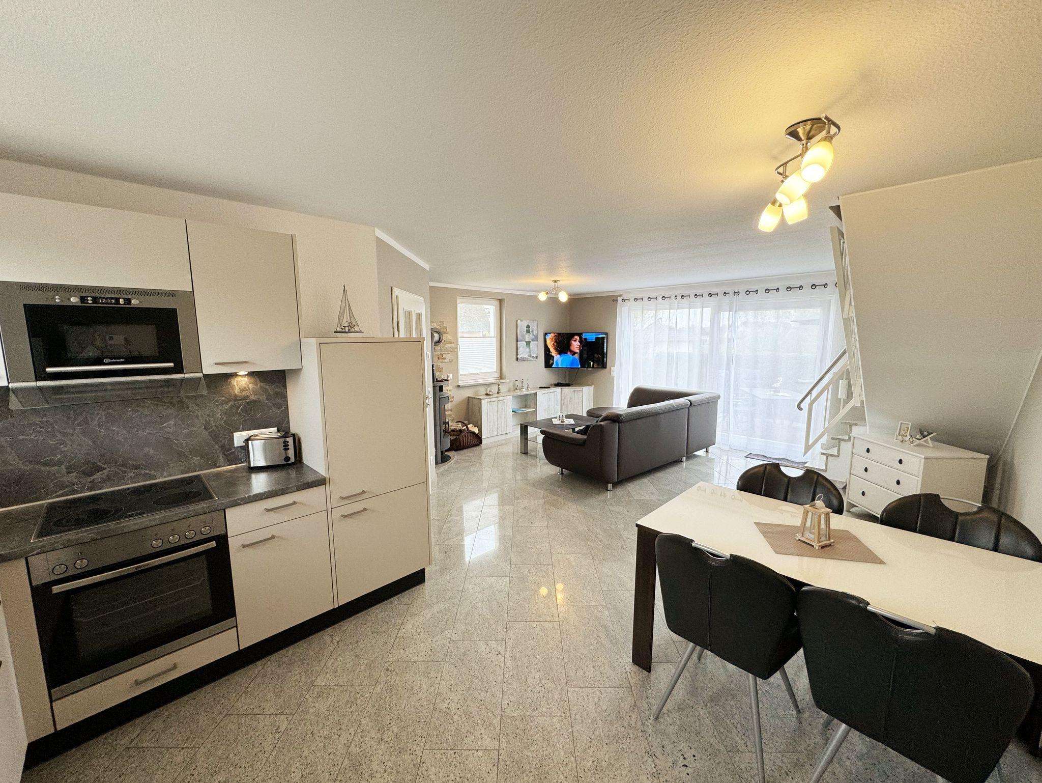 Die Doppelhaushälfte Seebrise ist mit Ihren ca. 75 qm großzügig geschnitten und bietet genügend Platz für bis zu 5 Personen. Die Unterkunft (Nichtraucher) ist auf 2 Ebenen verteilt und verfügt zusätzlich über eine Terrasse mit Bestuhlung und Grill. Im Erdgeschoss verfügt die Doppelhaushälfte Seebrise über einen großen Wohn/Essbereich mit einem Esstisch für 5 Personen, eine gemütliche Couch, Smart-TV mit Blu Ray-Player, DAB-Radio und direkten Zugang über die Schiebetür auf die Terrasse. Auch im Urlaub müssen Sie nicht auf einen Internetanschluss (WLAN) verzichten. Die in dem Wohnbereich integrierte Küchenzeile verfügt über einen Backofen, Ceranfeld, Kühlschrank, Mikrowelle, Geschirrspüler, Spüle und diverse Küchenutensilien. Für die kältere Jahreszeit sorgt ein Kaminofen für gemütliche Abende. Ein Gäste-WC befindet sich im Erdgeschoss. Über die Treppe erreichen Sie das Obergeschoss, wo sich 2 Schlafzimmer, ein Duschbad und ein Wirtschaftsraum mit Waschmaschine und Trockner befindet. Das 1. Schlafzimmer verfügt über ein Doppelbett (1,80m x 2,00m), Kleiderschrank und Kommode. Das 2. Schlafzimmer ist mit einem Einzelbett (0,90m x 2,00m) und einem Tandembett (Einzelbett mit Ausziehfunktion je 0,90m x 2,00m) und einer Kommode ausgestattet. Das großzügig gestaltete Bad verfügt über eine Glasrunddusche, Handtuchtrockner, Waschbecken und WC. Das ganze Haus ist mit einer Fußbodenheizung ausgestattet und komplett mit Natursteinfliesen gefliest. Alle Fenster können durch Außenrollos abgedunkelt werden. Die beiden Schlafzimmer sind mit Laminat versehen. Zu jeder Doppelhaushälfte gehört ein PKW-Stellplatz. Eine Fahrradunterstellmöglichkeit befindet sich auf dem Grundstück. Von der Terrasse aus können Sie den Tag bei einem Gläschen ausklingen lassen und wunderschöne Sonnenuntergänge in Richtung Hafen genießen. Für unsere kleinen Gästen steht 1x Kinderreisebett (ohne Bettinlett und zusätzlicher Matratze) sowie 1x Hochstuhl inklusive zur Verfügung. Es sind keine Haustiere erlaubt! Die Erstausstattung eines Wäschepaketes (komplette Bettwäsche, 1 Duschhandtuch, 1 kleines Handtuch) können Sie bis 14 Tage vor Anreise gegen einen Aufpreis dazu buchen oder durch eigene ergänzen. Ab 2 gebuchten Paketen erhalten Sie einmalig 1 Geschirrhandtuch und 1 Duschvorleger hinzu.