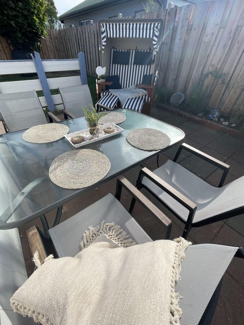 Die überdachte Terrasse mit einem Esstisch für 4 Personen und ein sehr schöner und gemütlicher Strandkorb und Grill laden zum relaxen ein.