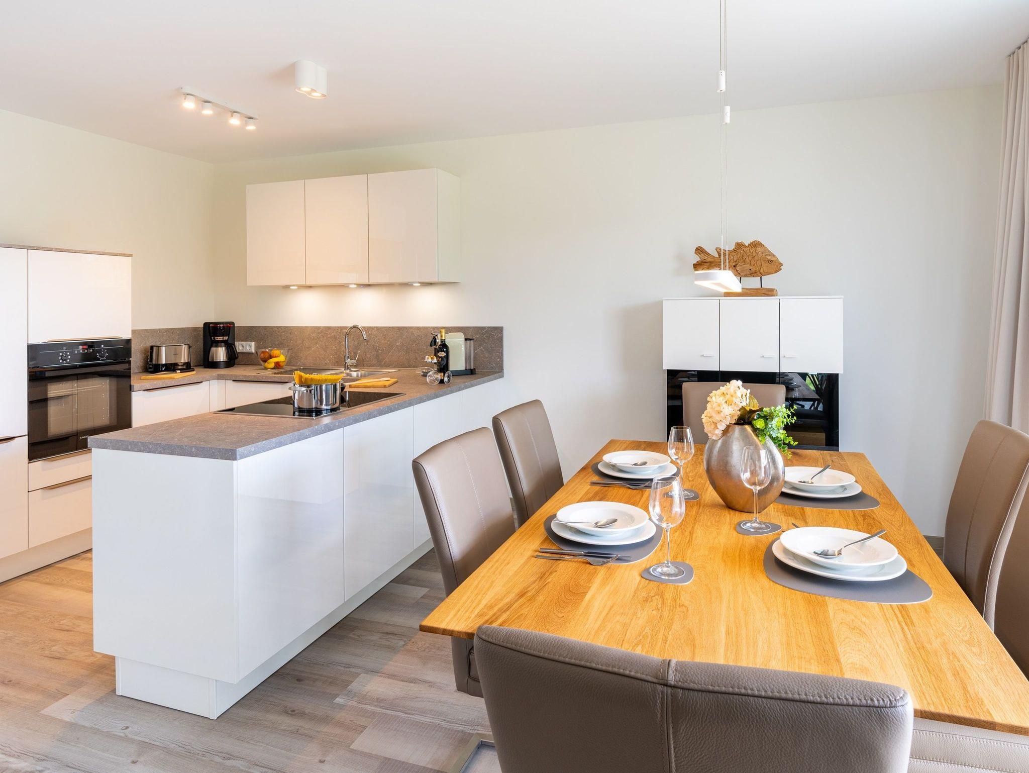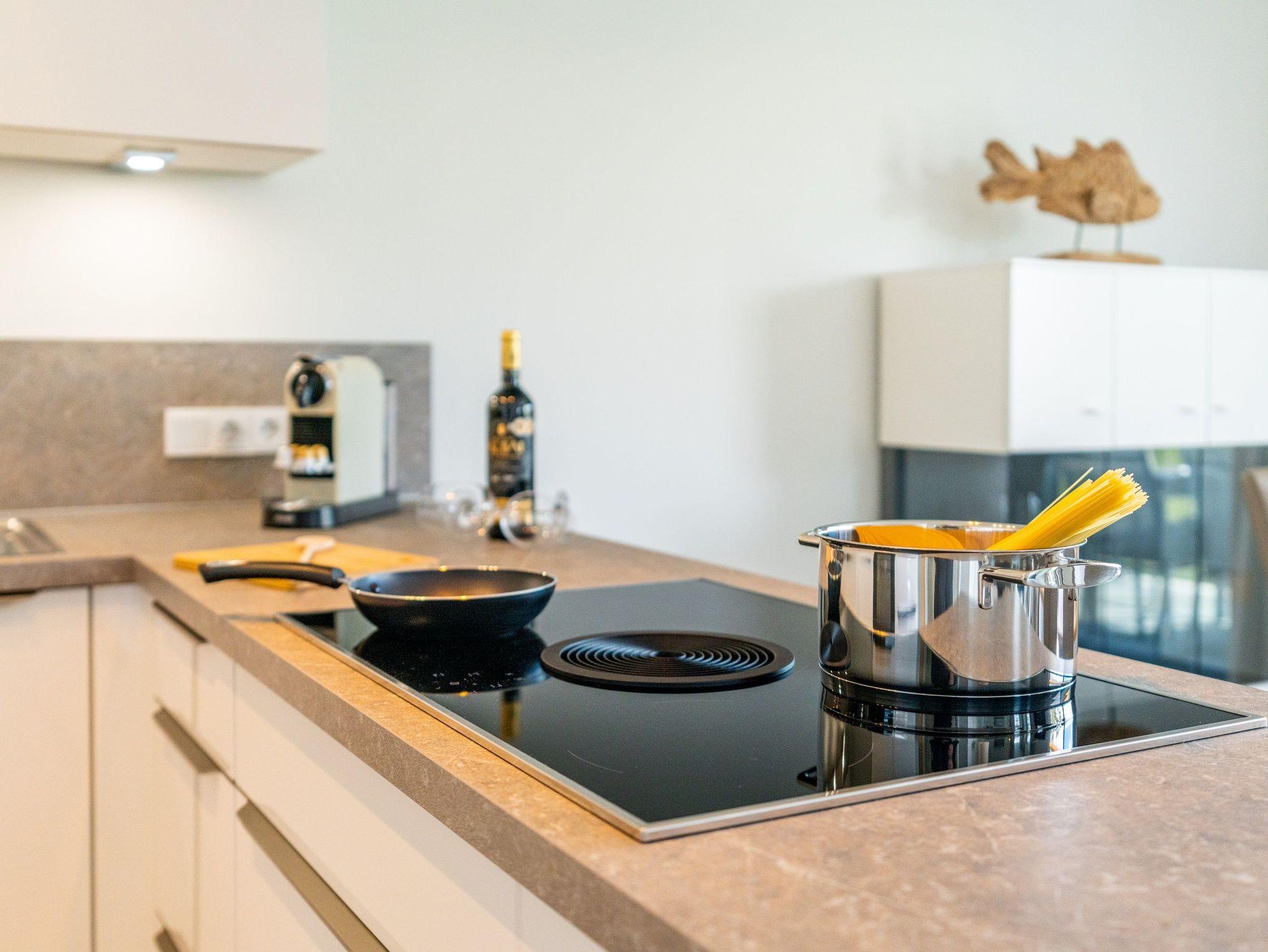 Die weiße Hochglanzküche von Nobilia ist umfassend ausgestattet mit schönem Porzellan, Kochgeschirr und allen notwendigen Küchenutensilien. Sie finden hier einen großen Kühlschrank mit separatem Gefrierfach, einen Backofen in Sichthöhe, eine Spülmaschine, eine Filterkaffeemaschine, einen Milchschäumer, eine Nespresso-Kapselmaschine, einen Toaster und einen Wasserkocher, sowie vieles mehr.