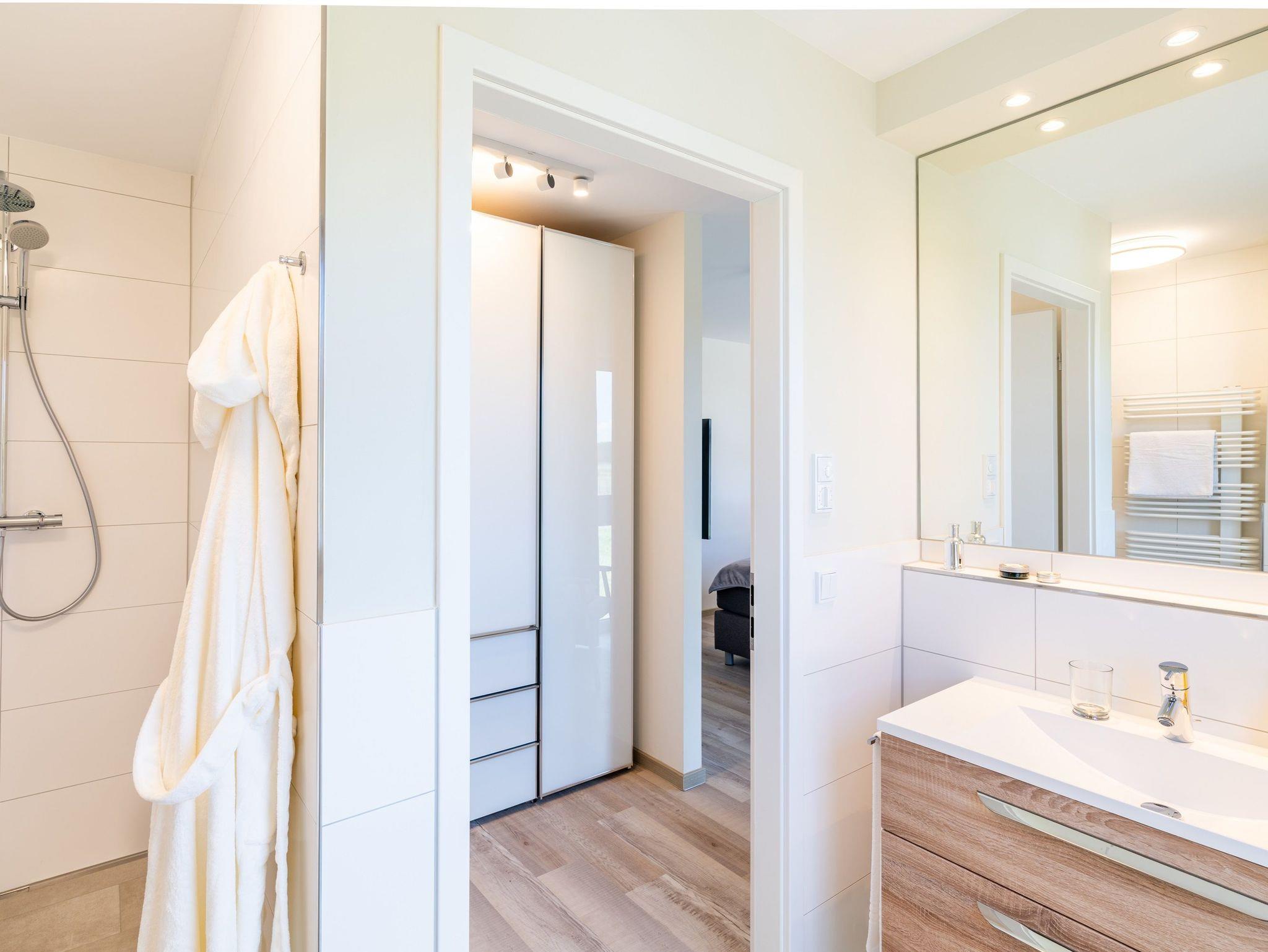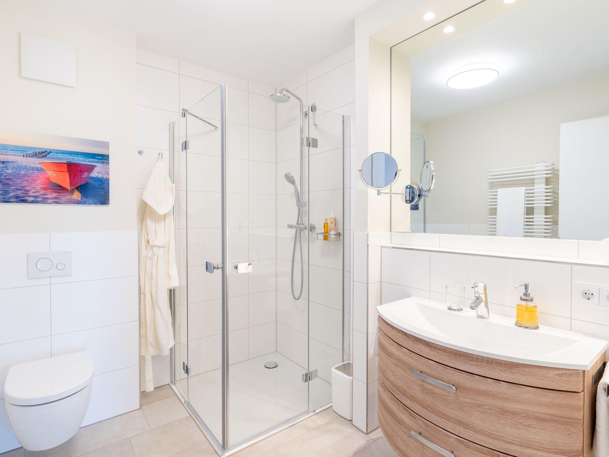 Im zweiten, voll ausgestatteten Badezimmer steht Ihnen eine großzügige Ganzglas-Duschkabine mit den Maßen 90 x 90 cm zur Verfügung.