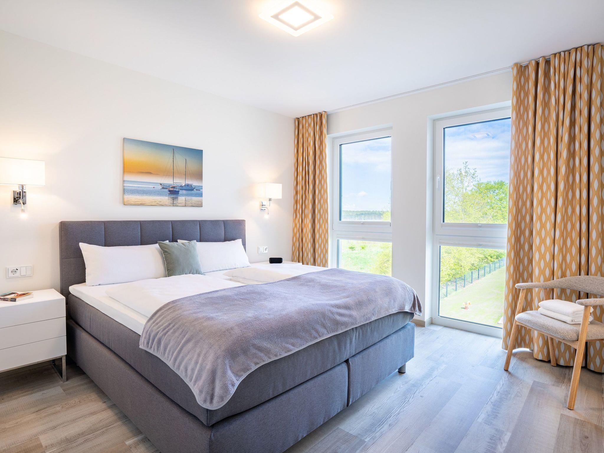 Das Hauptschlafzimmer bietet ein hochwertiges Boxspringbett (180 x 200 cm), einen Kleiderschrank sowie einen Smart-TV. Das en suite Badezimmer mit begehbarer Dusche rundet den Komfort ab.