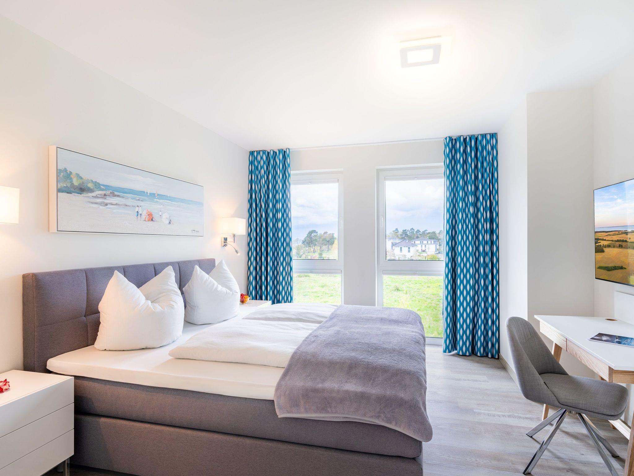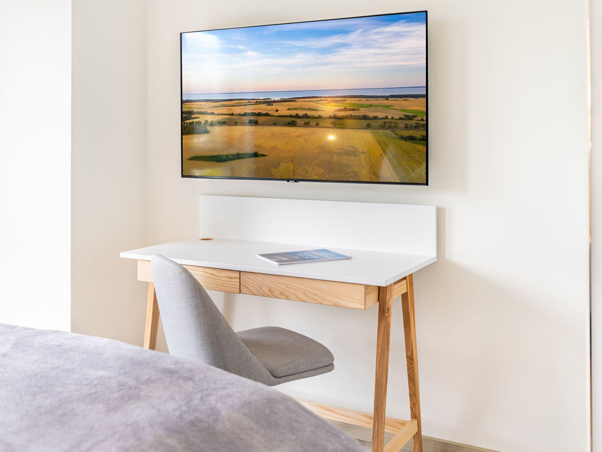 Im zweiten Schlafzimmer finden Sie ebenfalls ein komfortables Boxspringbett (180 x 200 cm), einen Kleiderschrank, einen Schreibtisch und einen Smart-TV vor.