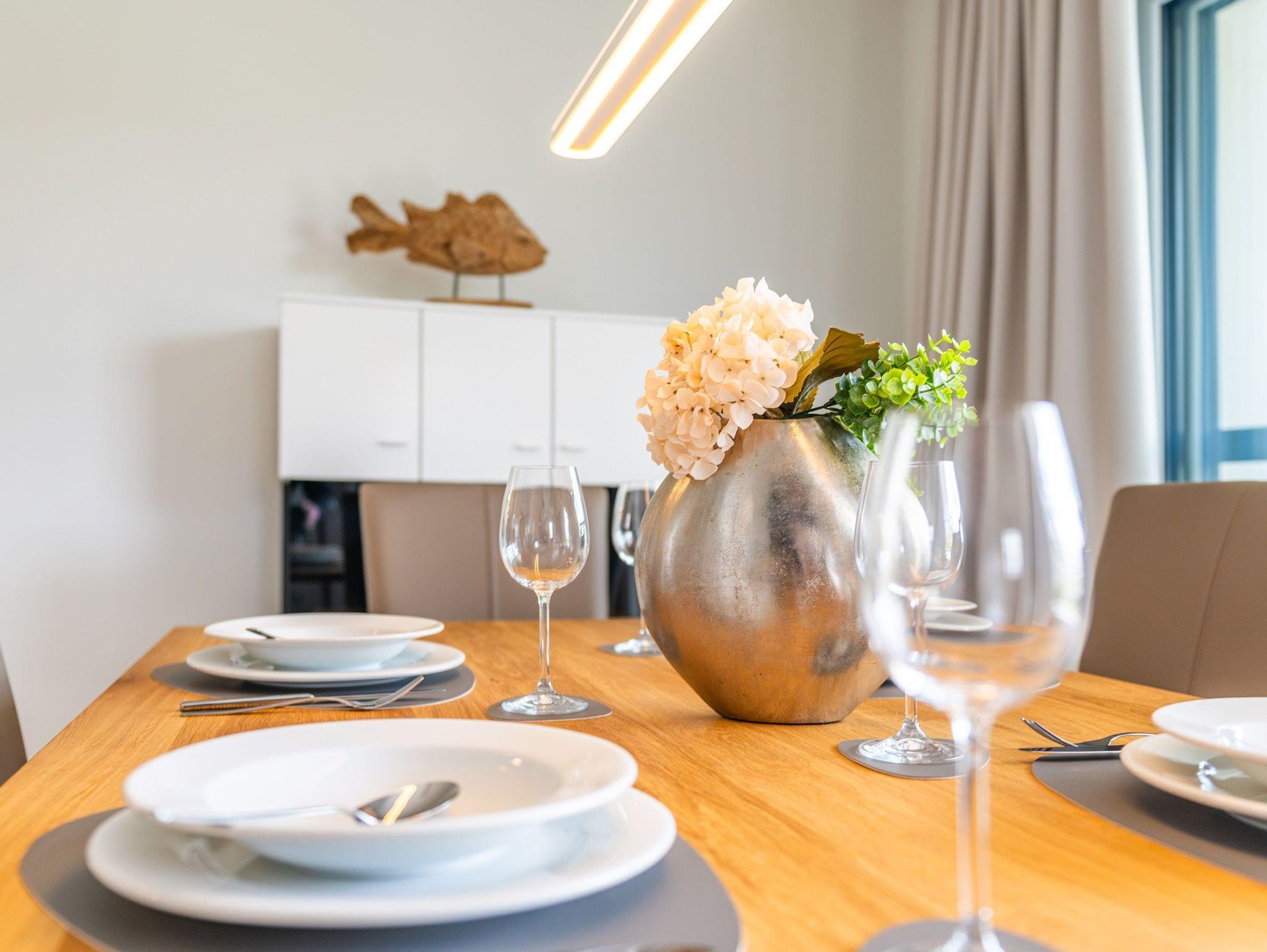 Eine Essgruppe mit Lederstühlen, ein bequemes Eckledersofa und ein Ledersessel vervollständigen die hochwertige und geschmackvolle Einrichtung.