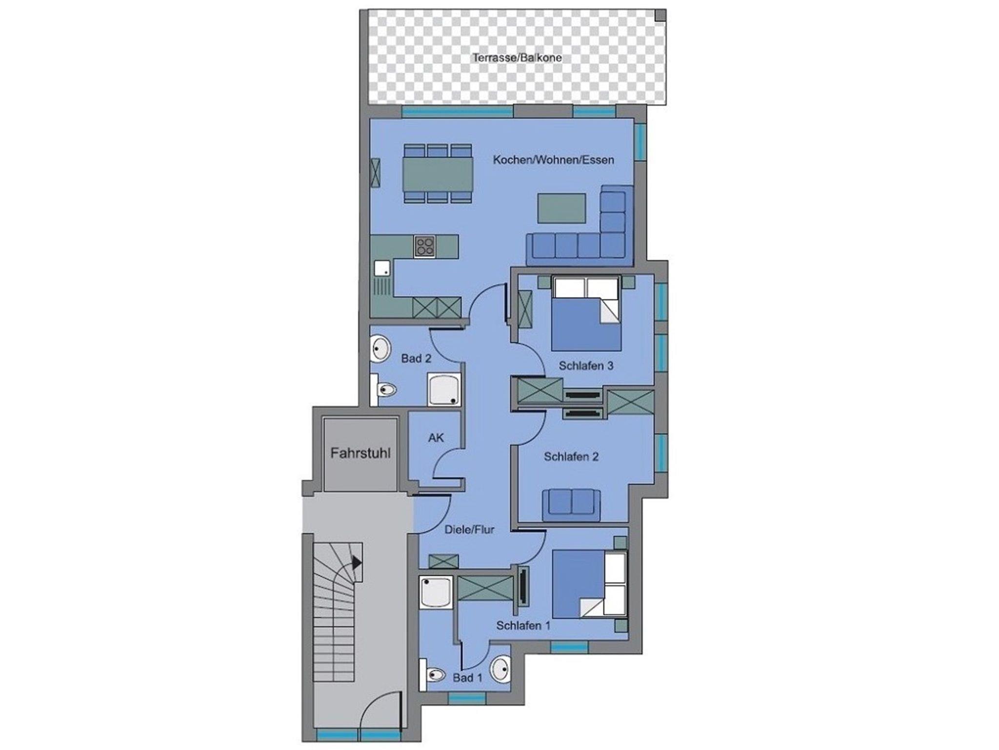 Die barrierefreie und sonnendurchflutete 4-Zimmer-Ferienwohnung liegt im zweiten Obergeschoss des 8-Parteienhauses. Ein Aufzug ist vorhanden, der jede Etage anfährt.