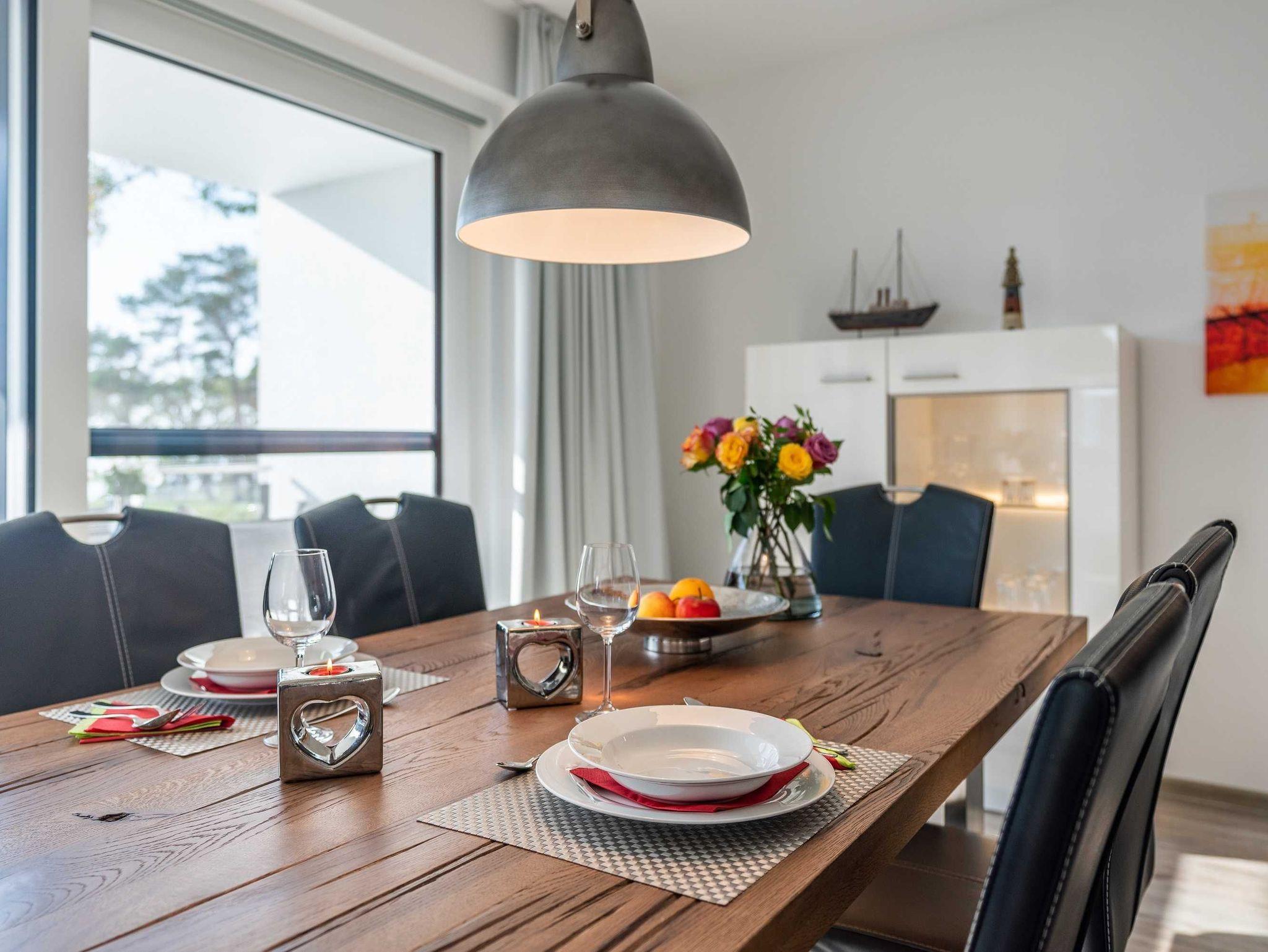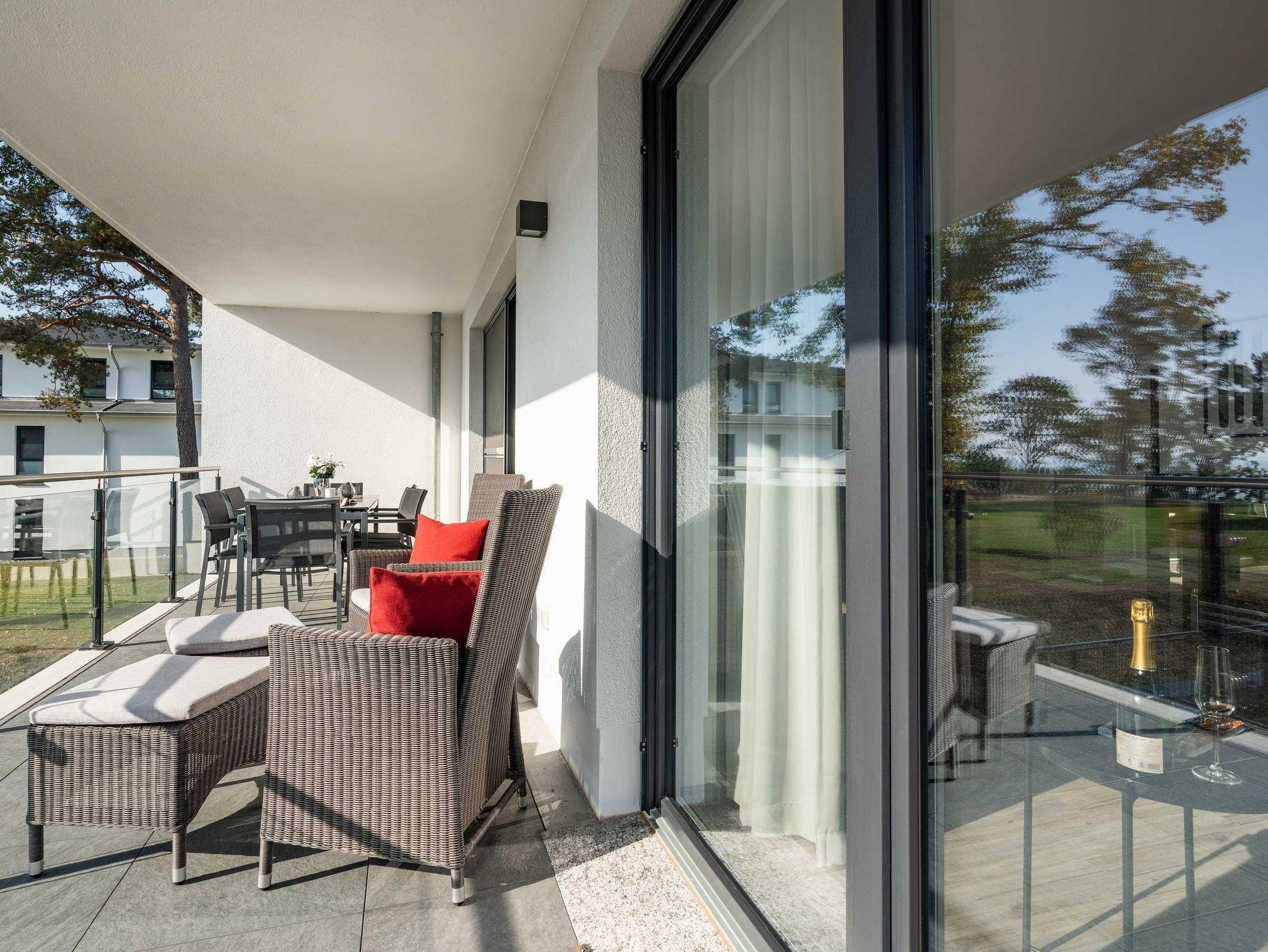 Diese luxuriöse 4-Zimmer-Wohnung im ersten Obergeschoss von Haus 1 (Aufzug vorhanden) bietet ausreichend Platz für maximal 6 Personen sowie einem Kleinkind bis 2 Jahre im Babybett. Das Appartement verfügt über eine Wohnfläche von 119 m² und hat 3 Schlafzimmer sowie 2 voll ausgestattete Duschbäder. Die große Sonnenterrasse mit 17 m² liegt in idealer Süd-Ausrichtung. Schon morgens verwöhnt Sie die überdachte Sonnenterrasse mit einem Blick auf das Haff; sehr oft mit wärmenden Sonnenstrahlen. Da das Haus 1 versetzt hinter einem weiteren Haus steht, ist der Blick auf das Haff seitlich, trotzdem kann man auf das Wasser sehen und den Seeadler dabei beobachten, wie er seine Kreise zieht. Lassen Sie Ihre Seele in den vorhandenen Relax-Sesseln mit Fußhockern baumeln. Eine Essgruppe und ein Sonnenschirm bieten weiteren Komfort auf der Terrasse.