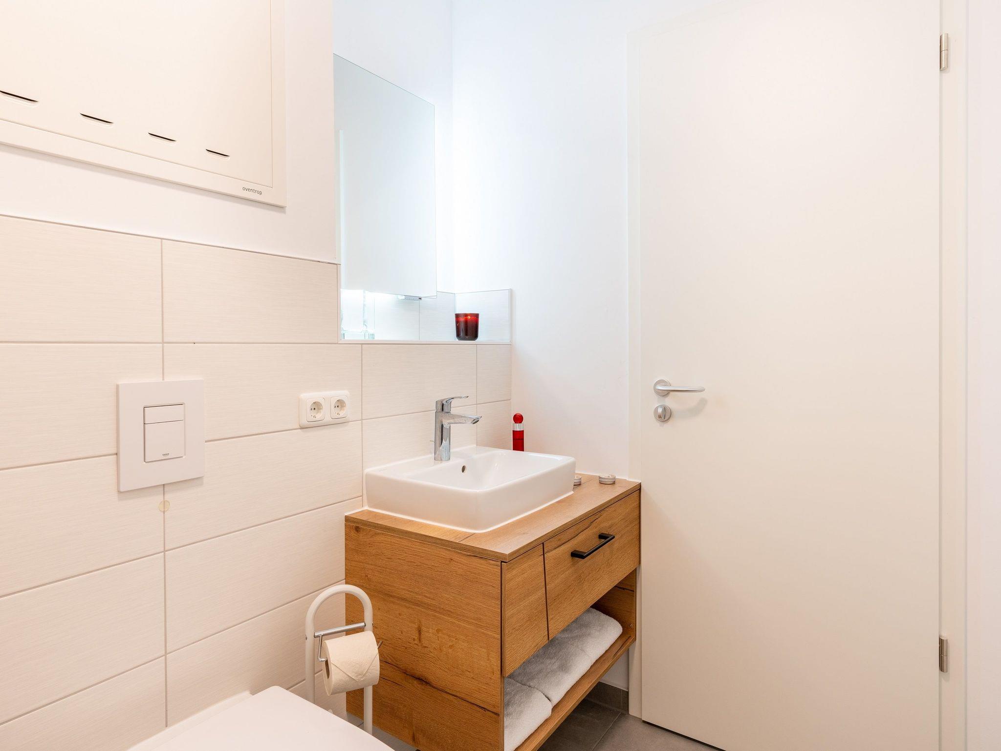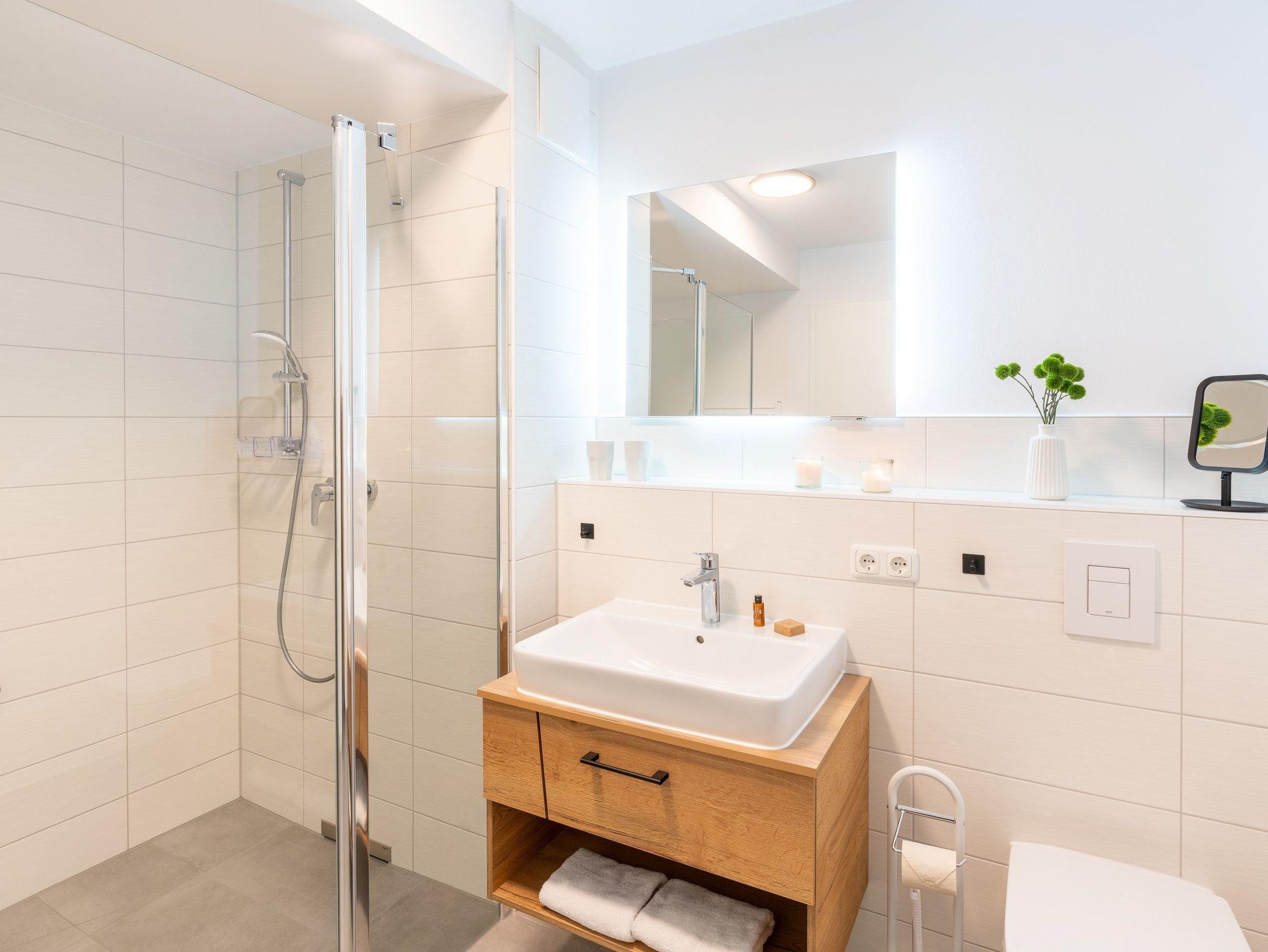 Das vollausgestattete Badezimmer verfügt über eine ebenerdige Dusche, WC, Waschtischanlage sowie Fön. Ihnen steht zudem ein Gäste-WC zur Verfügung.