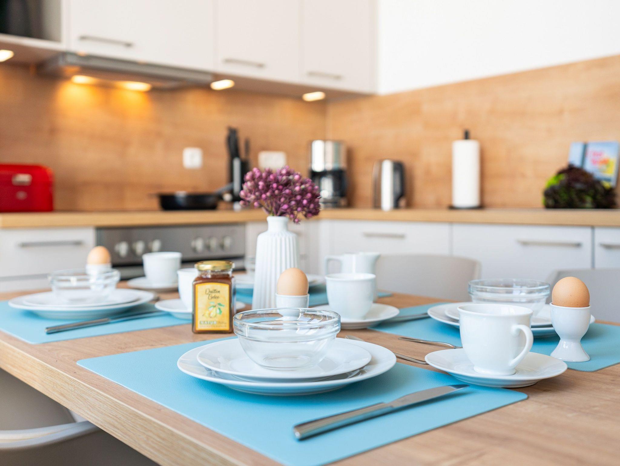 Die Küchenzeile verfügt über hochwertige Geräte wie Herd, Backofen, Mikrowelle, Kühl- und Gefrierschrank sowie Spülmaschine. Ausreichend Geschirr, Besteck sowie Töpfe und Pfannen befinden sich in den Schränken. Am großen Esstisch finden Sie vor einem erholsamen Urlaubstag zu einem gemeinsamen Frühstück zusammen.