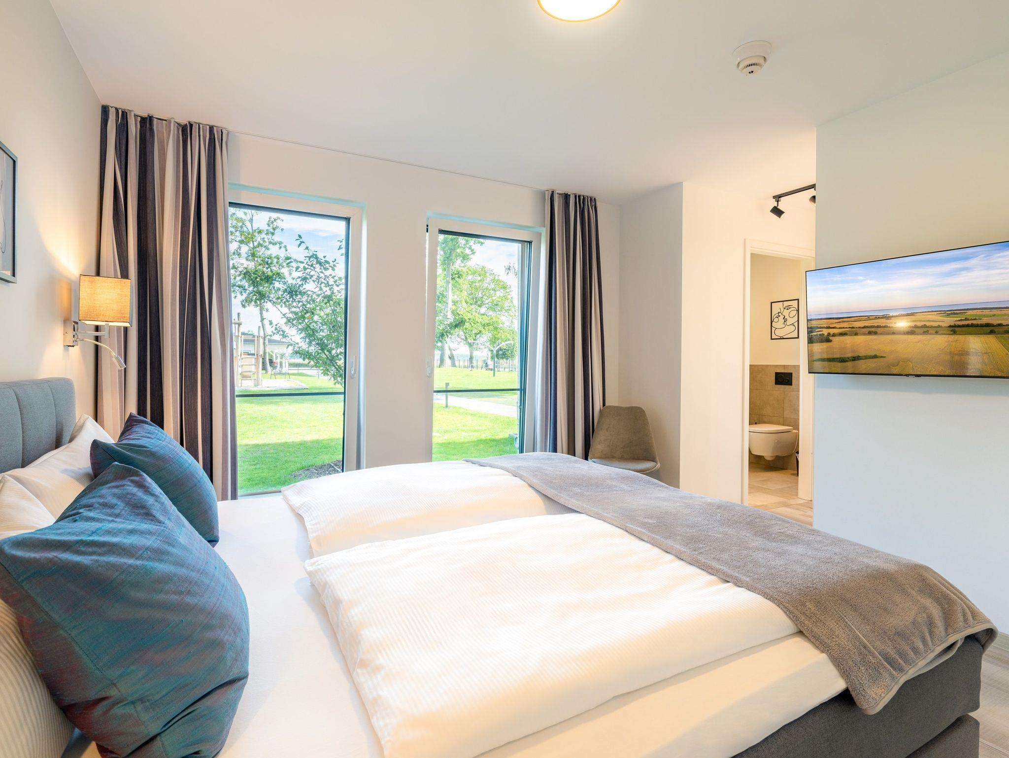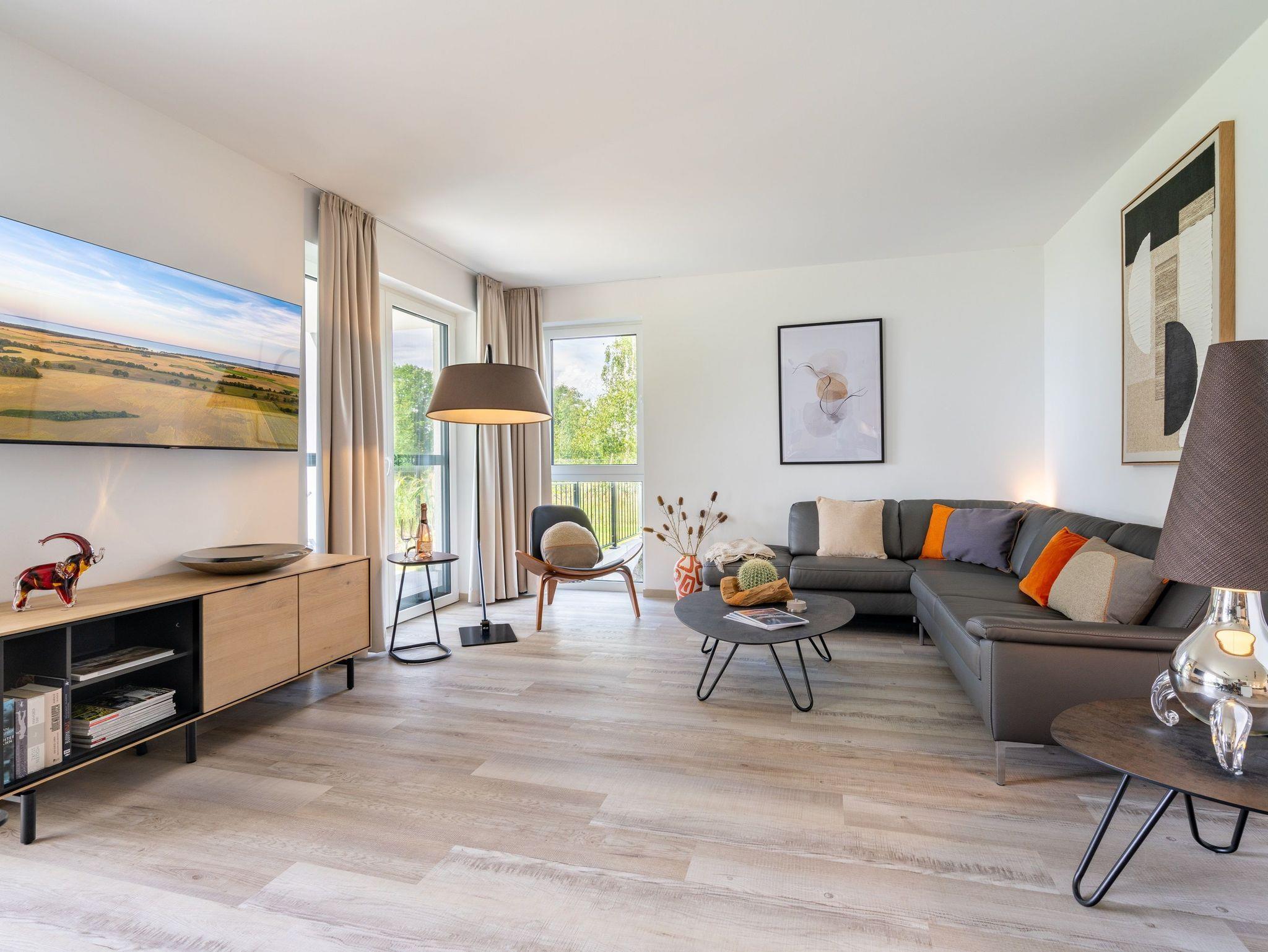 Diese im Jahr 2024 fertiggestellte Ferienwohnung verfügt über eine Wohnfläche von 112 m² und befindet sich im Haus 8, das etwa 400 Meter von den anderen „Oase am Haff“-Häusern entfernt auf einem separaten Grundstück in gleicher Südlage liegt.