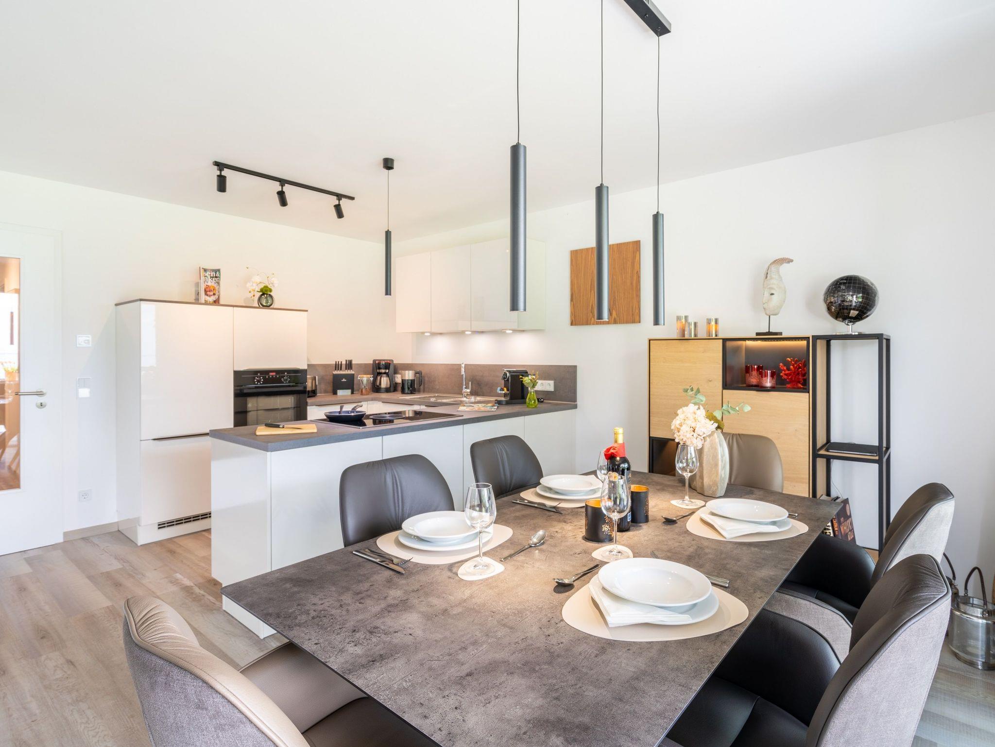 Eine Essgruppe mit Lederstühlen, ein bequemes Eckledersofa und ein Ledersessel vervollständigen die hochwertige und geschmackvolle Einrichtung.