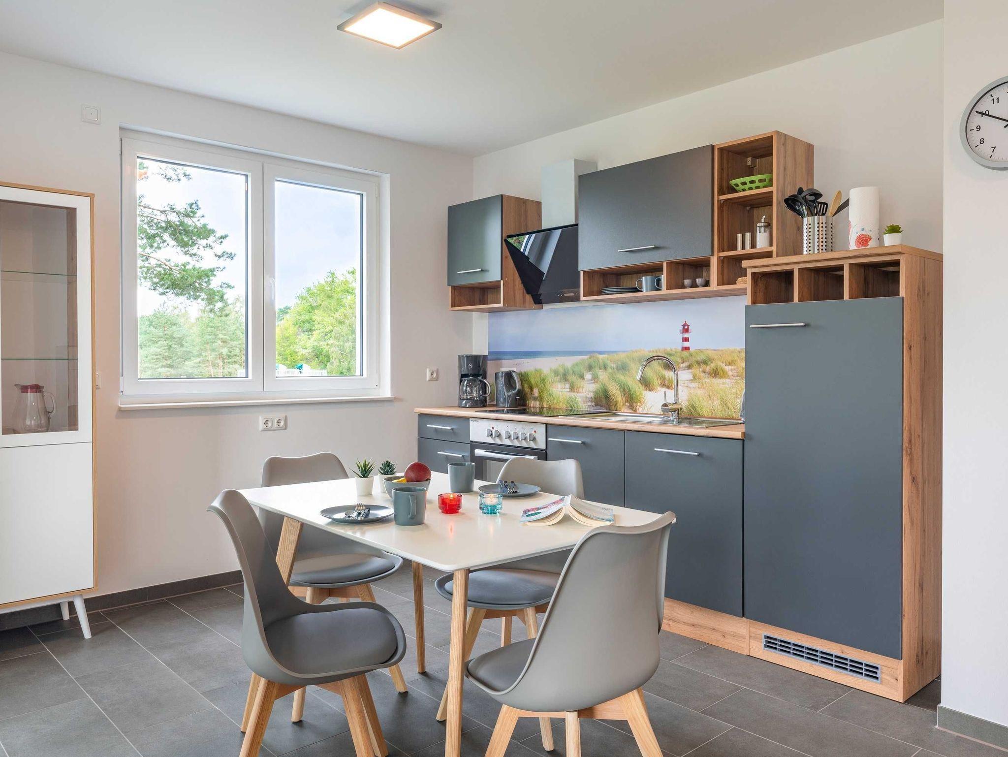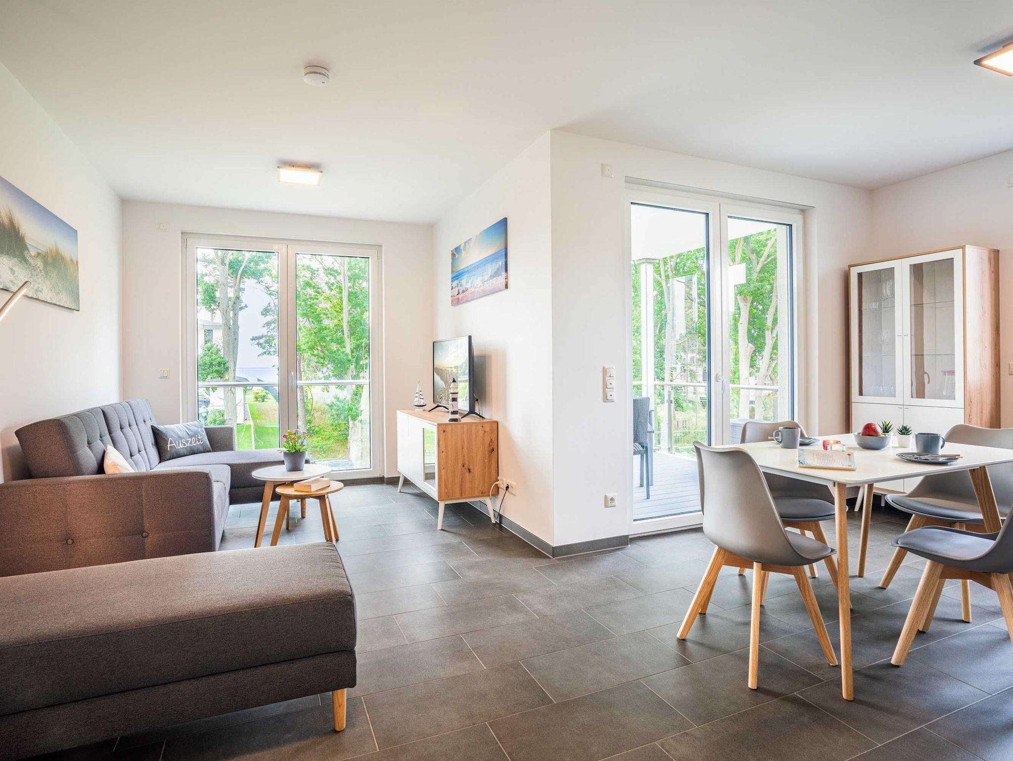 Auf einer Wohnfläche von 61 m² finden drei Erwachsene und ein Kleinkind bis zwei Jahre (im Babybett) in dieser modern eingerichteten Ferienwohnung ausreichend Platz für einen entspannten Urlaub am Stettiner Haff auf Usedom.