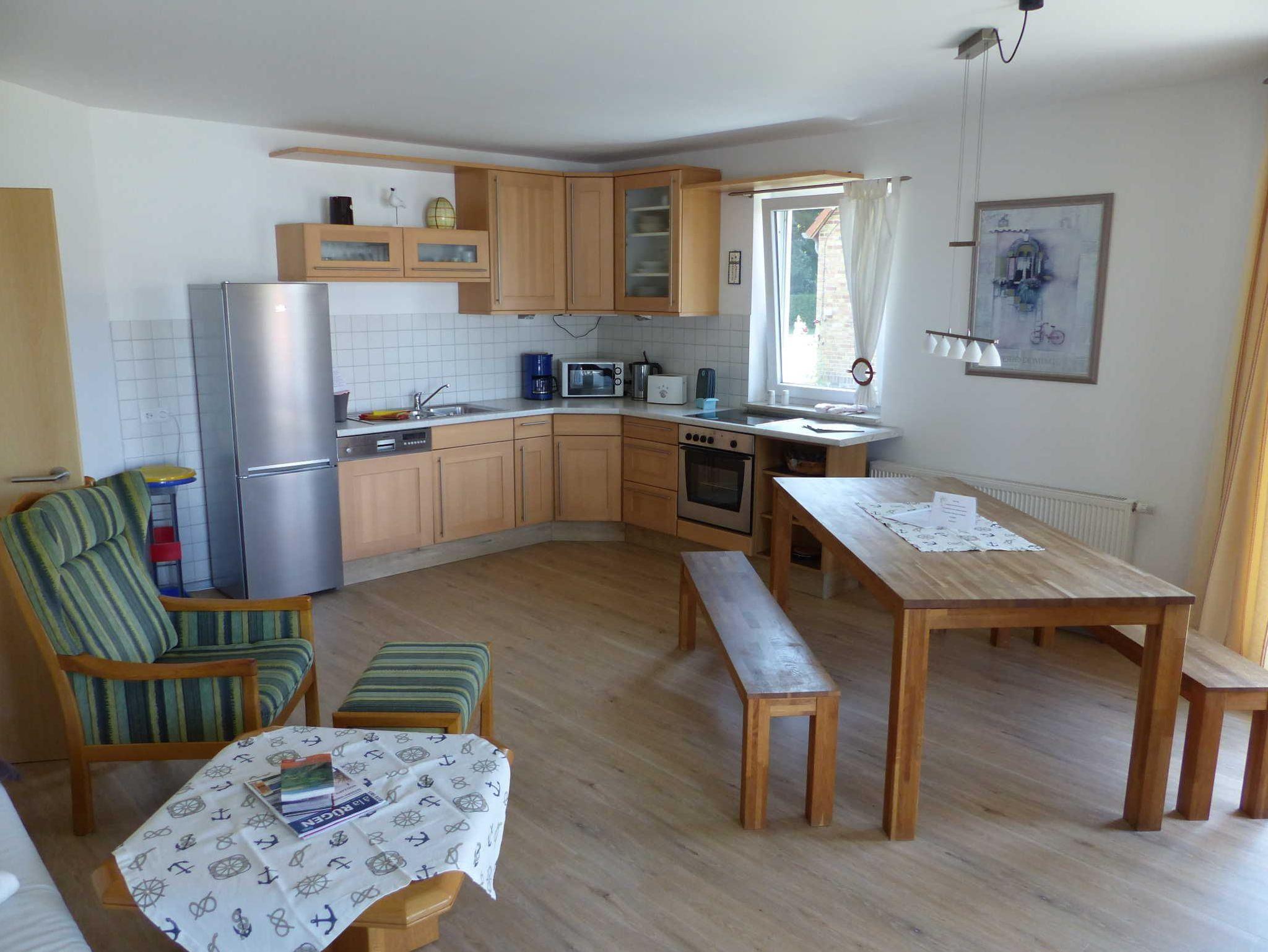 Für Ihren angenehmen Aufenthalt in unserem Haus bieten wir Ihnen ein umfangreiches Sortiment an Zubehör und Ausstattung. Die Küche ist mit Geschirrspüler, Kühl-Gefrier-Kombination, 4-fach Cerankochfeld, Backofen, Mikrowelle, Kaffeemaschine, Toaster, Wasserkocher, Geschirr/Besteck/Kochutensilien ausgestattet. Ein großer Esstisch rundet das Angebot ab. Bei Bedarf können Kinderstühlchen für die Kleinen bis 3 Jahre zur Verfügung gestellt werden.