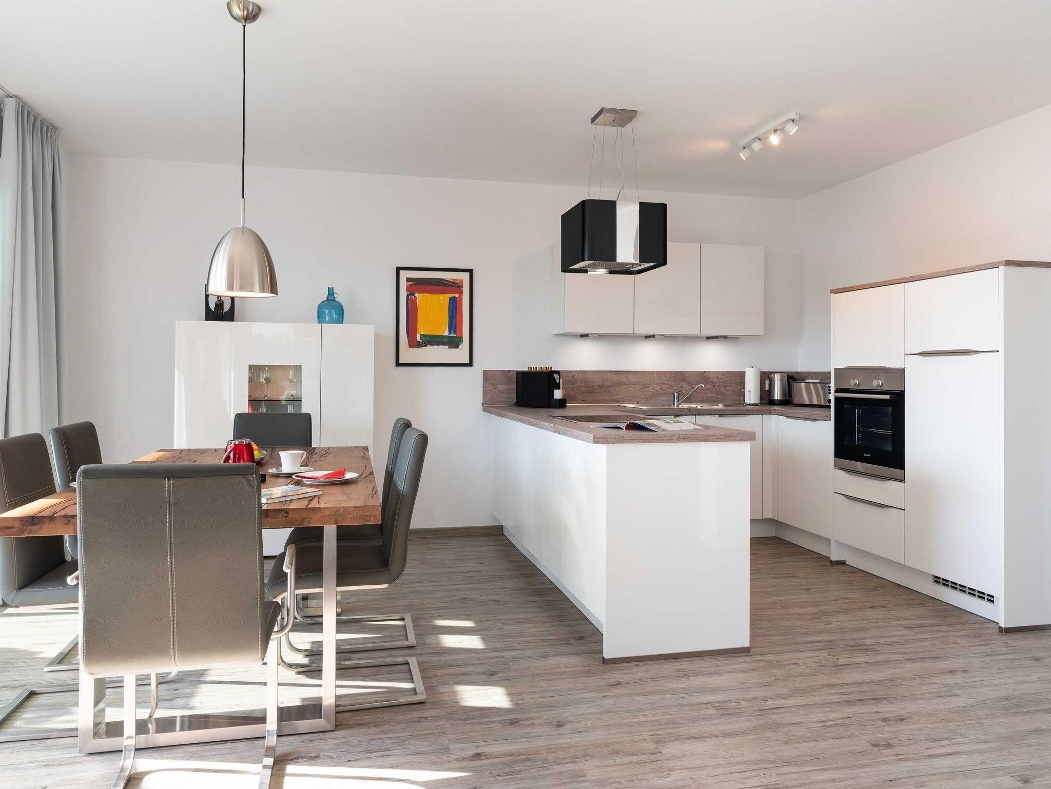 Diese luxuriöse 4-Zimmer-Wohnung im ersten Obergeschoss von Haus 3 (Aufzug vorhanden) mit Platz für maximal 6 Personen sowie einem Kleinkind bis 2 Jahre im Babybett verfügt über eine Wohnfläche von 119 m² und hat 3 Schlafzimmer sowie 2 voll ausgestattete Duschbäder. Die große Sonnenterrasse mit 17 m² liegt in idealer Süd-Ausrichtung. Die Wohnung ist modern eingerichtet mit offenem Wohn-Essbereich, großem Esstisch, Ledersofa sowie Smart-TV (inkl. Sky-Abo). Die hochwertig ausgestattete Küche, offen zum Wohnbereich, lässt keine Wünsche offen. Erholsamer Schlaf in den beiden Schlafzimmern mit Boxspringbetten und Smart-TV ist garantiert. Im dritten Schlafzimmer befindet sich ein bequemes Schlafsofa (Liegefläche: 1,80 x 2,00 m) und ein Smart-TV. Das Badezimmer en Suite ist mit einer begehbaren Dusche ausgestattet. Auf dem großen, überdachten Sonnenbalkon mit Essgruppe und zwei Relax-Sesseln, Fußhockern sowie einem Sonnenschirm können Sie die Seele baumeln lassen.