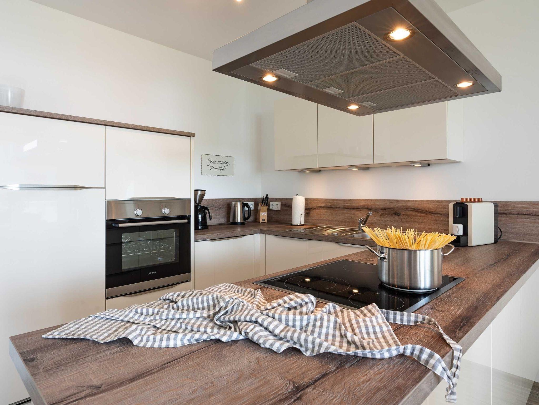 Diese luxuriöse 4-Zimmer-Wohnung im ersten Obergeschoss von Haus 1 (Aufzug vorhanden) mit Platz für maximal 6 Personen sowie einem Kleinkind bis 2 Jahre im Babybett verfügt über eine Wohnfläche von 119 m² und hat 3 Schlafzimmer sowie 2 voll ausgestattete Duschbäder. Die große Sonnenterrasse mit 17 m² liegt in idealer Süd-Ausrichtung. Die Wohnung ist modern eingerichtet mit offenem Wohn-Essbereich, großem Esstisch, Ledersofa sowie Flat-TV (inkl. Sky-Abo). Die hochwertig ausgestattete Küche, offen zum Wohnbereich, lässt keine Wünsche offen. Erholsamer Schlaf in den beiden Schlafzimmern mit Boxspringbetten und Flat-TV ist garantiert. Im dritten Schlafzimmer befindet sich ein bequemes Schlafsofa (Liegefläche: 1,80 x 2,00 m) und ein Flat-TV. Das Badezimmer en Suite ist mit einer begehbaren Dusche ausgestattet. Auf der großen, überdachten Sonnenterrasse mit Essgruppe und jeweils zwei Relax-Sesseln mit Fußhockern sowie einem Sonnenschirm können Sie die Seele baumeln lassen.