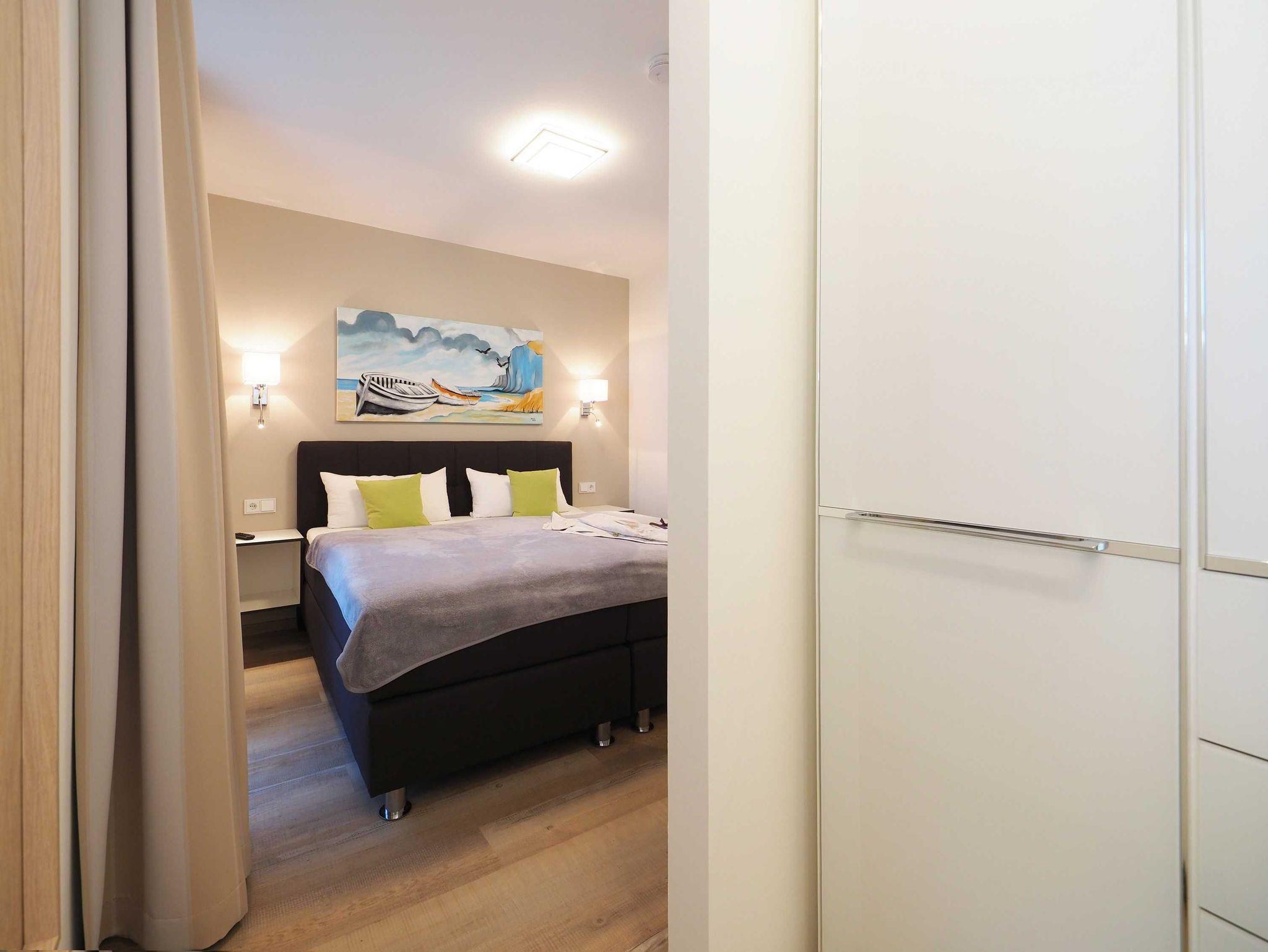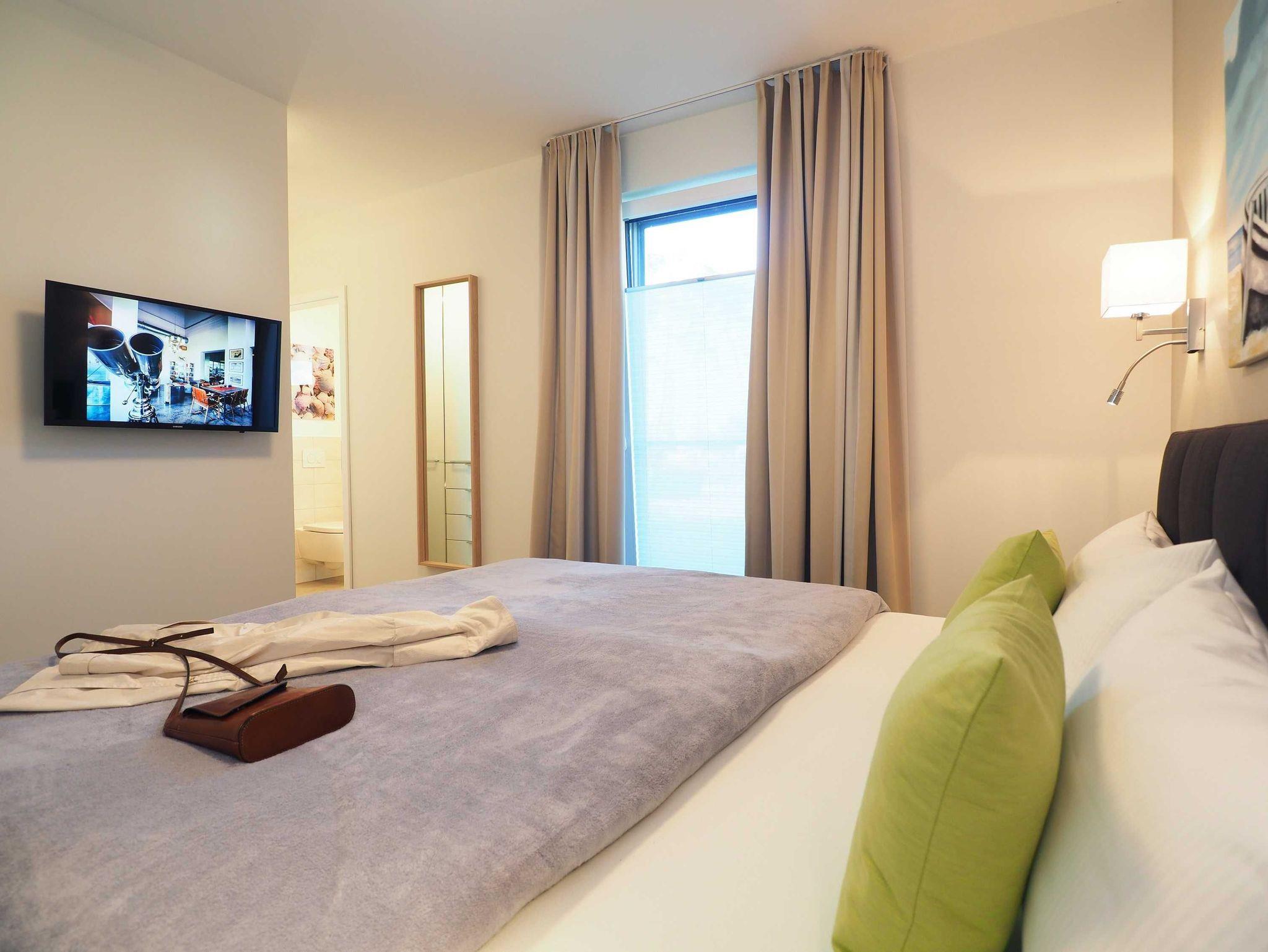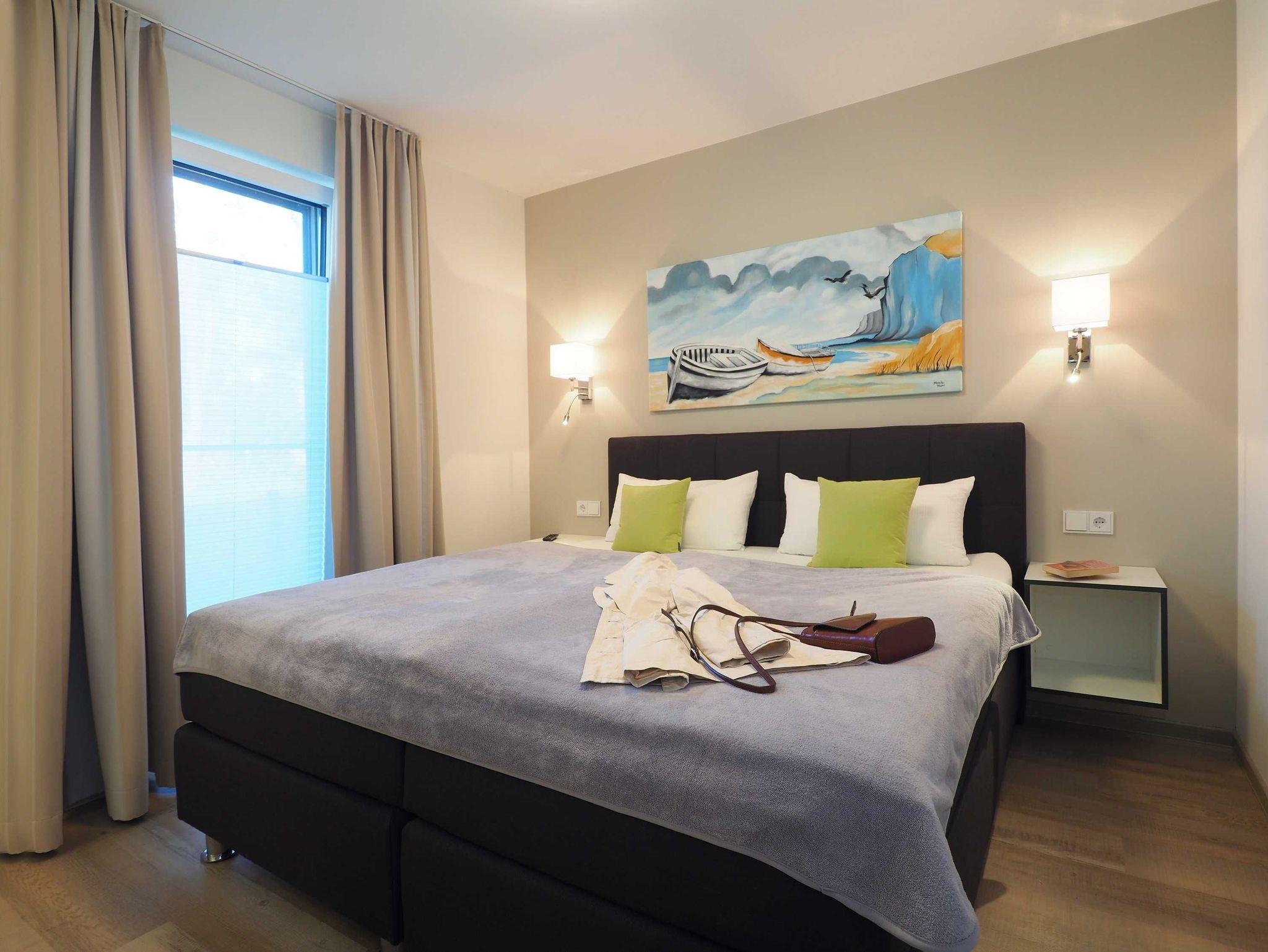 Diese luxuriöse 4-Zimmer-Wohnung im Erdgeschoss von Haus 5 mit Platz für maximal 6 Personen verfügt über eine Wohnfläche von 100 m² und hat 3 Schlafzimmer sowie 2 voll ausgestattete Duschbäder. Die große Sonnenterrasse mit 21 m² liegt in idealer Süd-Ausrichtung. Die Wohnung ist modern eingerichtet mit offenem Wohn-Essbereich, großem Esstisch, Ledersofa sowie Smart-TV (inkl. Sky-Abo). Die hochwertig ausgestattete Küche, offen zum Wohnbereich, lässt keine Wünsche offen. Erholsamer Schlaf in den beiden Schlafzimmern mit Boxspringbetten und Smart-TV ist garantiert. Im dritten Schlafzimmer befindet sich ein bequemes Schlafsofa (Liegefläche: 1,60 x 2,00 m), Schreibtisch und Smart-TV. Das Badezimmer en Suite ist mit einer begehbaren Dusche ausgestattet. Auf der großen, überdachten Sonnenterrasse mit Essgruppe und jeweils zwei Relax-Sesseln, Fußhockern, Sonnenschirm und Sonnenliegen können Sie die Seele baumeln lassen.