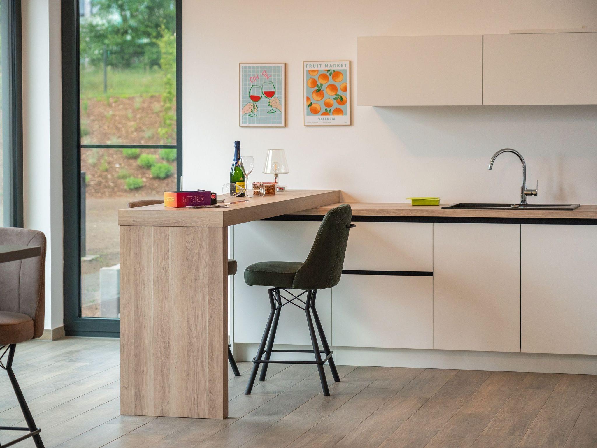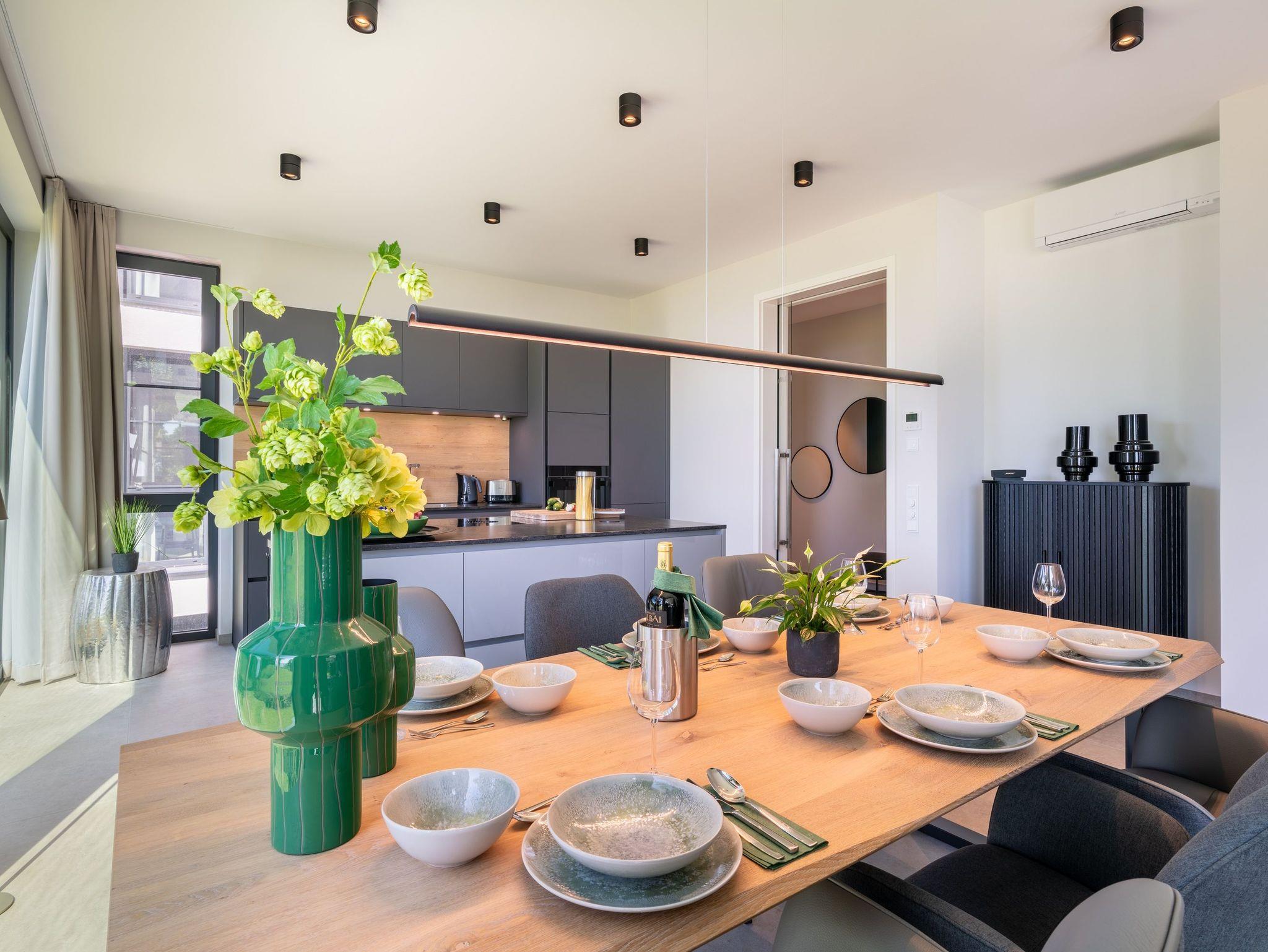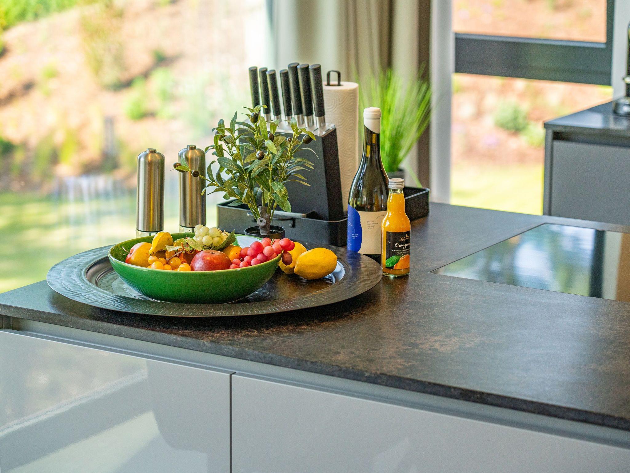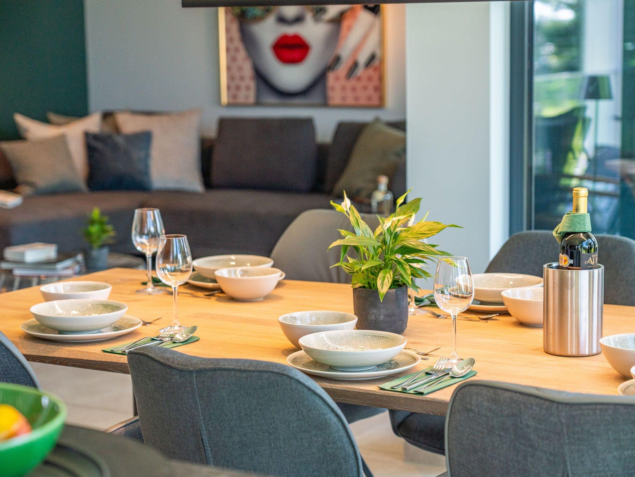 Die offen gestaltete Design-Küche ist voll ausgestattet: Induktionskochfeld, Backofen, Mikrowelle, Geschirrspüler, Kühlschrank mit Gefrierfach sowie Nespresso-Espressomaschine, Küchenutensilien, Geschirr, Gläser und Gewürze ? es fehlt an nichts. Zwei separate Essbereiche ? im Wohnzimmer und im Esszimmer ? ermöglichen gemeinsame Mahlzeiten in stilvollem Ambiente.