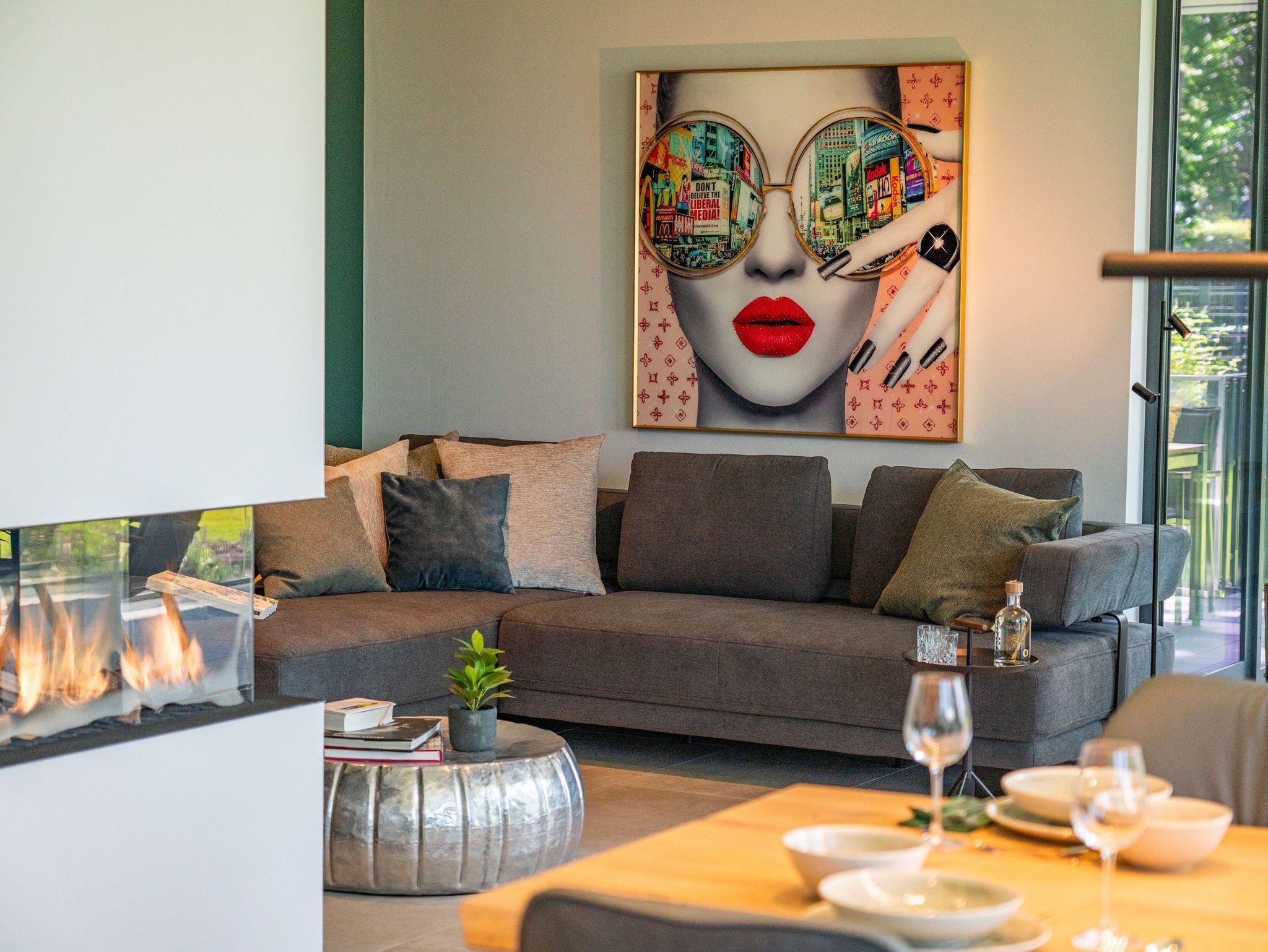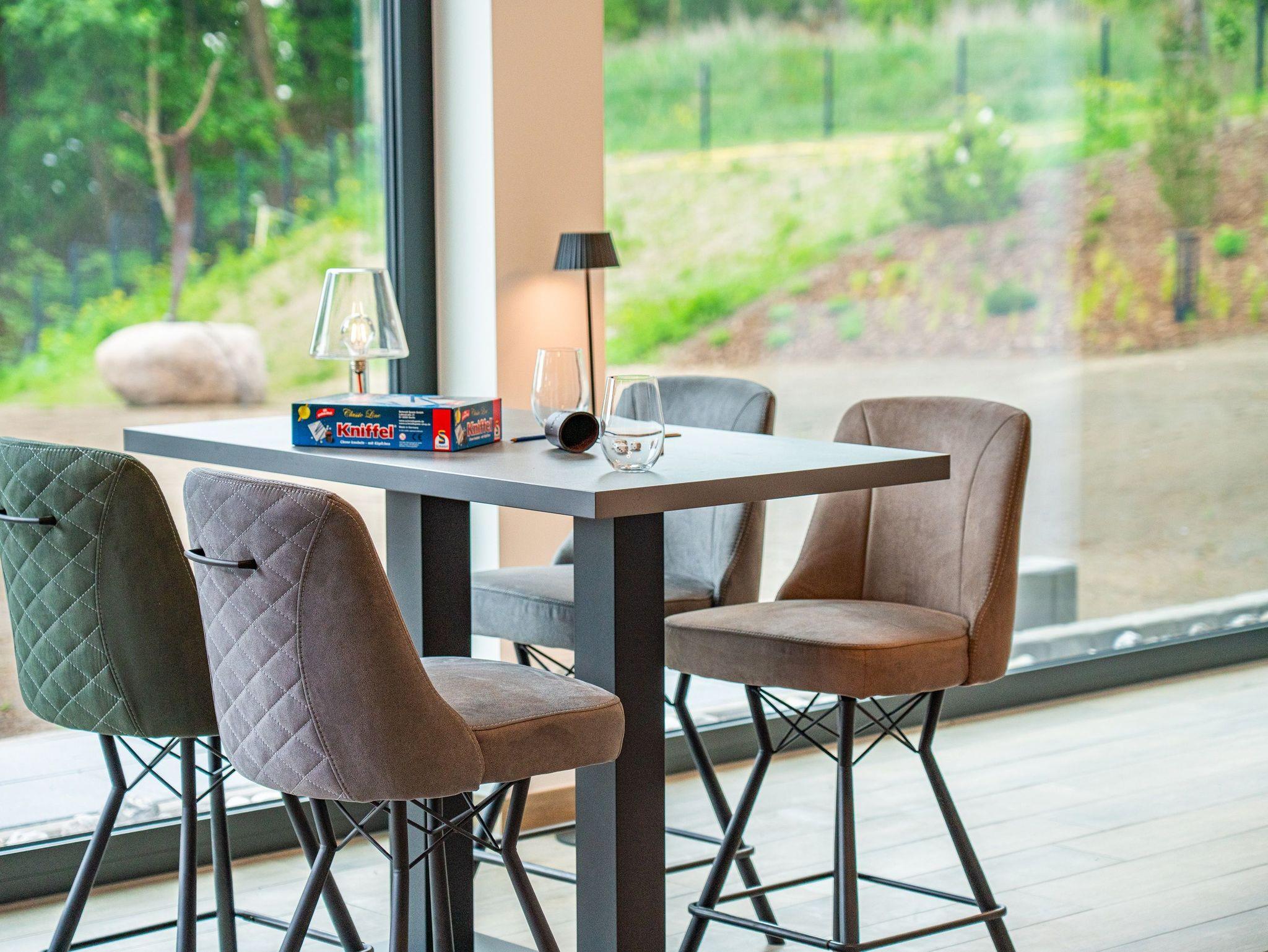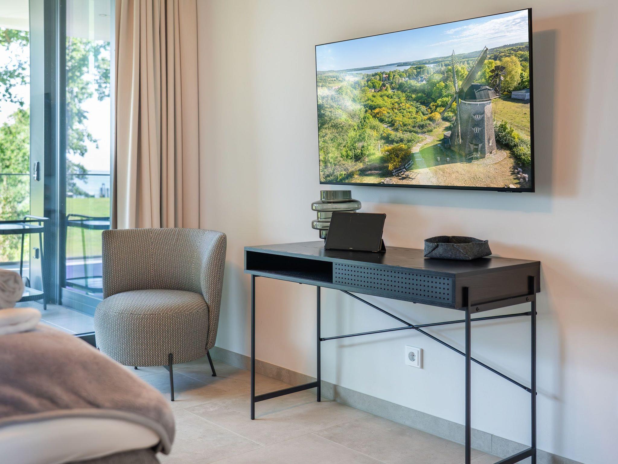 Der offen gestaltete Wohnbereich lädt mit komfortabler Sofaecke, stilvollen Sesseln und einem Esstisch zum Verweilen ein. Insgesamt vier Fernseher mit Kabelanschluss und digitalem Empfang stehen für Ihre Unterhaltung bereit. Ein leistungsstarkes WLAN ermöglicht ungestörtes Arbeiten und Streaming.