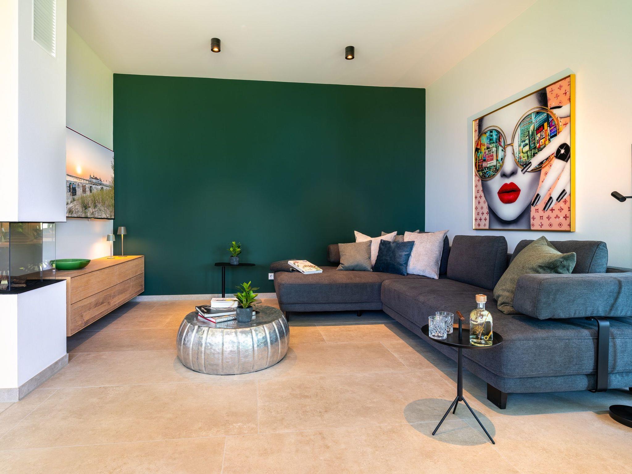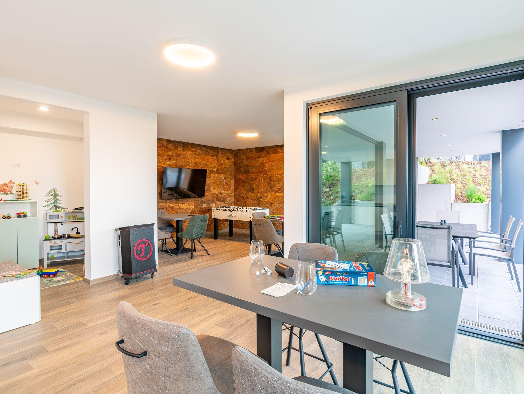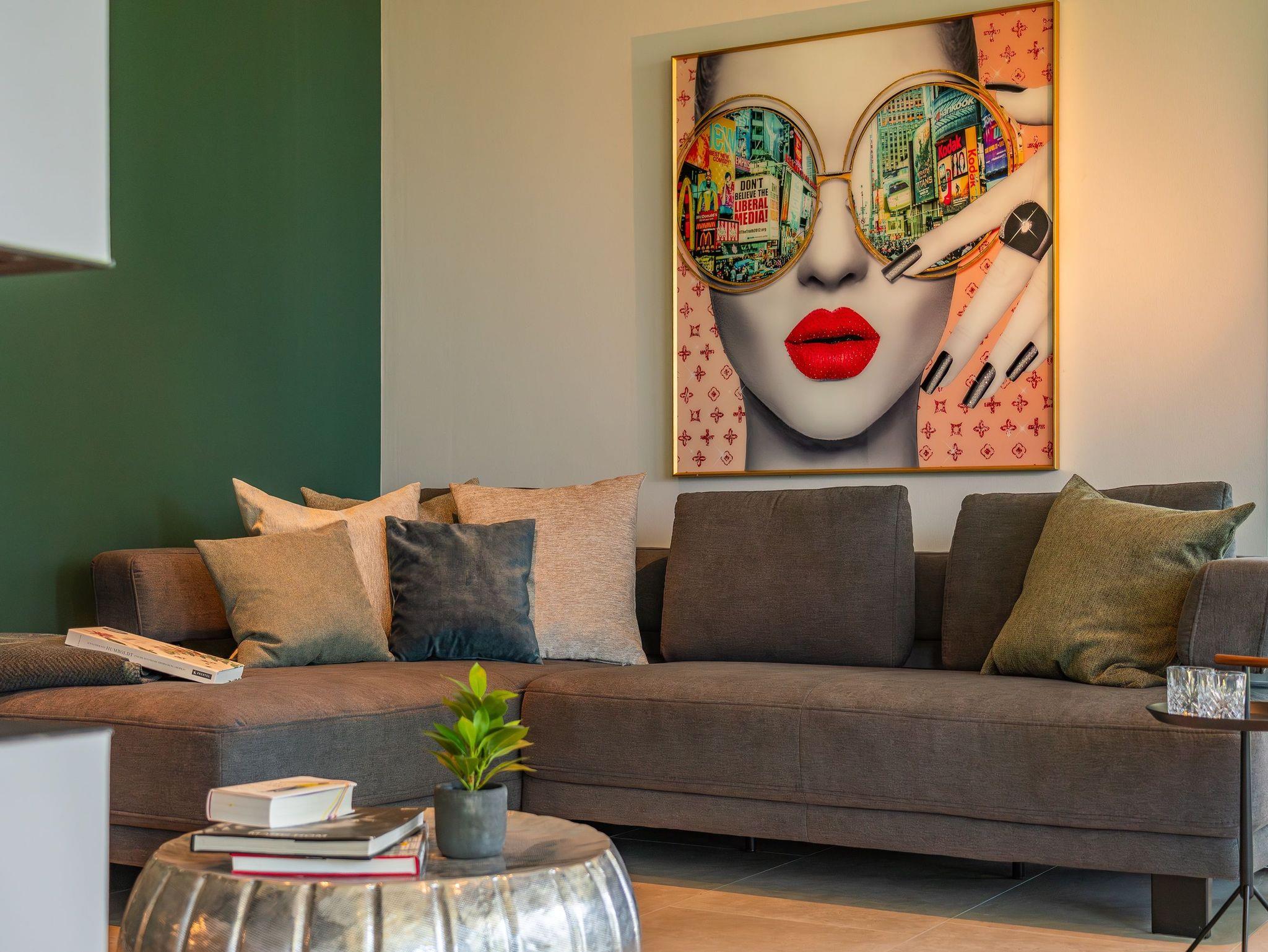 Der offen gestaltete Wohnbereich lädt mit komfortabler Sofaecke, stilvollen Sesseln und einem Esstisch zum Verweilen ein. Insgesamt vier Fernseher mit Kabelanschluss und digitalem Empfang stehen für Ihre Unterhaltung bereit. Ein leistungsstarkes WLAN ermöglicht ungestörtes Arbeiten und Streaming.