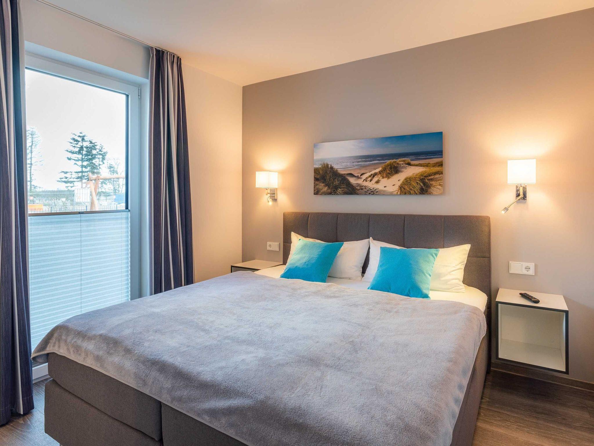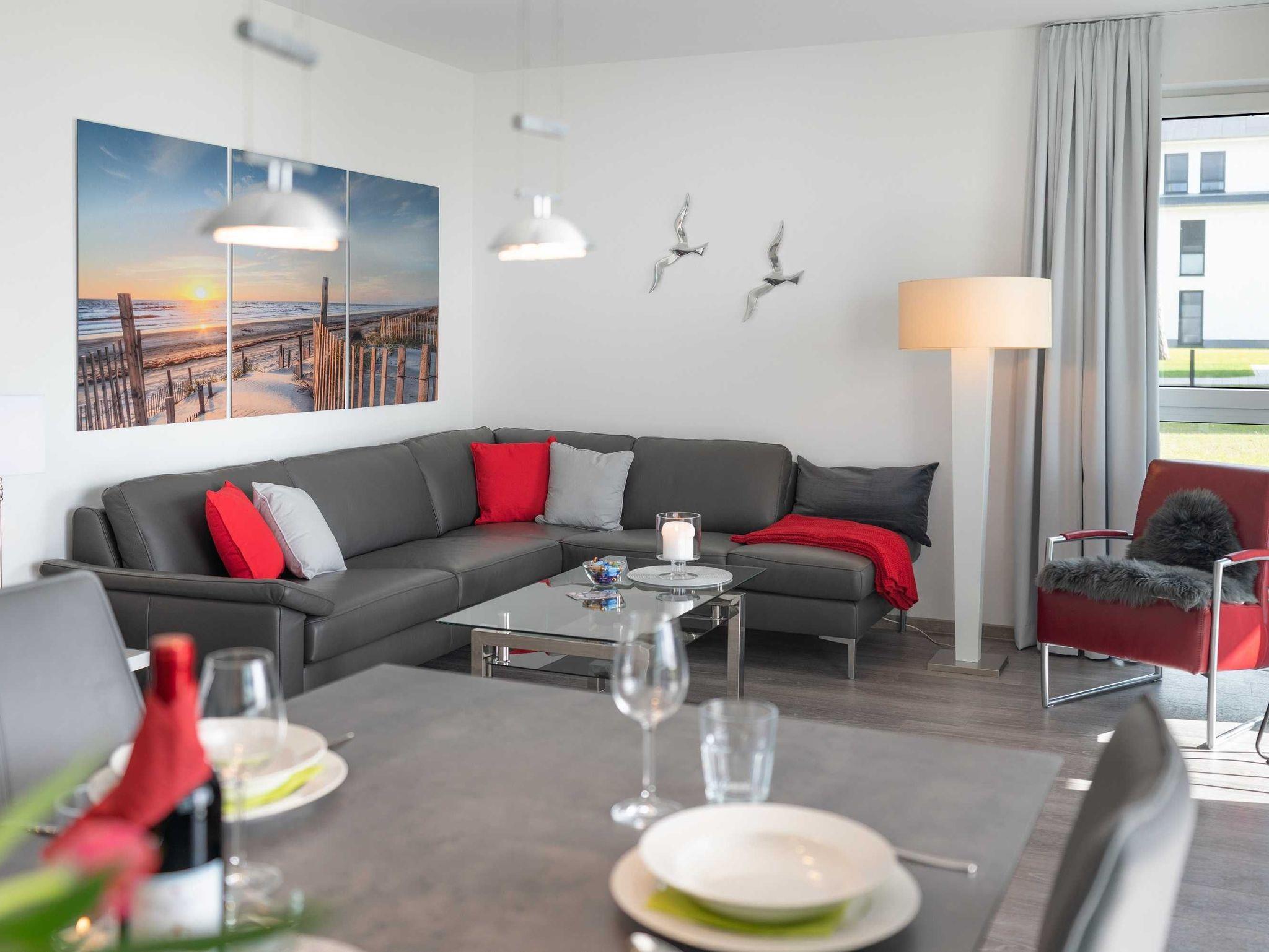 Diese luxuriöse 4-Zimmer-Wohnung im Erdgeschoss von Haus 6 mit Platz für maximal 6 Personen verfügt über eine Wohnfläche von 100 m² und hat 3 Schlafzimmer sowie 2 voll ausgestattete Duschbäder. Die große Sonnenterrasse mit 21 m² liegt in idealer Süd-Ausrichtung. Die Wohnung ist modern eingerichtet mit offenem Wohn-Essbereich, großem Esstisch, Ledersofa sowie Smart-TV (inkl. Sky-Abo). Die hochwertig ausgestattete Küche, offen zum Wohnbereich, lässt keine Wünsche offen. Erholsamer Schlaf in den beiden Schlafzimmern mit Boxspringbetten und Smart-TV ist garantiert. Im dritten Schlafzimmer befindet sich ein bequemes Schlafsofa (Liegefläche: 1,60 x 2,00 m) und ein Smart-TV. Das Badezimmer en Suite ist mit einer begehbaren Dusche ausgestattet. Auf der großen, überdachten Sonnenterrasse mit Essgruppe und jeweils zwei Relax-Sesseln, Fußhockern, Sonnenschirm und Sonnenliegen können Sie die Seele baumeln lassen.