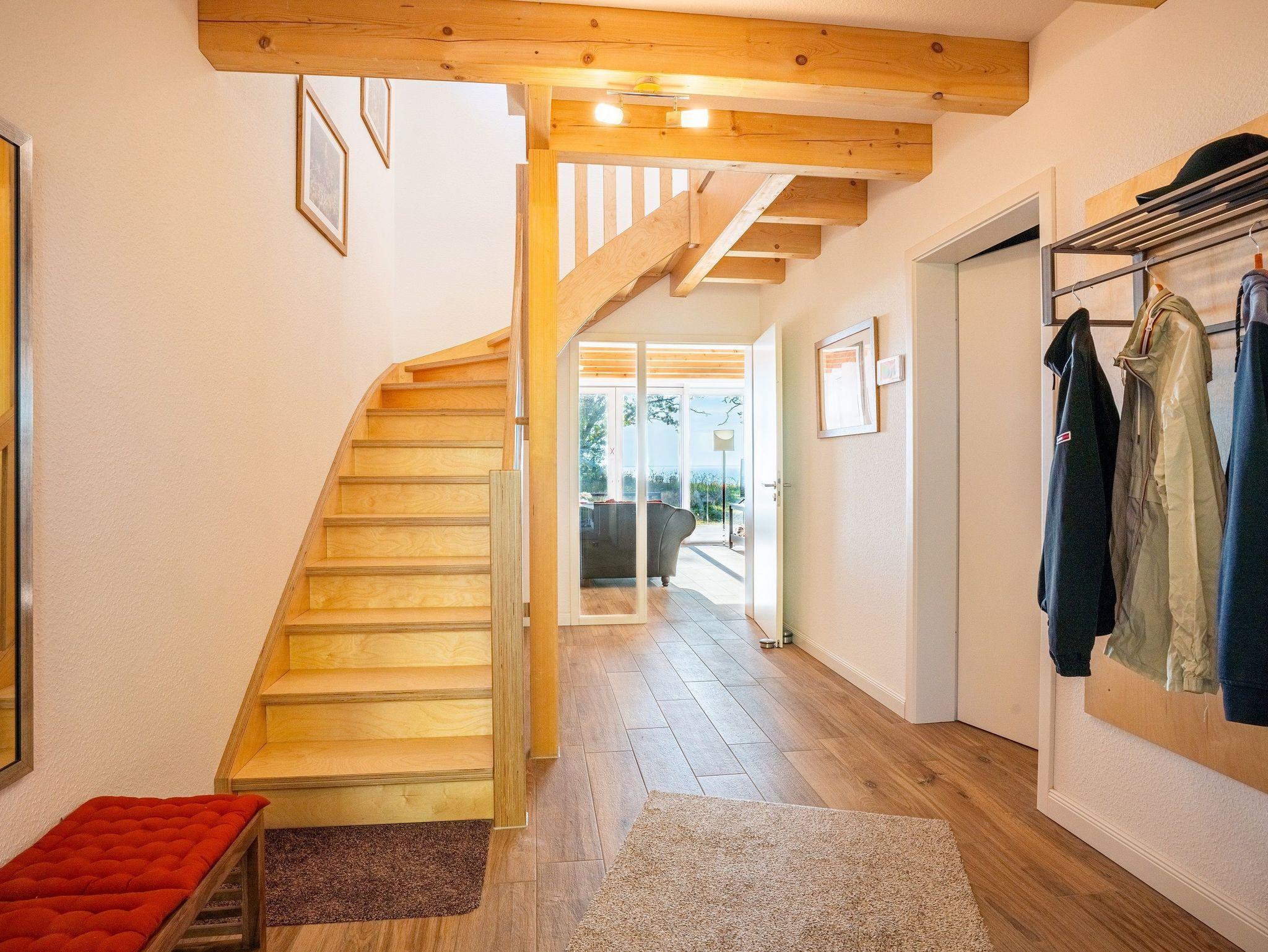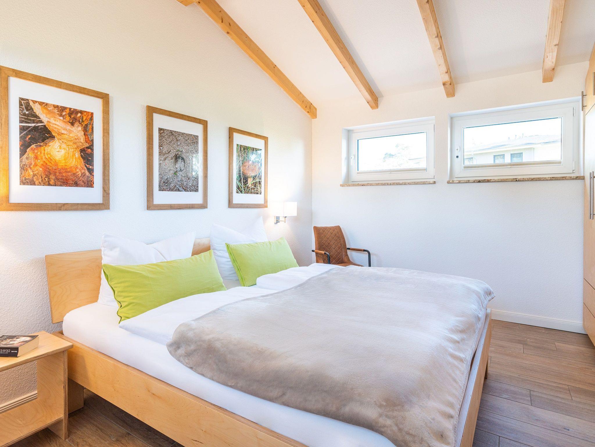 Über die schöne Holztreppe erreichen Sie das Obergeschoss. Hier steht Ihnen ein weiteres Wohnzimmer zur Verfügung. Der großartige Blick auf das Haff durch die bodentiefen Fenster wird Sie jeden Tag verzaubern. Im Obergeschoss befindet sich das zweite Schlafzimmer mit Doppelbett (1,80 x 2,00 m) sowie ein WC.