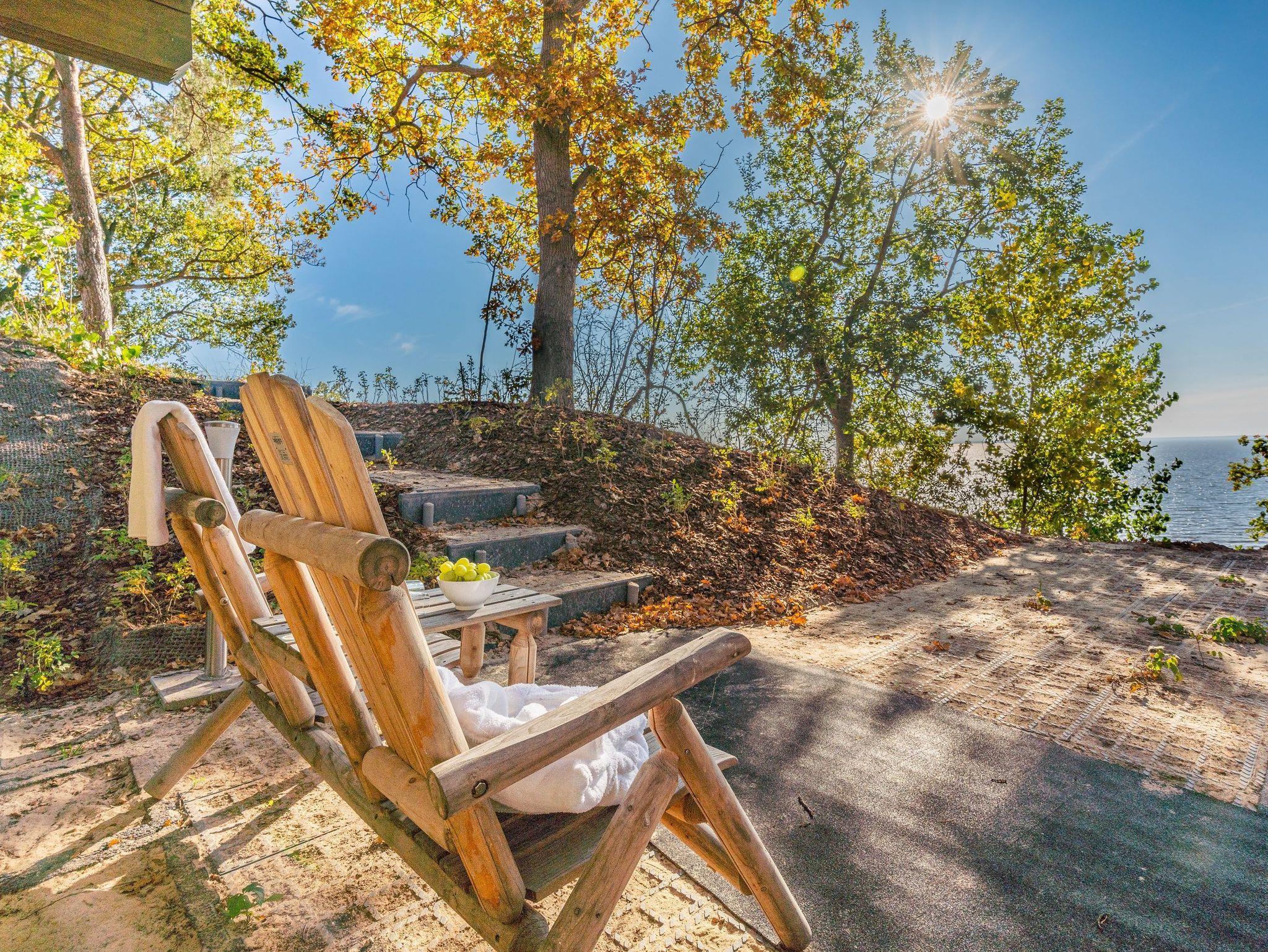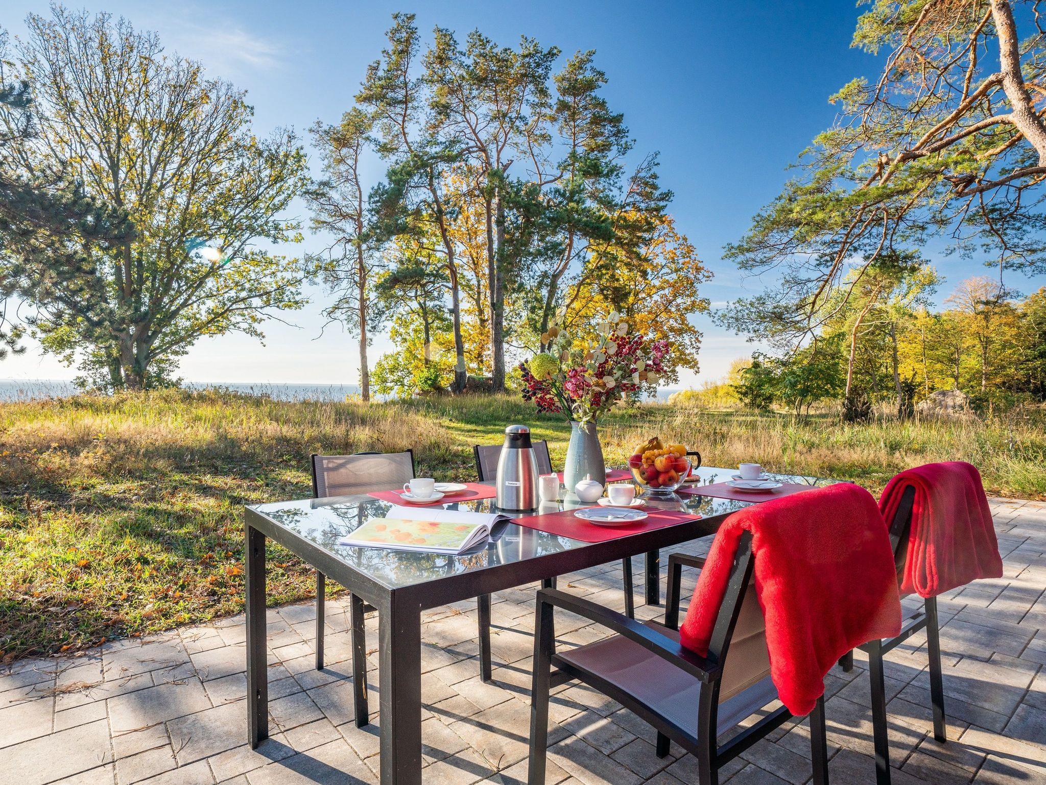 Im Sommer laden Sitzplätze und Sonnenliegen auf der ca. 50 m² großen Südterrasse zum Entspannen ein. Ein Elektrogrill steht für genussvolles Essen zur Verfügung. Traumhafte Sonnenuntergänge genießen Sie am besten bei einem Glas Wein direkt an der Kliffkante. Vom Esszimmer aus betreten Sie die ca. 20 m² große Westterrasse. Somit können Sie je nach Sonnenstand Ihren Aufenthalt im Freien genießen. Das 8.000 m² große und zum Haff nicht gezäunte Grundstück ist weitestgehend naturbelassen (keine Zierrasenfläche) und wird gern von Wild und Vögeln aller Art besucht. Hier darf wachsen, was der Boden hergibt.