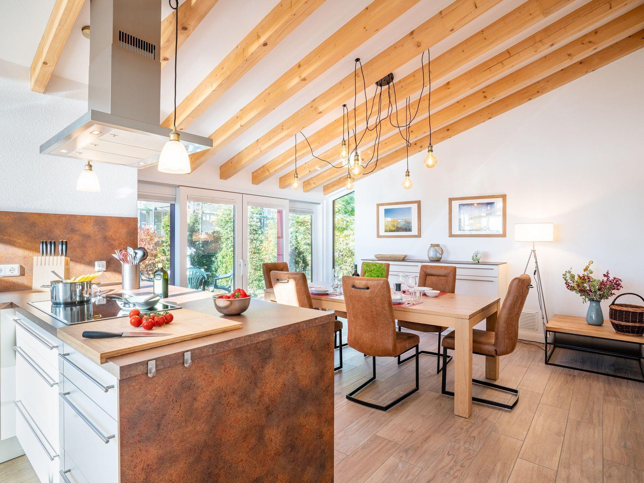 Der große Koch- und Essbereich ist vom Wohnzimmer aus zu betreten und nach Südwesten ausgerichtet. Er verfügt über Geschirrspüler, Induktionskochfeld, Mikrowelle und Kühl-/Gefrierkombination.