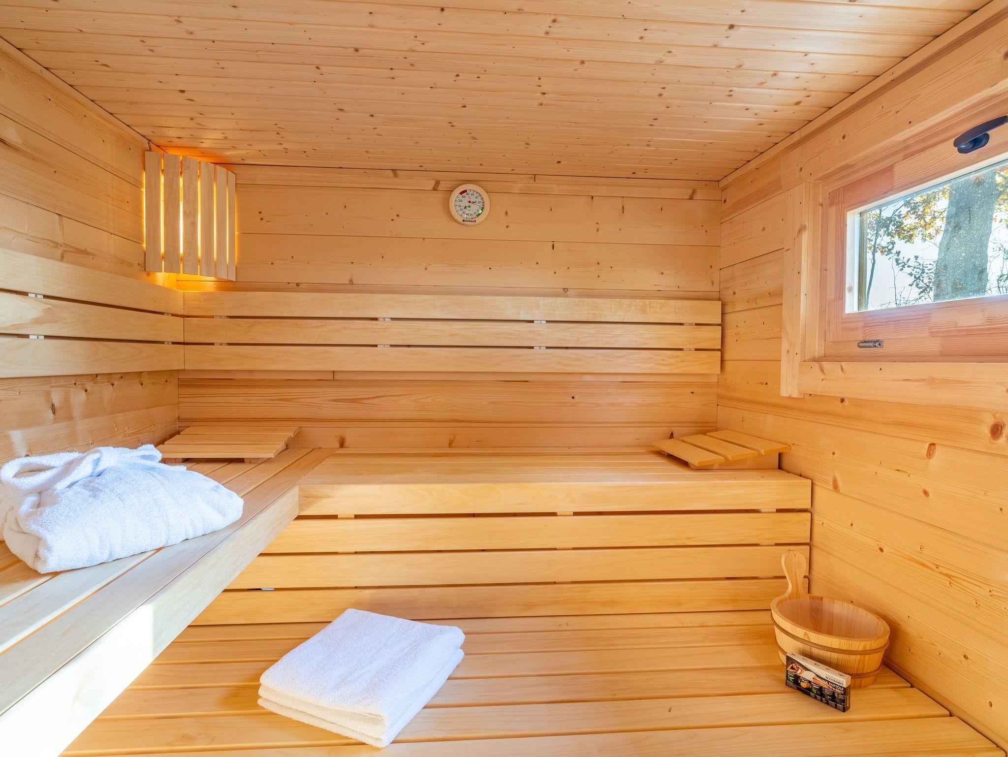 Am Grundstücksrand in Richtung Haffkante steht Ihnen eine finnische Blockhaussauna mit Elektroofen, Umkleideraum, Gartendusche und einem ebenfalls beeindruckenden Ausblick auf das Haff zur Verfügung.