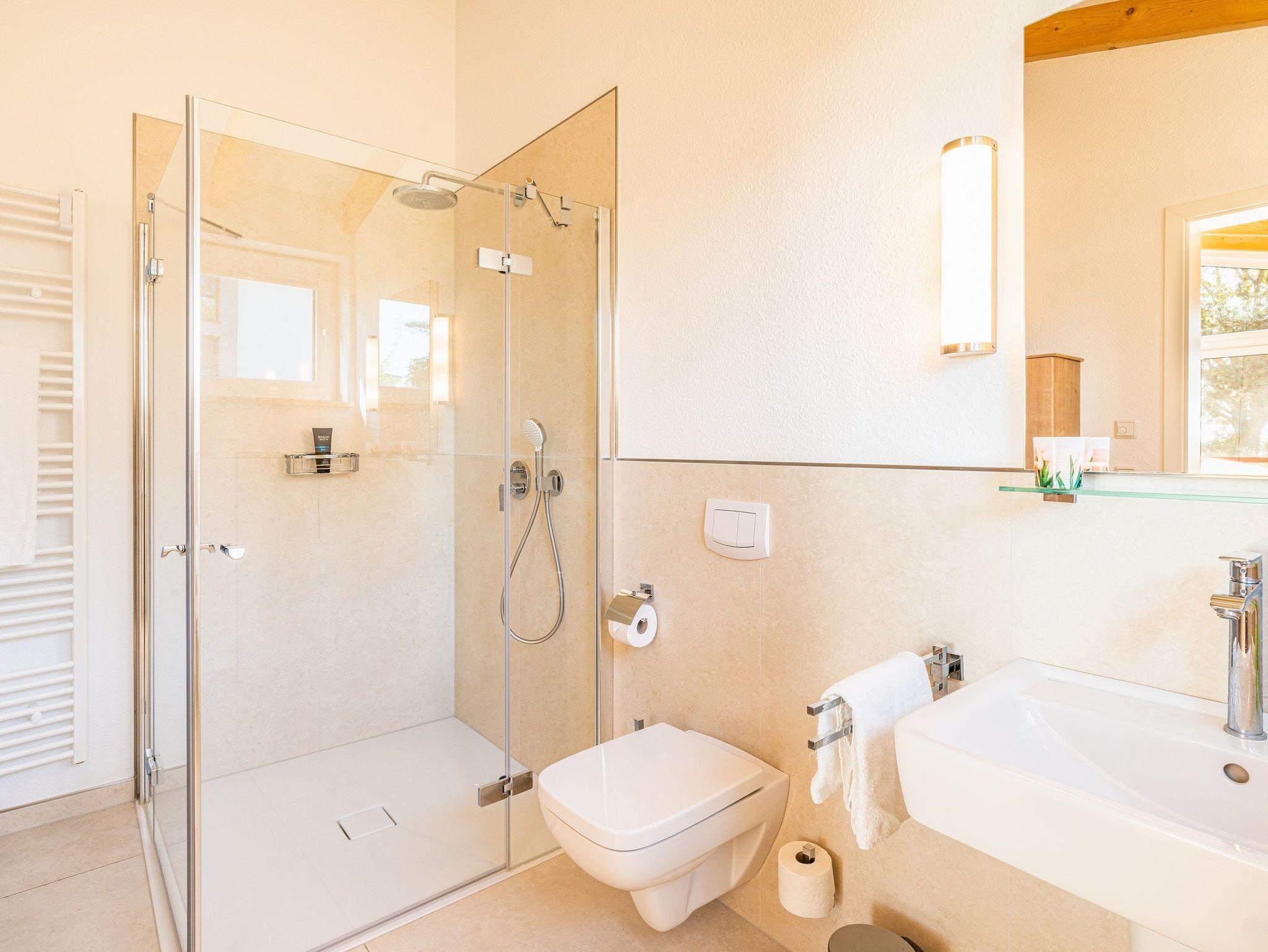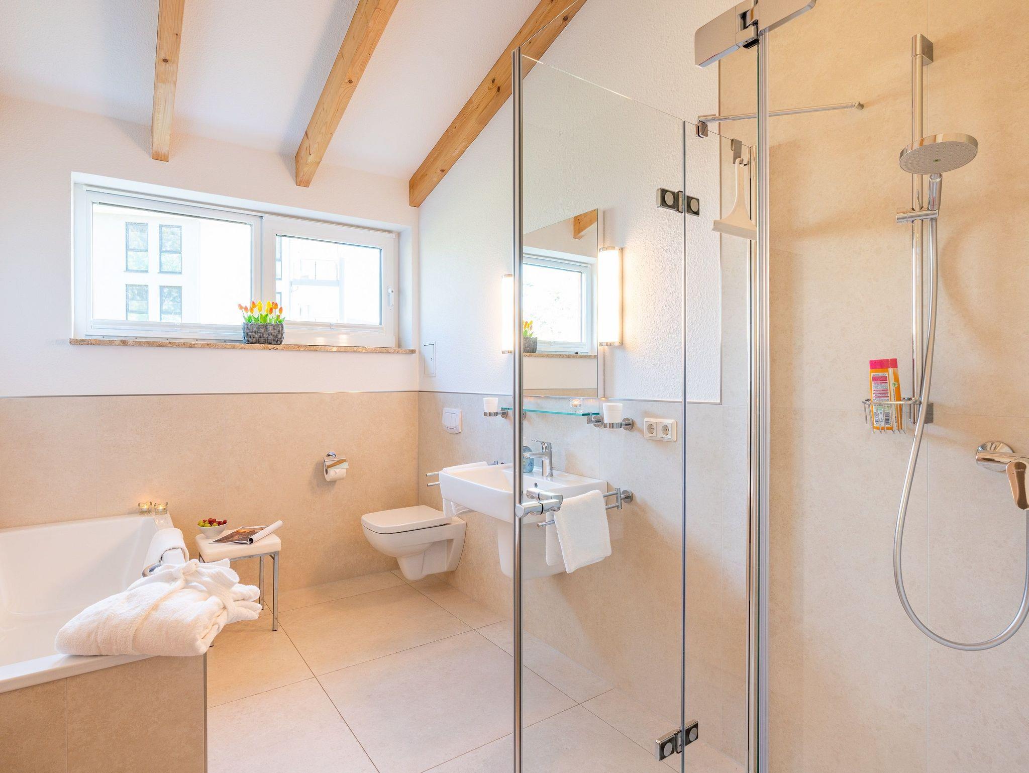Auf der gegenüberliegenden Seite des Wohnzimmers erreichen Sie das erste Schlafzimmer (Doppelbett 1,80 x 2,00 m, Höhe 56 cm) mit anschließendem Bad, in dem sich eine bodengleiche Dusche (1,20 x 1,20 m) und ein unterfahrbares Waschbecken befinden. Das Erdgeschoss ist bewusst barrierefrei gebaut und somit ein geeignetes Feriendomizil für Rollstuhlfahrerinnen und Rollstuhlfahrer. Das zweite Duschbad mit ebenerdiger Dusche (1,00 x 1,00 m), Badewanne und unterfahrbarem Waschbecken befindet sich ebenfalls im Erdgeschoss. Die Höhe des WCs beträgt 43 cm.