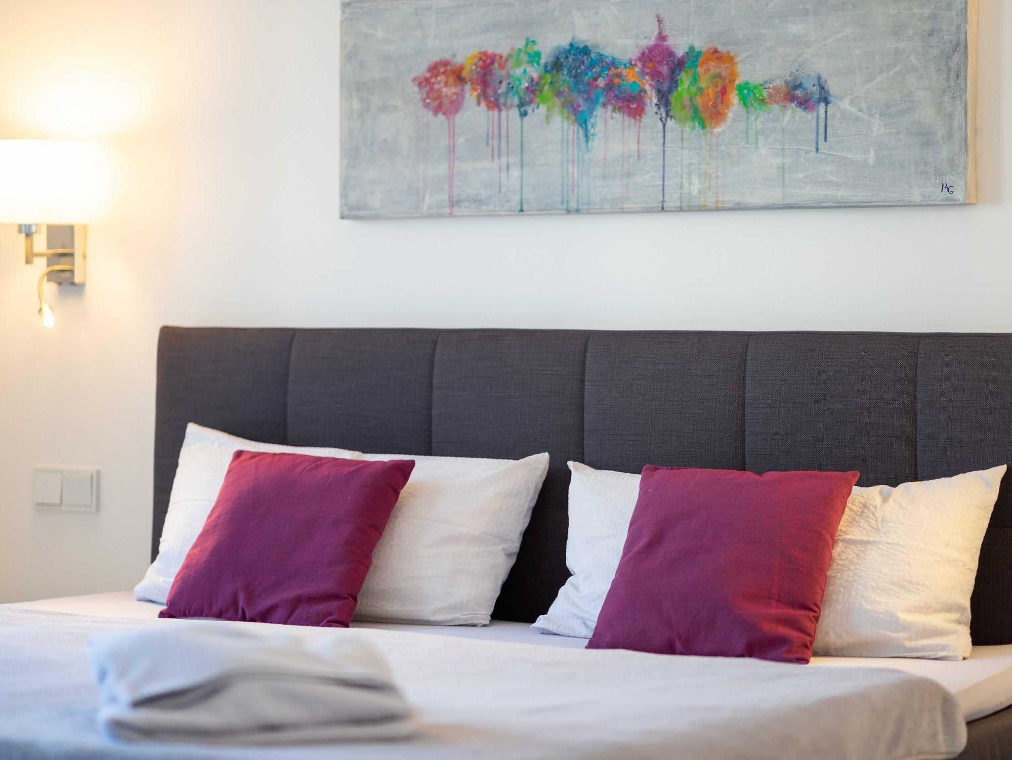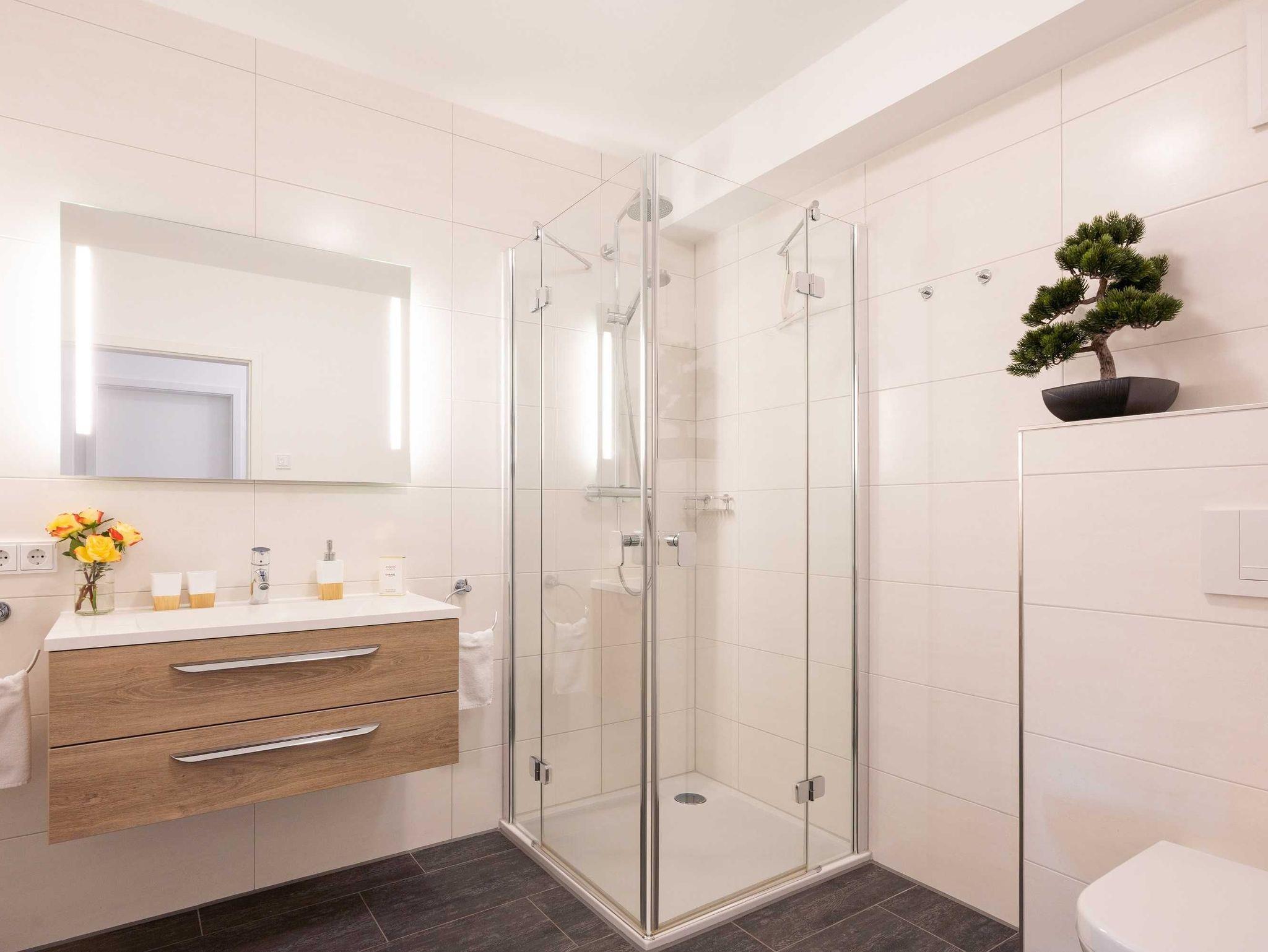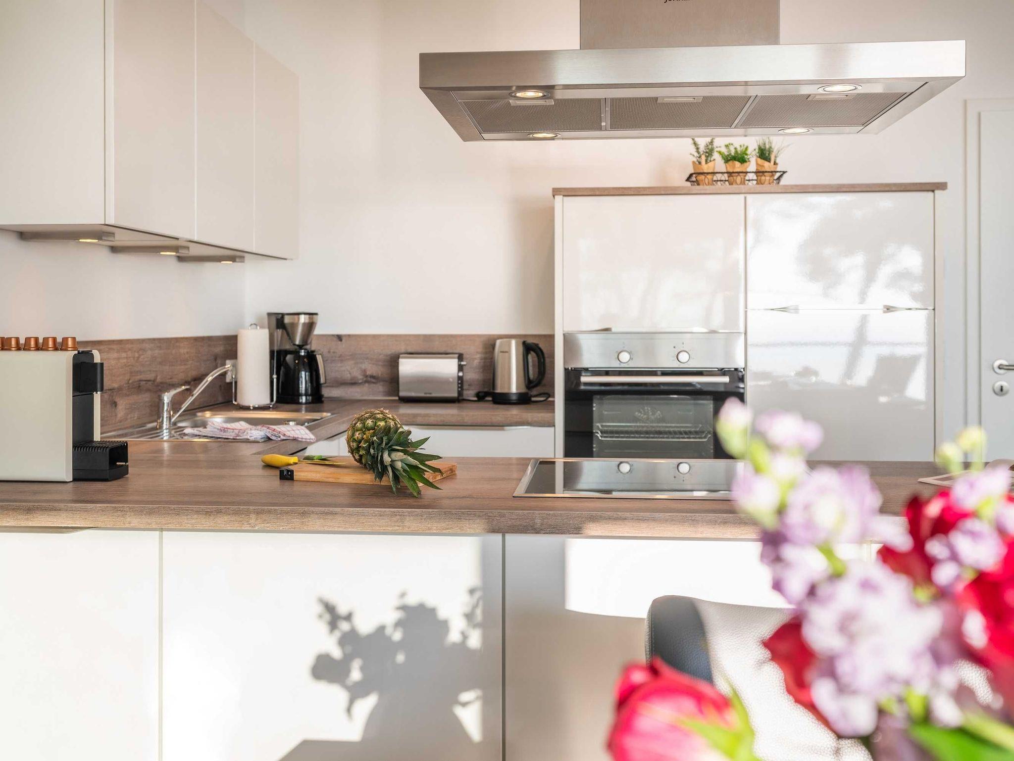 Diese luxuriöse 4-Zimmer-Wohnung im ersten Obergeschoss von Haus 2 (Aufzug vorhanden) mit Platz für maximal 6 Personen sowie einem Kleinkind bis 2 Jahre im Babybett verfügt über eine Wohnfläche von 119 m² und hat 3 Schlafzimmer sowie 2 voll ausgestattete Duschbäder. Die große Sonnenterrasse mit 17 m² liegt in idealer Süd-Ausrichtung. Die Wohnung ist modern eingerichtet mit offenem Wohn-Essbereich, großem Esstisch, Ledersofa sowie Flat-TV (inkl. Sky-Abo). Die hochwertig ausgestattete Küche, offen zum Wohnbereich, lässt keine Wünsche offen. Erholsamer Schlaf in den beiden Schlafzimmern mit Boxspringbetten und Smart-TV ist garantiert. Im dritten Schlafzimmer befindet sich ein bequemes Schlafsofa (Liegefläche: 1,80 x 2,00 m) und ein Flat-TV. Das Badezimmer en Suite ist mit einer begehbaren Dusche ausgestattet. Auf dem großen, überdachten Sonnenbalkon mit Essgruppe und zwei Relax-Sesseln, Fußhockern sowie einem Sonnenschirm können Sie die Seele baumeln lassen.