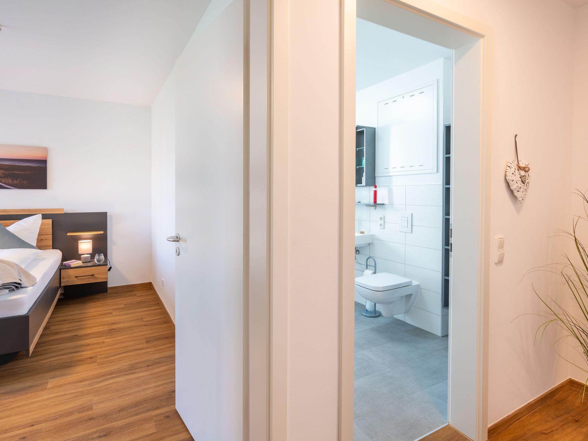 Informationen für Gäste mit Mobilitätseinschränkung: Der Zugang vom Parkplatz zum Hauseingang ist barrierefrei. Die Distanz vom Parkplatz zur Haustür beträgt etwa 30 Meter. Die Breite der Haustür beträgt 100 cm. Die Dichtigkeitsschwelle der Haustür ist etwa 1,5 cm hoch. Der Aufzug im Treppenhaus fährt jede Etage, auch die Saunalandschaft im Obergeschoss, an. Die Türbreite des Aufzugs beträgt 90 cm, die Tiefe beträgt 130 cm. Die Wohnungstür weist eine Breite von 90 cm auf. Die Breiten der Zimmertüren liegen bei 80 cm (Ausnahme: Türbreite von der Abstellkammer beträgt 70 cm). Im Badezimmer beträgt die Breite der Duschtür etwa 75 cm, die Dichtigkeitsschwelle ist etwa 0,5 cm hoch. Die Duschkabine hat eine Maße von 100 x 100 cm. Auf Wunsch kann ein Duschhocker kostenfrei zur Verfügung gestellt werden. Der Waschtisch ist unterfahrbar. Haltegriffe sind nicht vorhanden. Das Bett weist eine Höhe von 60 cm auf und ist unterfahrbar (max. 15 cm). Die Terrassentür ist zweiflügelig und weist eine Schwelle von etwa 15 cm auf (nicht barrierefrei). Das an der Terrassentür befindliche Fliegengitterschiebeelement lässt die Balkontür auf eine Breite von etwa 70 cm öffnen. Die Schwelle von der gepflasterten Terrasse zur Rasenkante beträgt etwa 15 cm. Der Saunabereich im Dachgeschoss ist mit dem Aufzug erreichbar. Im Dachgeschoss ist eine Sauna mit dem Rollstuhl befahrbar, die Türbreite beträgt 90 cm. Für das Betreten der Dachterrassen müssen zwei Stufen passiert werden. Das Betreten des Südbalkons im Dachgeschoss ist barrierefrei möglich. Die Freizeitbereiche im Untergeschoss des Nachbarhauses sind komplett barrierefrei gestaltet. Die Türbreiten liegen bei 90 cm.