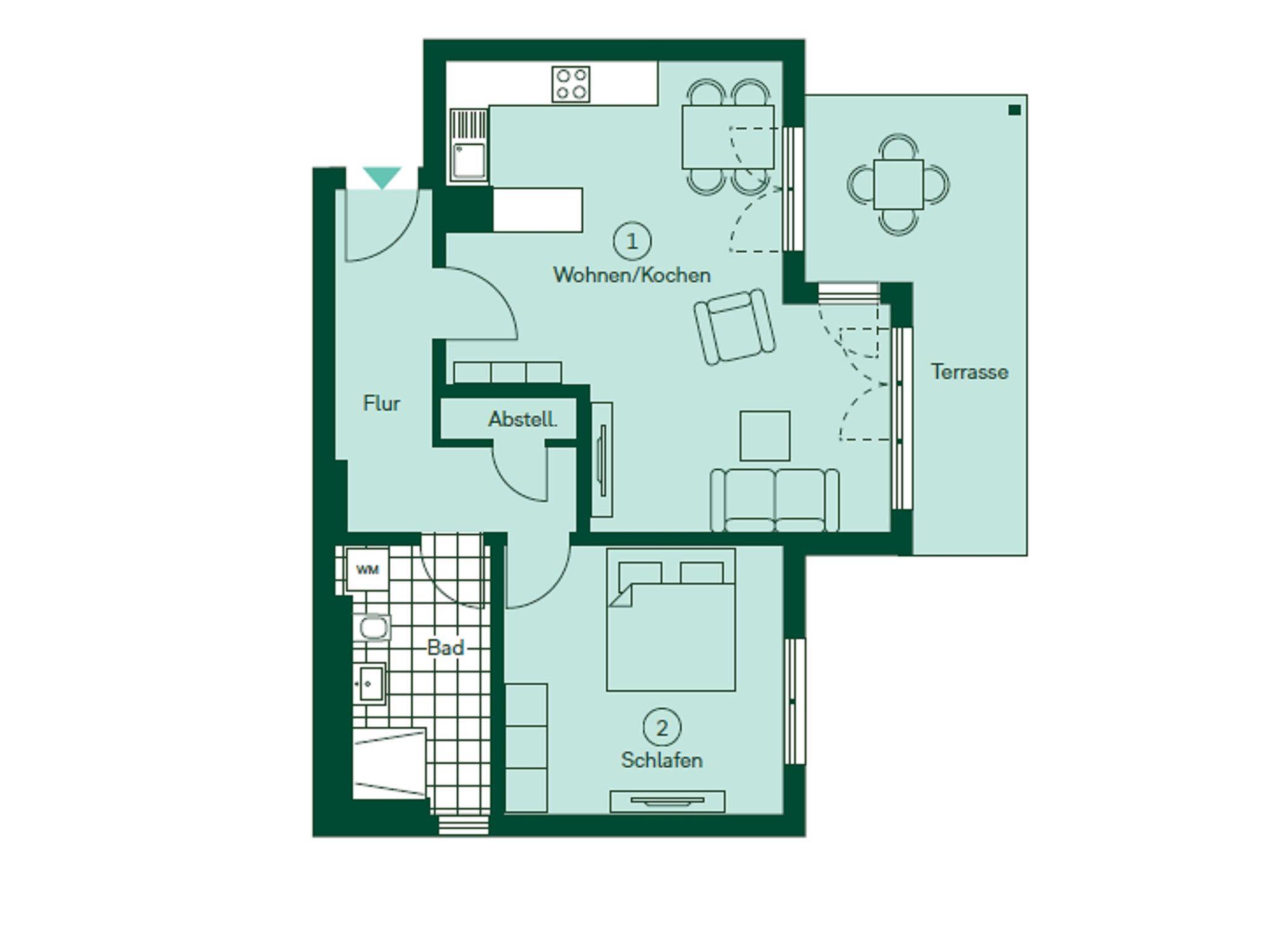 Der offen gestaltete Wohnbereich ist mit einem Sofa, zwei Sesseln mit Fußhockern und Smart-TV ausgestattet. Sie haben vom Wohnzimmer aus Zugang zur Südwest-Terrasse. Genießen Sie Ihre Speisen auf der möblierten Terrasse mit traumhaften Ausblicken in die Gartenanlage.
