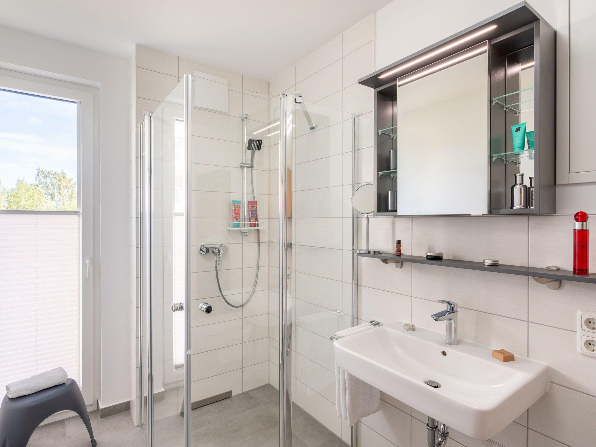 Das vollausgestattete Badezimmer verfügt über eine ebenerdige Dusche, WC, Waschtischanlage sowie Fön.