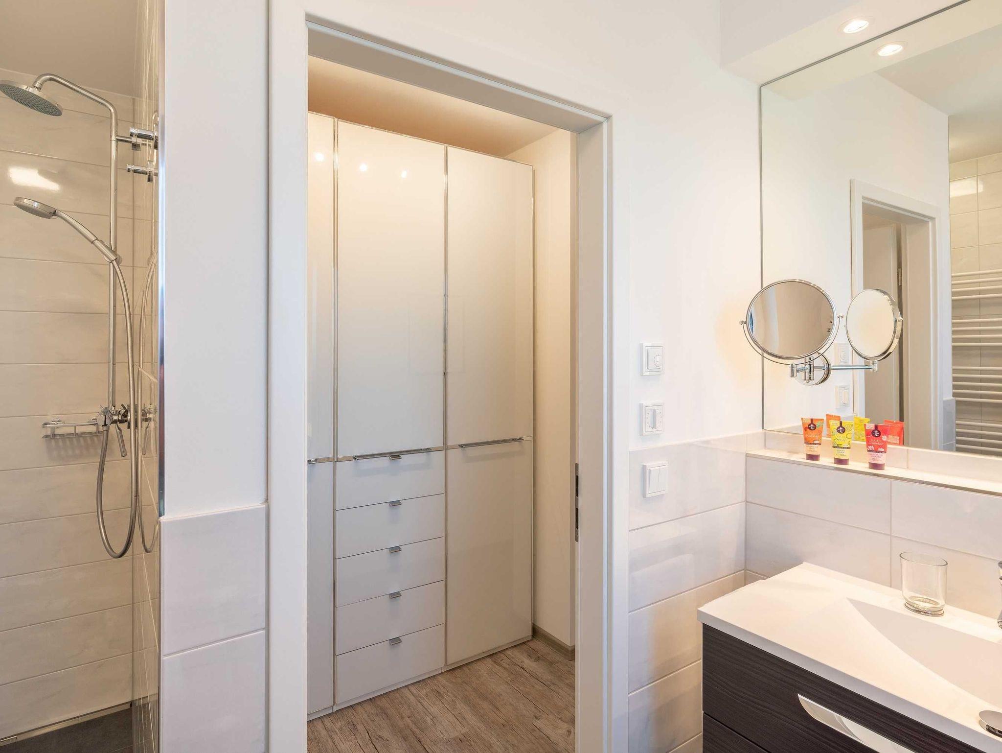 Diese lichtdurchflutete, helle 4-Zimmer-Wohnung im obersten Geschoss von Haus 7 (Aufzug vorhanden) mit Platz für maximal 6 Personen verfügt über eine Wohnfläche von 100 m² und hat 3 Schlafzimmer sowie 2 voll ausgestattete Duschbäder. Die große Sonnenterrasse mit 17 m² liegt in idealer Süd-Ausrichtung. Die Wohnung ist modern eingerichtet mit offenem Wohn-Essbereich, großem Esstisch, Ledersofa sowie Smart-TV (inkl. Sky-Abo). Die hochwertig ausgestattete Küche, offen zum Wohnbereich, lässt keine Wünsche offen. Erholsamer Schlaf in den beiden Schlafzimmern mit Boxspringbetten und Smart-TV ist garantiert. Im dritten Schlafzimmer befindet sich ein bequemes Schlafsofa (Liegefläche: 1,60 x 2,00 m) und ein Smart-TV. Das Badezimmer en Suite ist mit einer begehbaren Dusche ausgestattet. Auf dem großen, überdachten Sonnenbalkon mit Essgruppe und zwei Relax-Sesseln, Fußhockern sowie einem Sonnenschirm können Sie die Seele baumeln lassen.