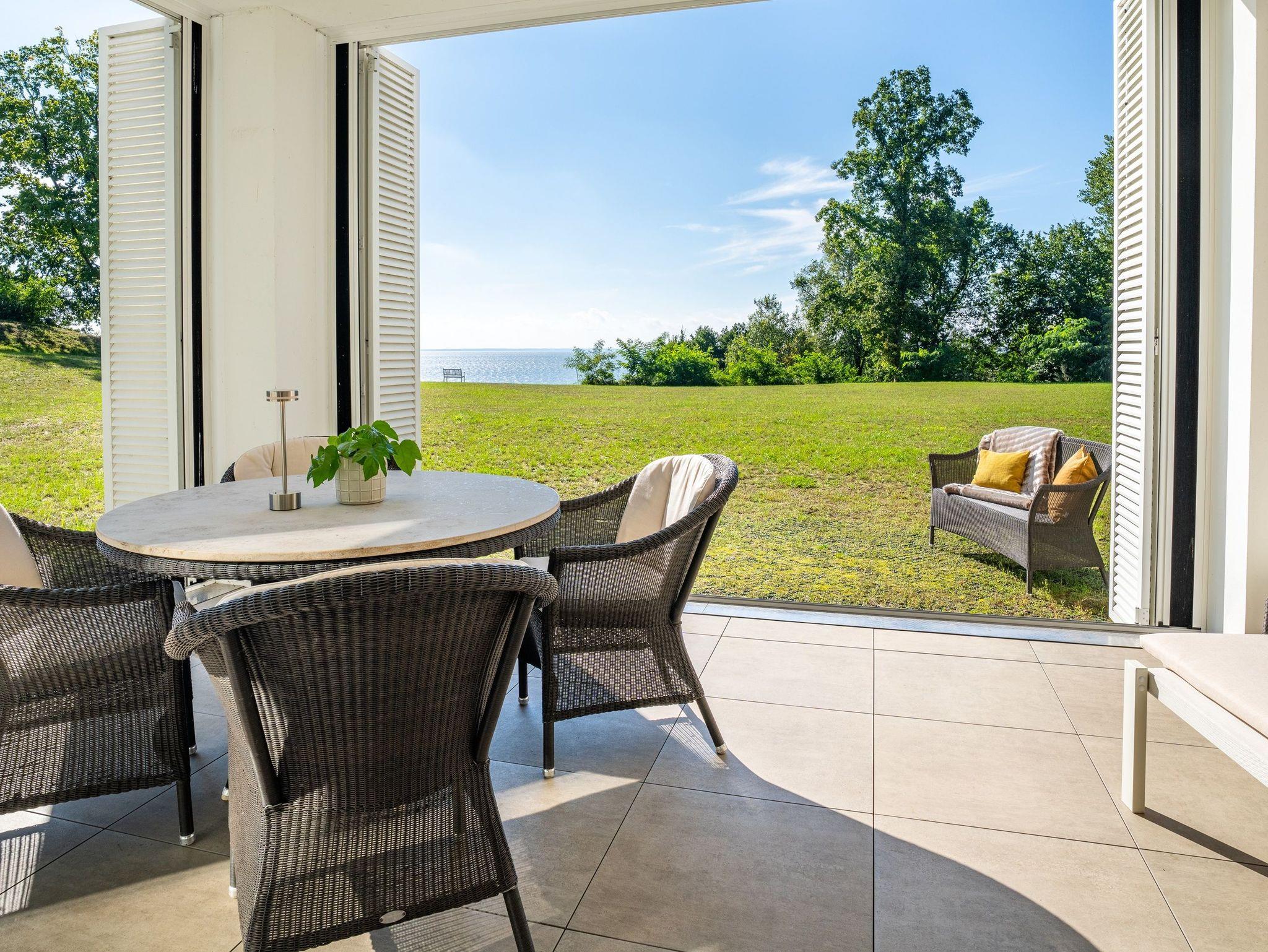 Die exklusive Terrassenwohnung Haffblick bietet atemberaubenden Blick auf das Stettiner Haff und eine private Sauna am Wasser.