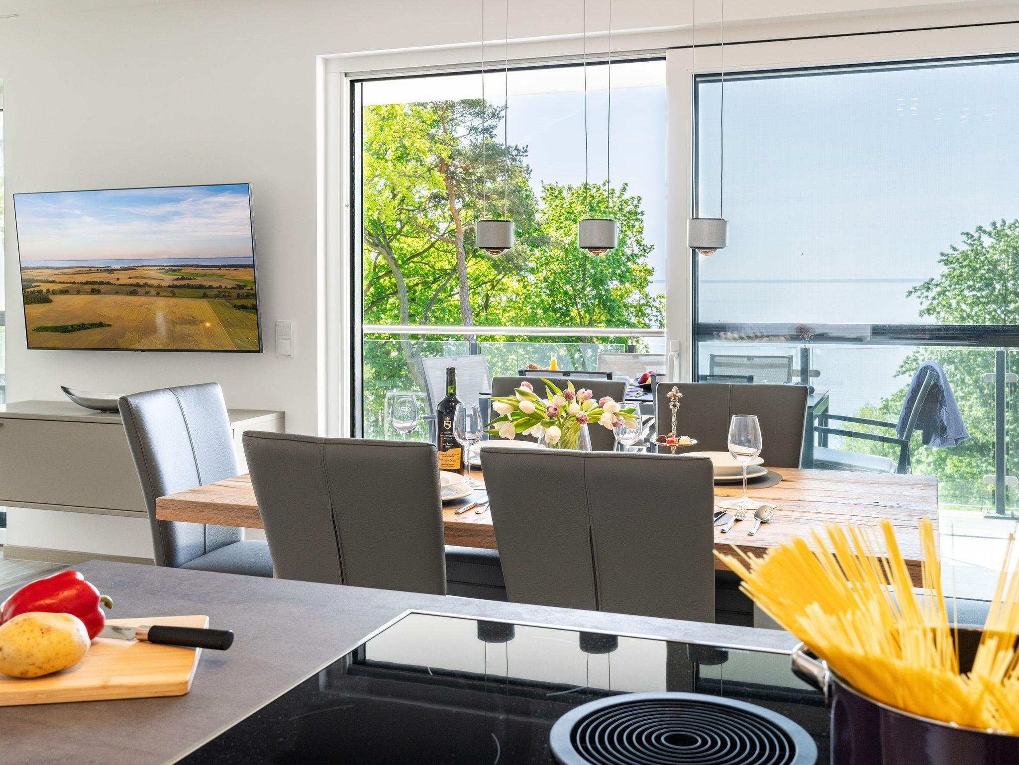 Das Induktionskochfeld mit Bora-Abzug ermöglicht Ihnen beim Kochen einen ungestörten Blick auf das Wasser ? einfach fantastisch!