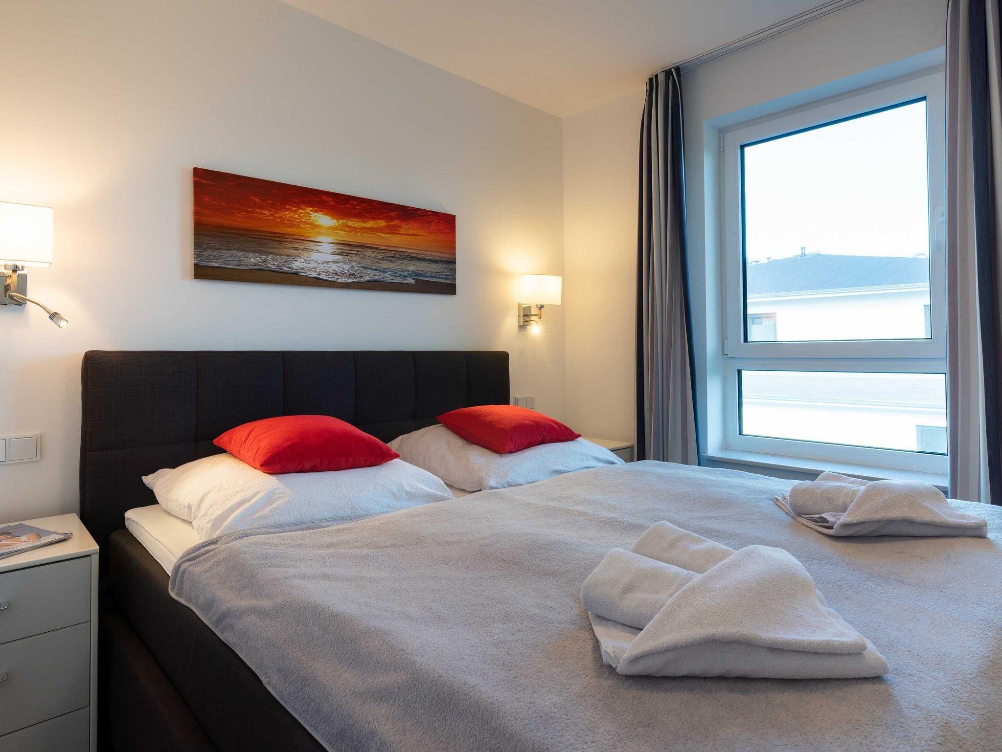 Diese lichtdurchflutete, helle 4-Zimmer-Wohnung im obersten Geschoss von Haus 2 (Aufzug vorhanden) mit Platz für maximal 6 Personen verfügt über eine Wohnfläche von 94 m² und hat 3 Schlafzimmer sowie 2 voll ausgestattete Duschbäder. Die große Sonnenterrasse mit 17 m² liegt in idealer Süd-Ausrichtung. Die Wohnung ist modern eingerichtet mit offenem Wohn-Essbereich, großem Esstisch, Ledersofa sowie Flat-TV (inkl. Sky-Abo). Die hochwertig ausgestattete Küche, offen zum Wohnbereich, lässt keine Wünsche offen. Erholsamer Schlaf in den beiden Schlafzimmern mit Boxspringbetten und Flat-TV ist garantiert. Im dritten Schlafzimmer befindet sich ein bequemes Schlafsofa (Liegefläche: 1,60 x 2,00 m), Schreibtisch und ein Flat-TV. Auf dem großen, überdachten Sonnenbalkon mit Essgruppe und zwei Relax-Sesseln, Fußhockern sowie einem Sonnenschirm können Sie die Seele baumeln lassen.