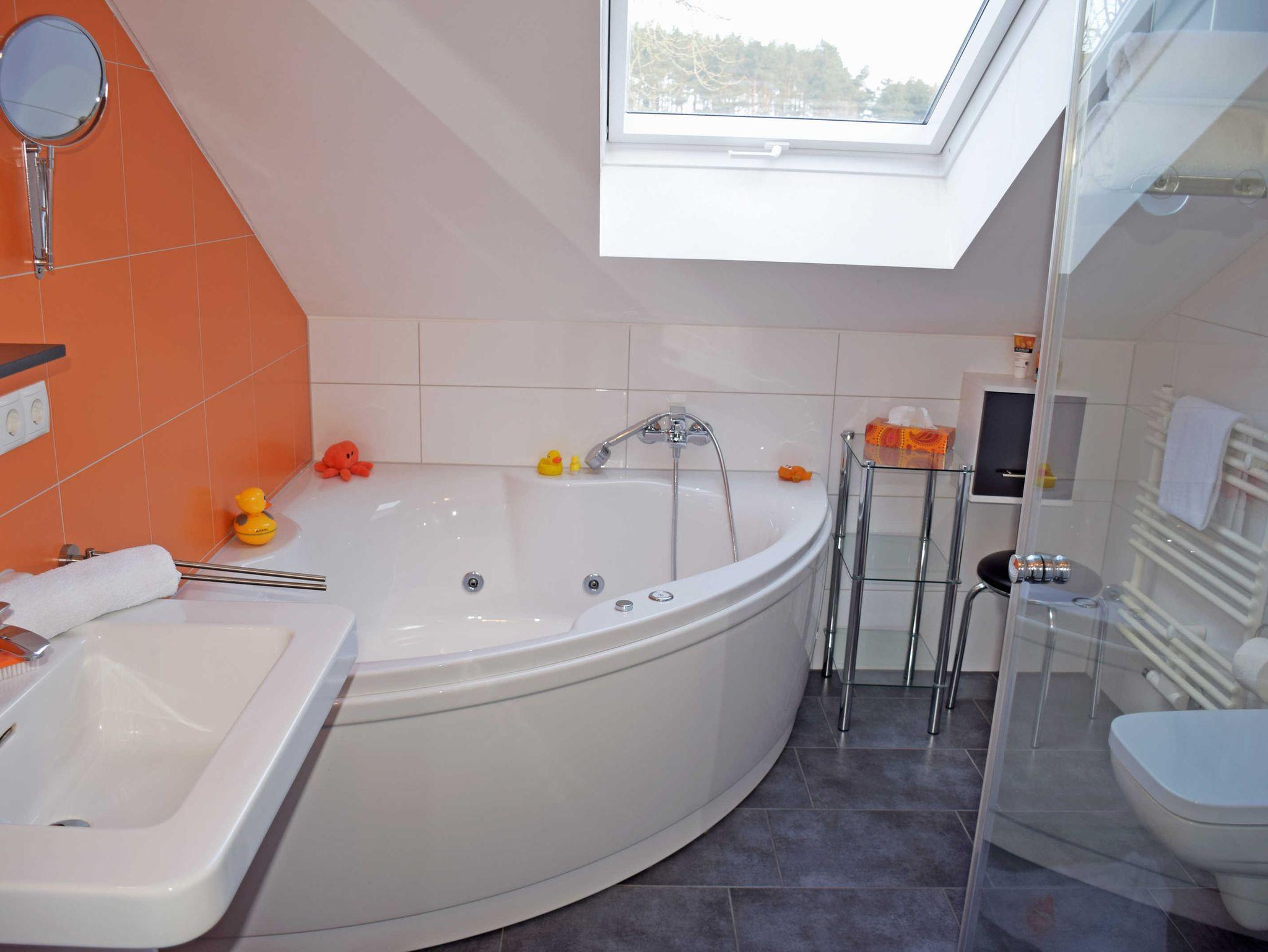 Das moderne Bad ist mit Dusche, Waschtisch, Whirl-Wanne, Handtuchtrockner und WC ausgestattet und verfügt - wie die gesamte Wohnung, über eine angenehme Fußbodenheizung.