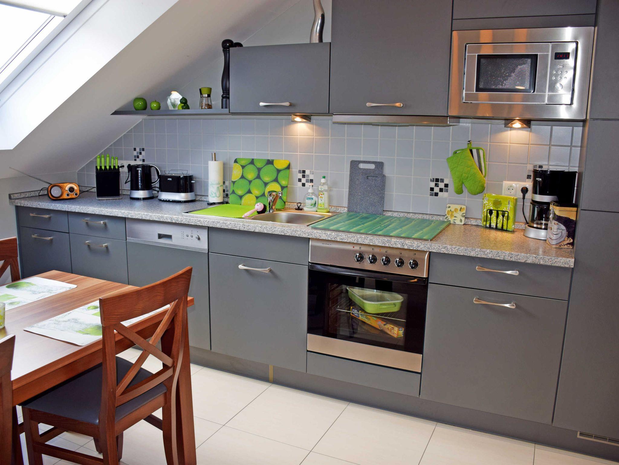 Die offene Küche ist mit Ceran-Herd, Backofen, Geschirrspüler, Kühlschrank, Mikrowelle, Kaffeemaschine, Wasserkocher und weiterem umfangreichem Zubehör komplett eingerichtet.
